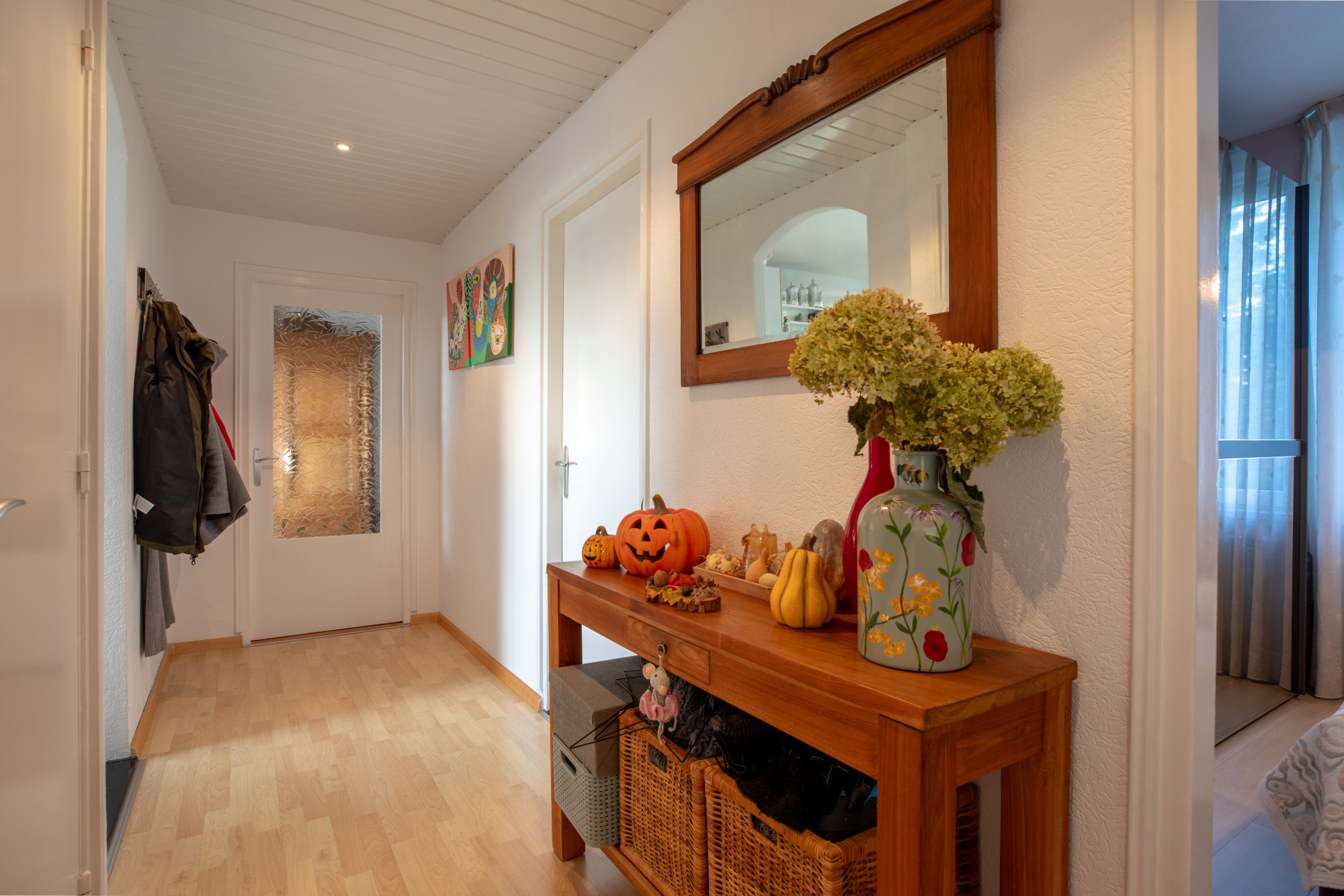 Entree met toegang tot de hal met doorlopende laminaat vloer en toiletruimte. Doorzon woonkamer (taps toelopend) met groot raampartij aan voorzijde met vrij panoramisch zicht; vanuit de woonkamer en keuken toegang tot het balkon aan voorzijde welke is voorzien van zonwering en rolluik aan woonkamer deur.