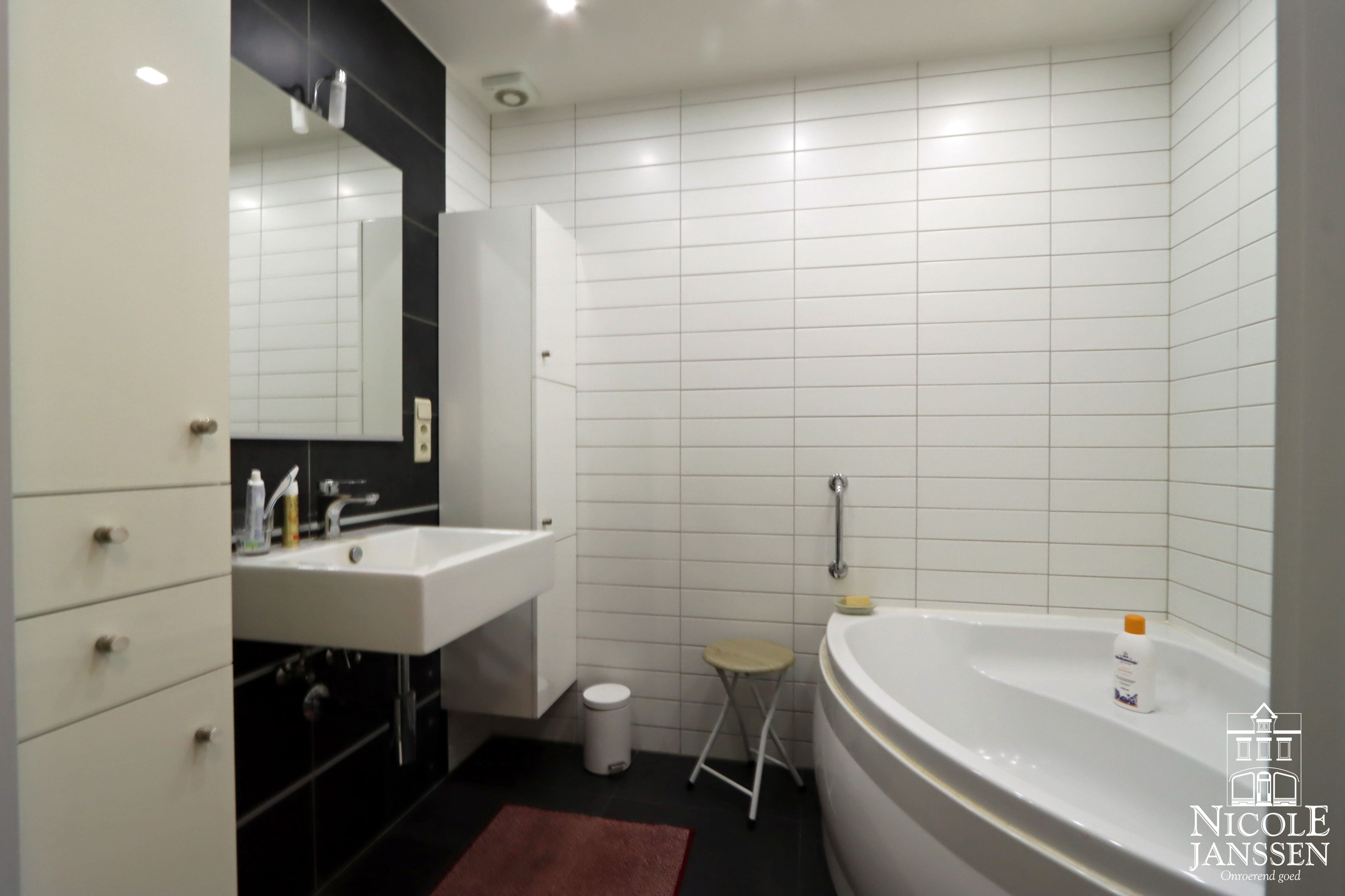 - Betegelde badkamer met ruim hoekbad met douchemogelijkheid en enkele wastafel met badkamermeubel