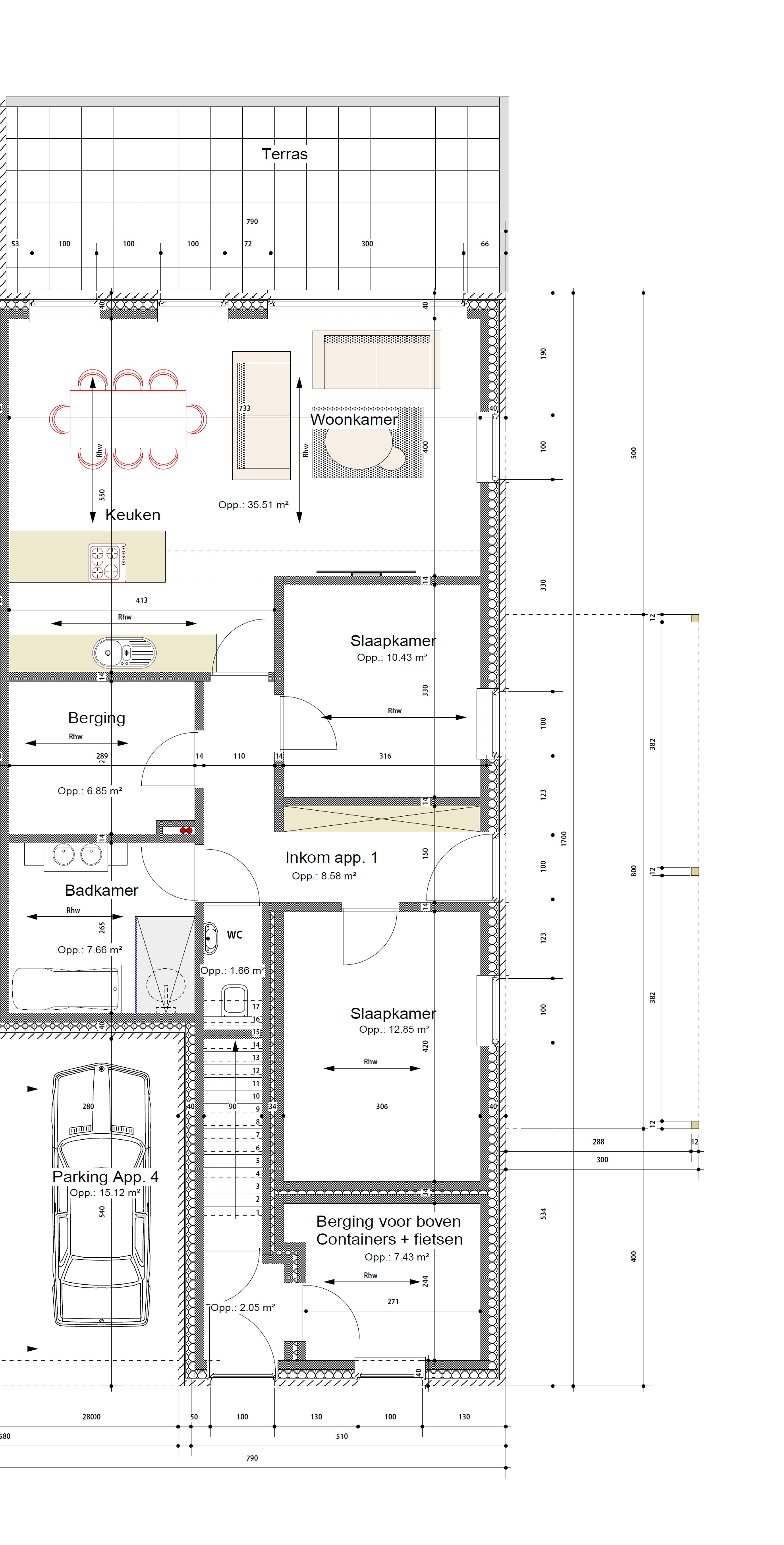 Gelijkvloers kan u via een aparte inkomhal het appartement betreden, waar u ruimte heeft voor een vestiaire of de mogelijkheid heeft fietsen te plaatsen. Via de trappen bereikt u de ruime leefruimte met open keuken op de eerste verdieping,