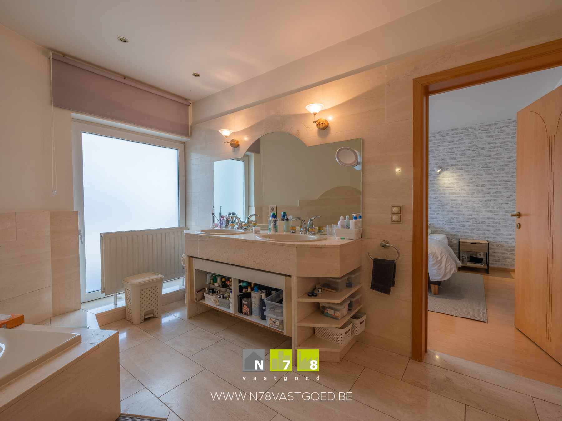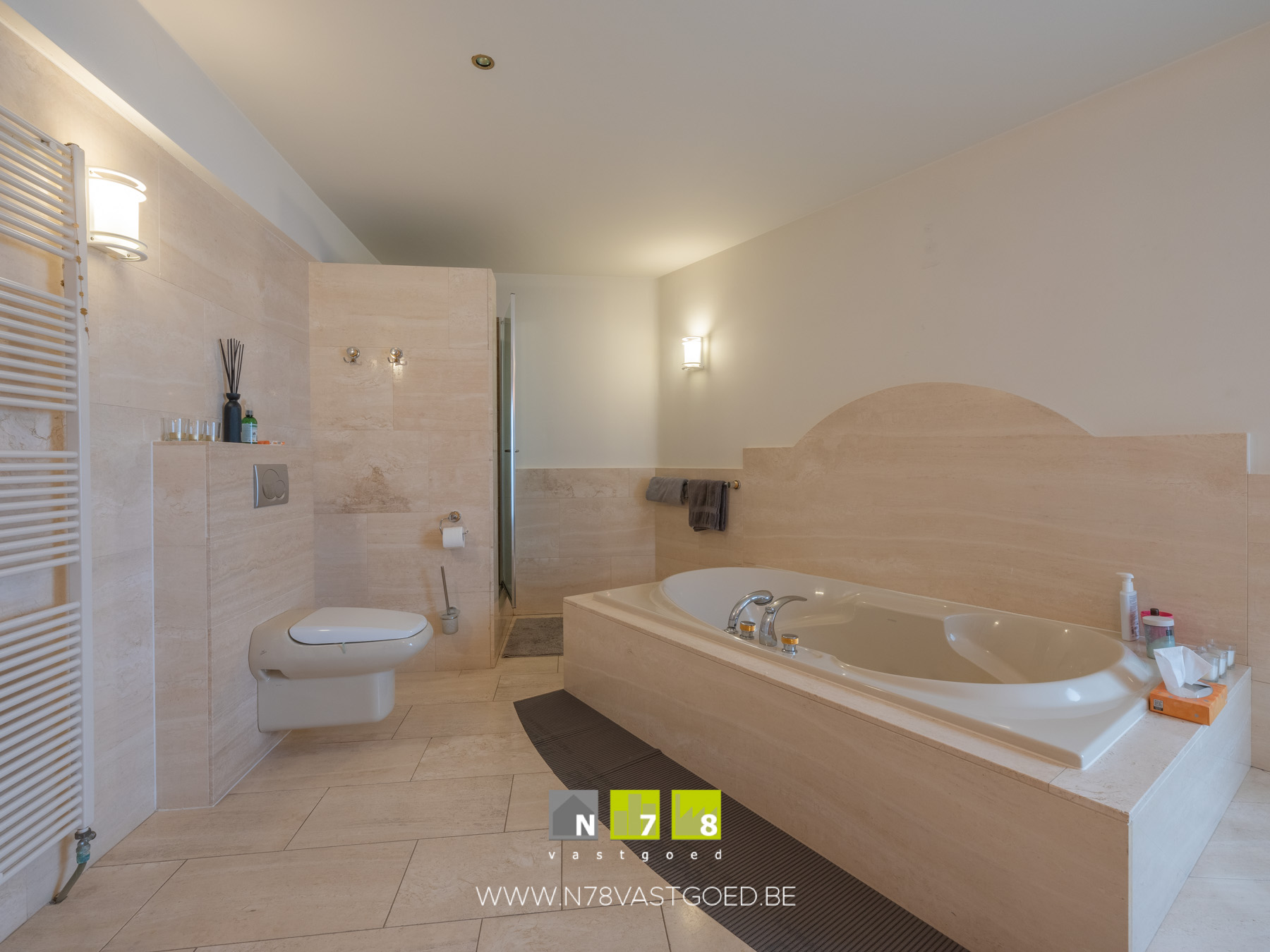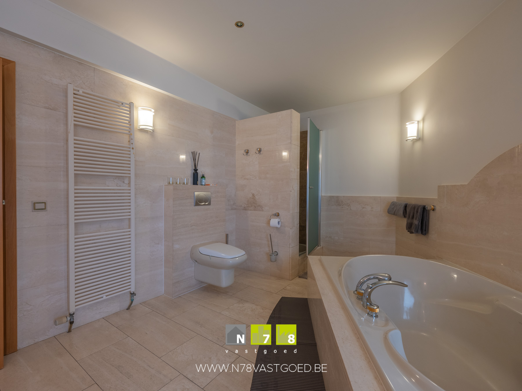- Badkamer (4,92m x 3,84m = 18,89m²): badmeubel met dubbele lavabo, ligbad, zittoilet, douche, inbouwspots, handdoekradiator, deels wandbetegeling, tegelvloer.