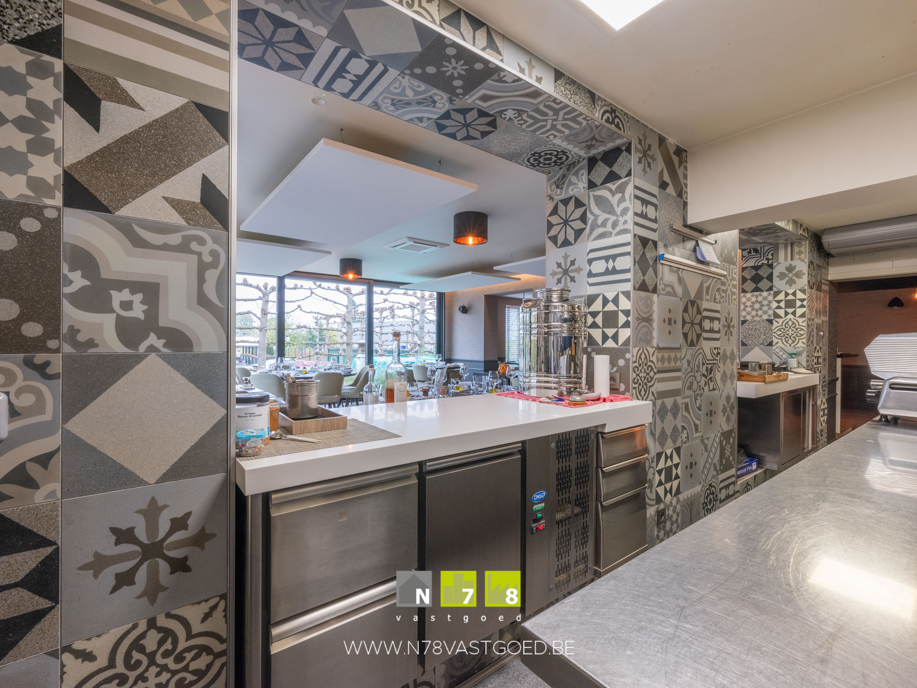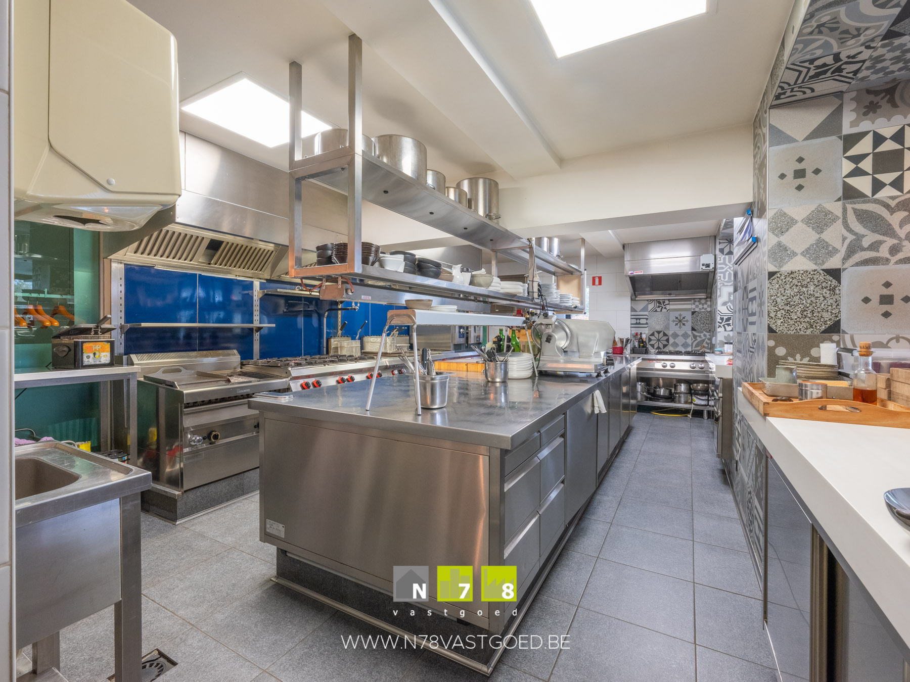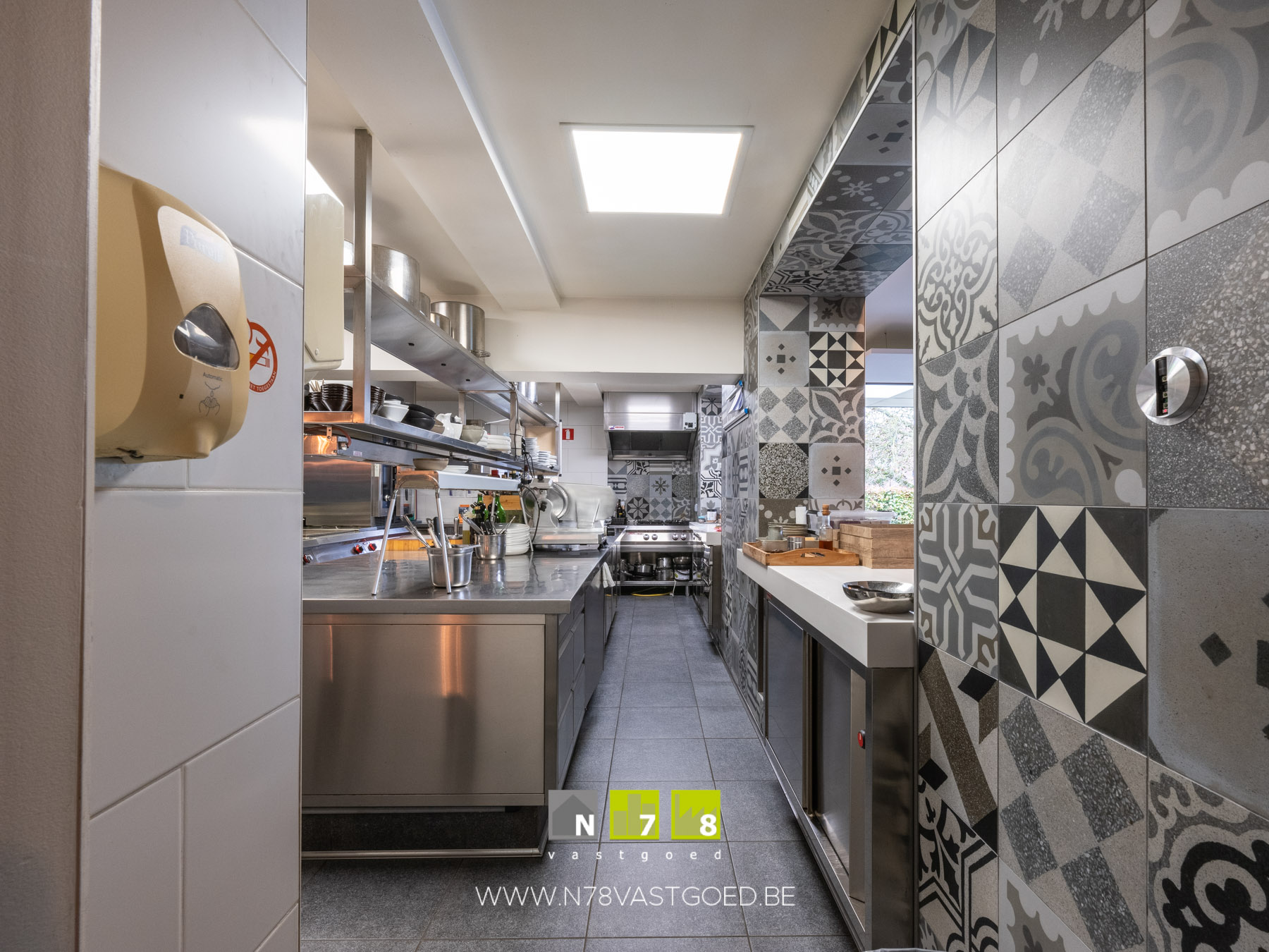 - Horecakeuken: volledig ingerichte professionele keuken, alle horeca apparatuur aanwezig, deels open keuken met zicht naar de serveerruimten, tegelvloer.