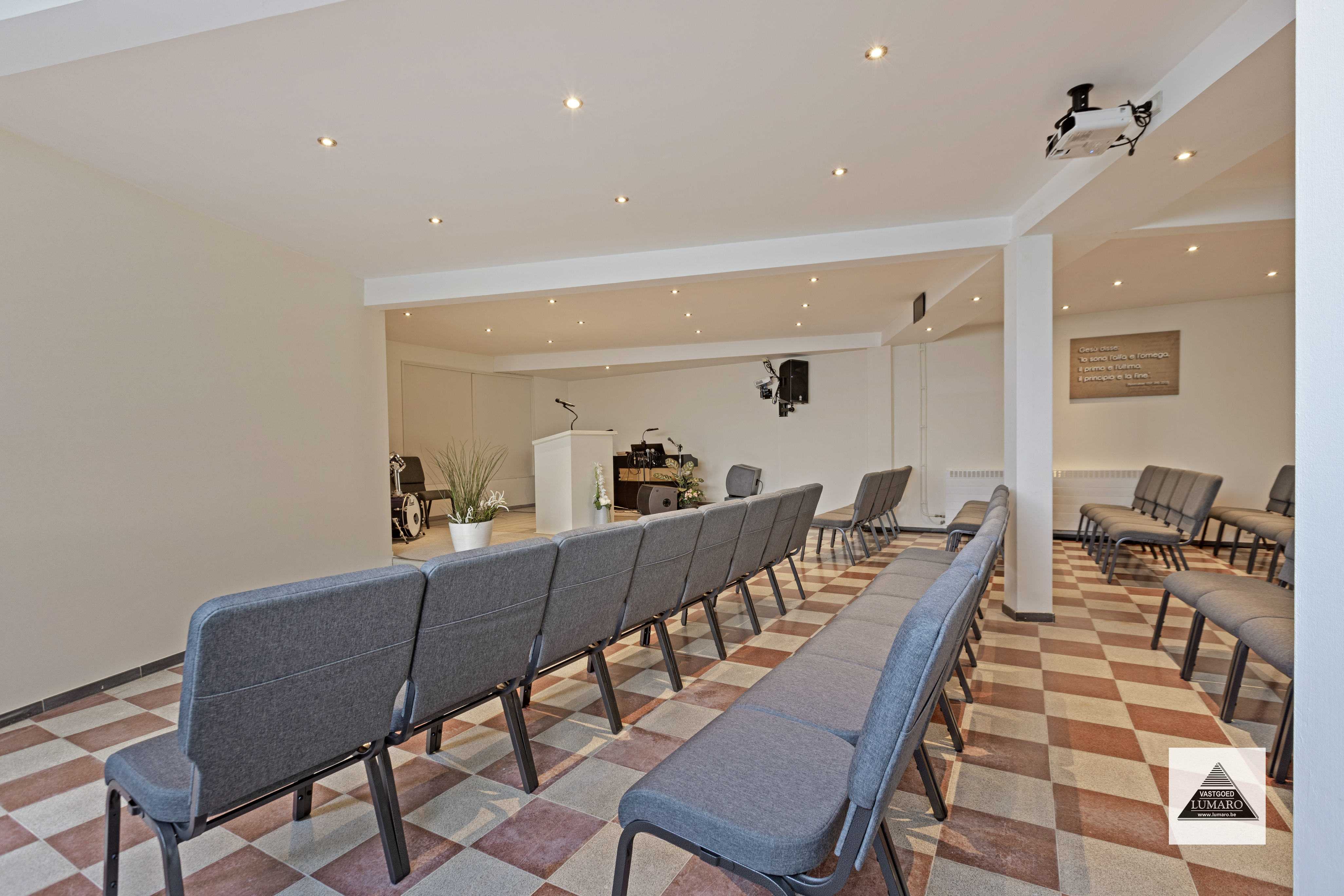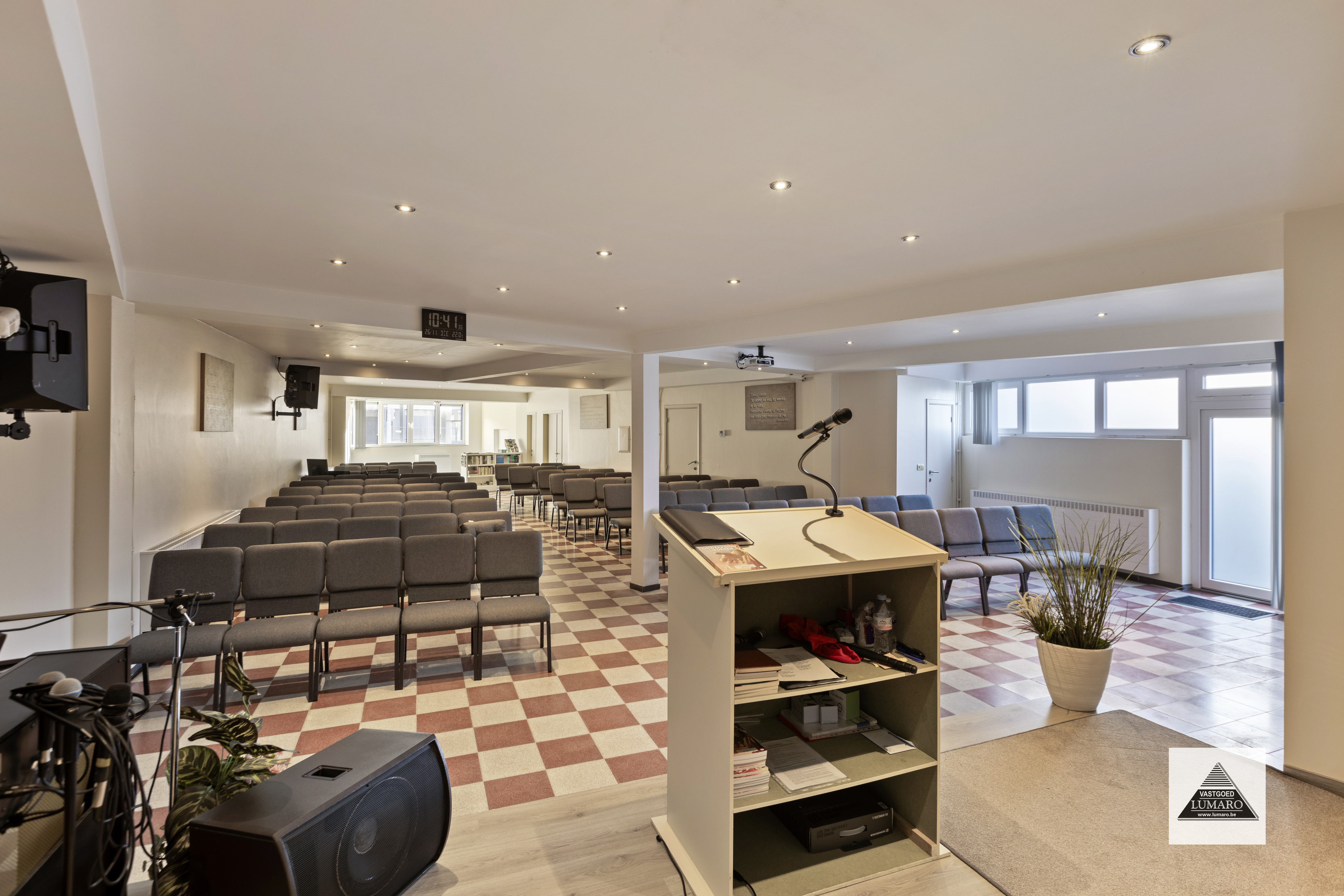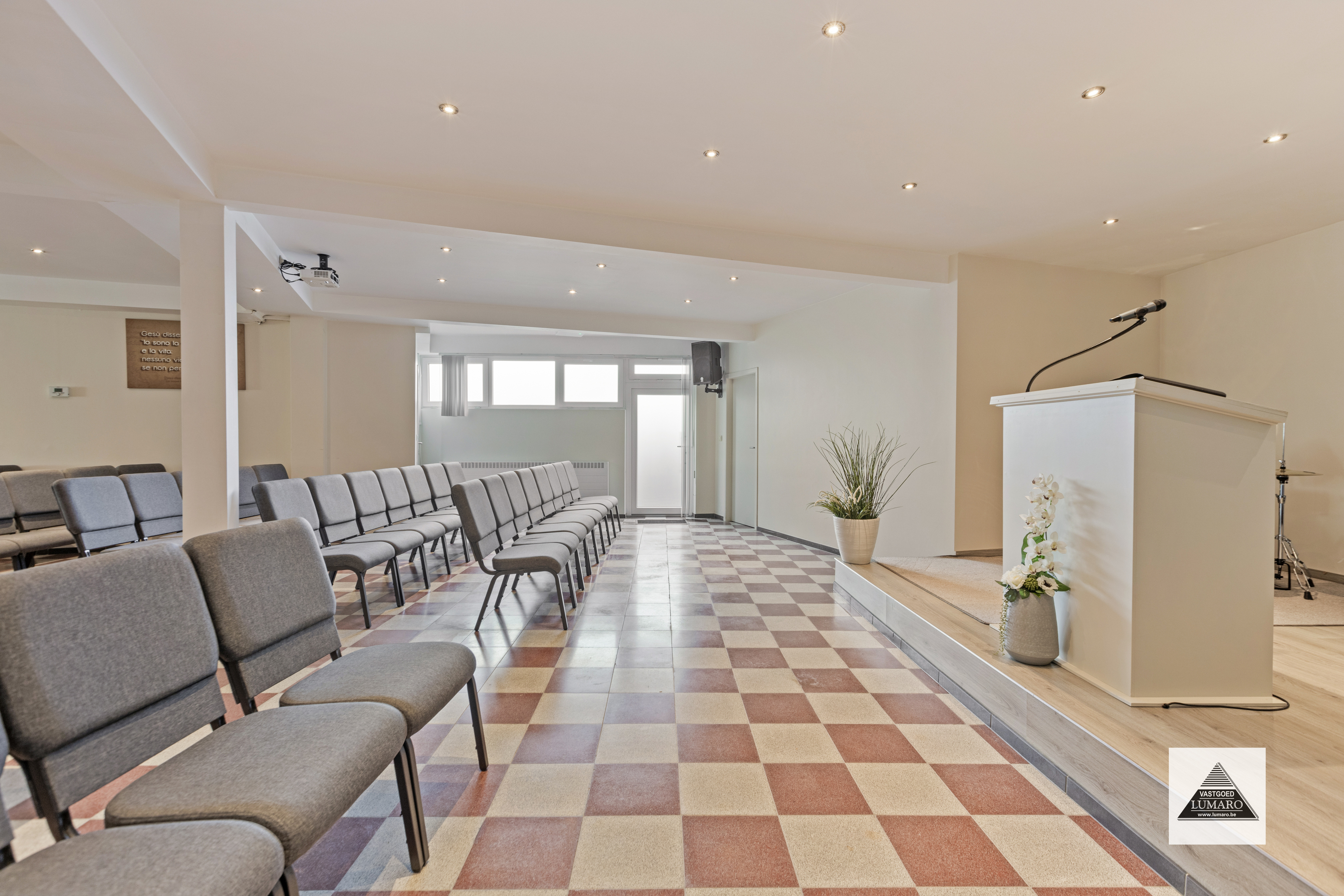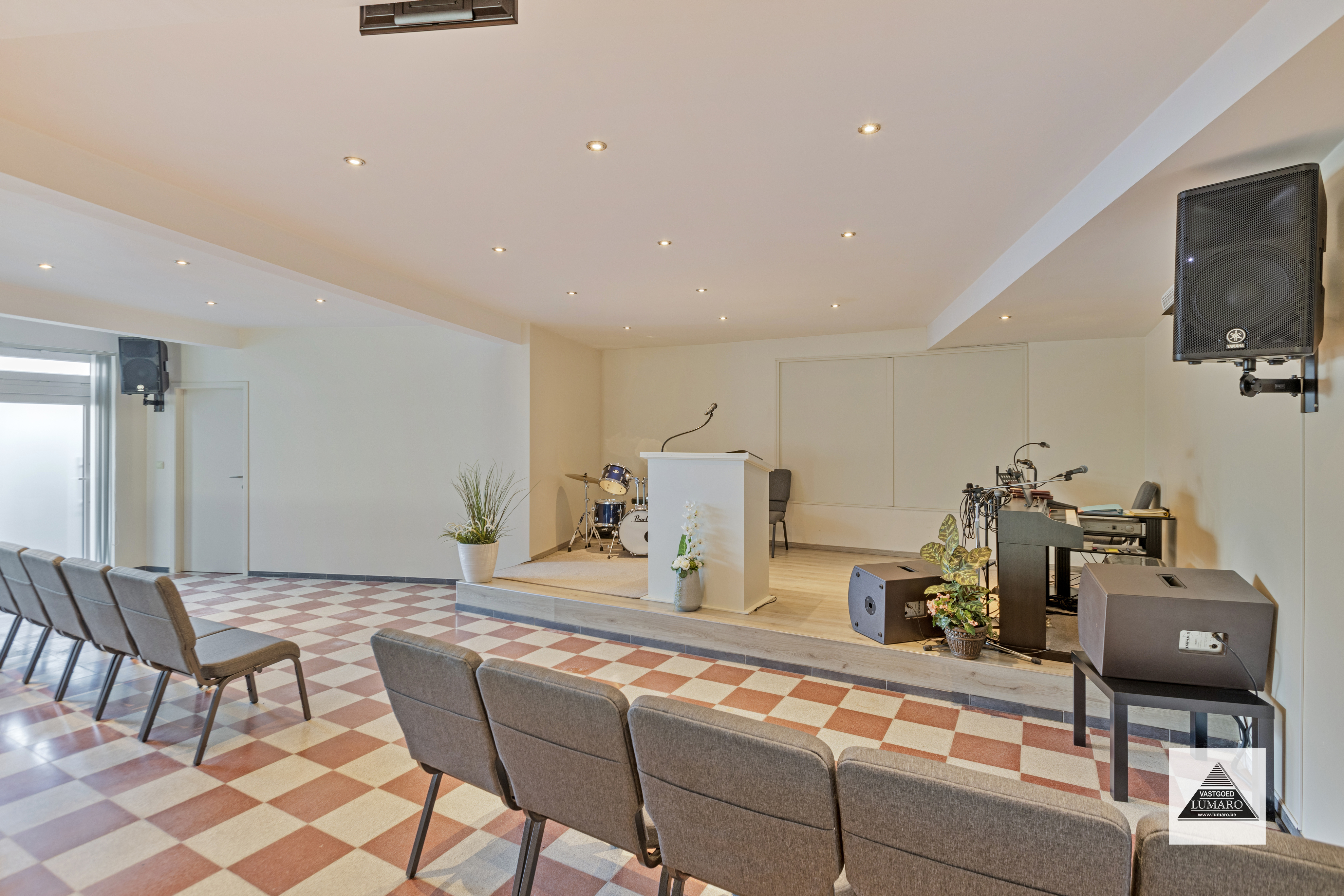 Het gelijkvloers heeft een grote handels- ruimte / showroom, een bureel / keuken, berging, 2 toiletten, berging met achterdeur. Tegelvloer.