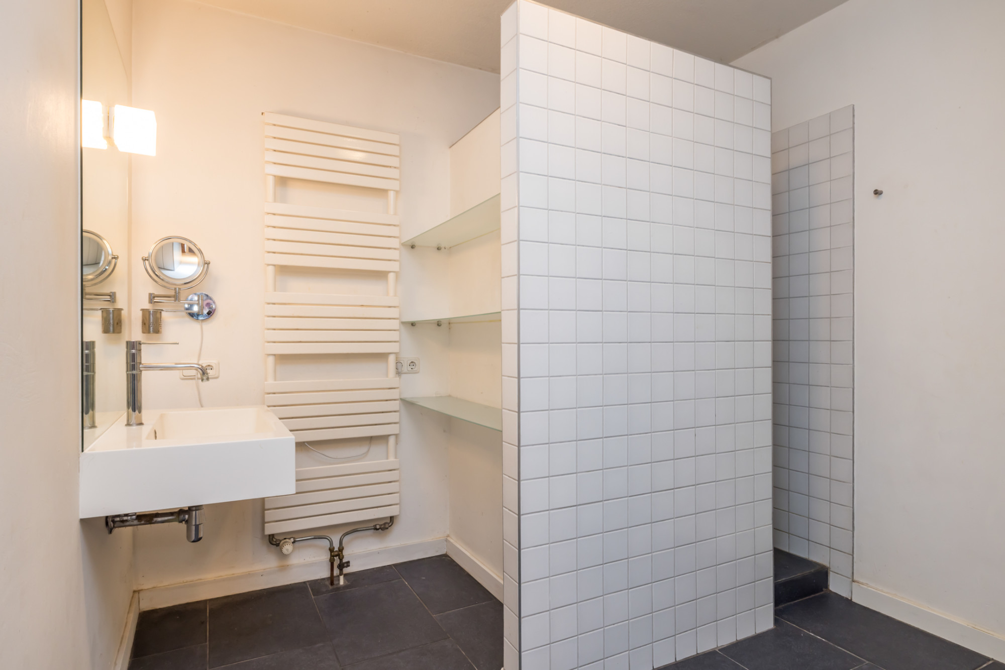 - badkamer 2.70x2.50 is voorzien van wastafel en inloopdouche, design wasbak, vaste kastenwand.