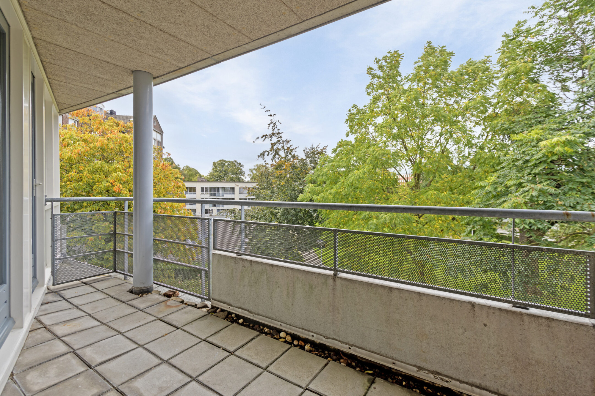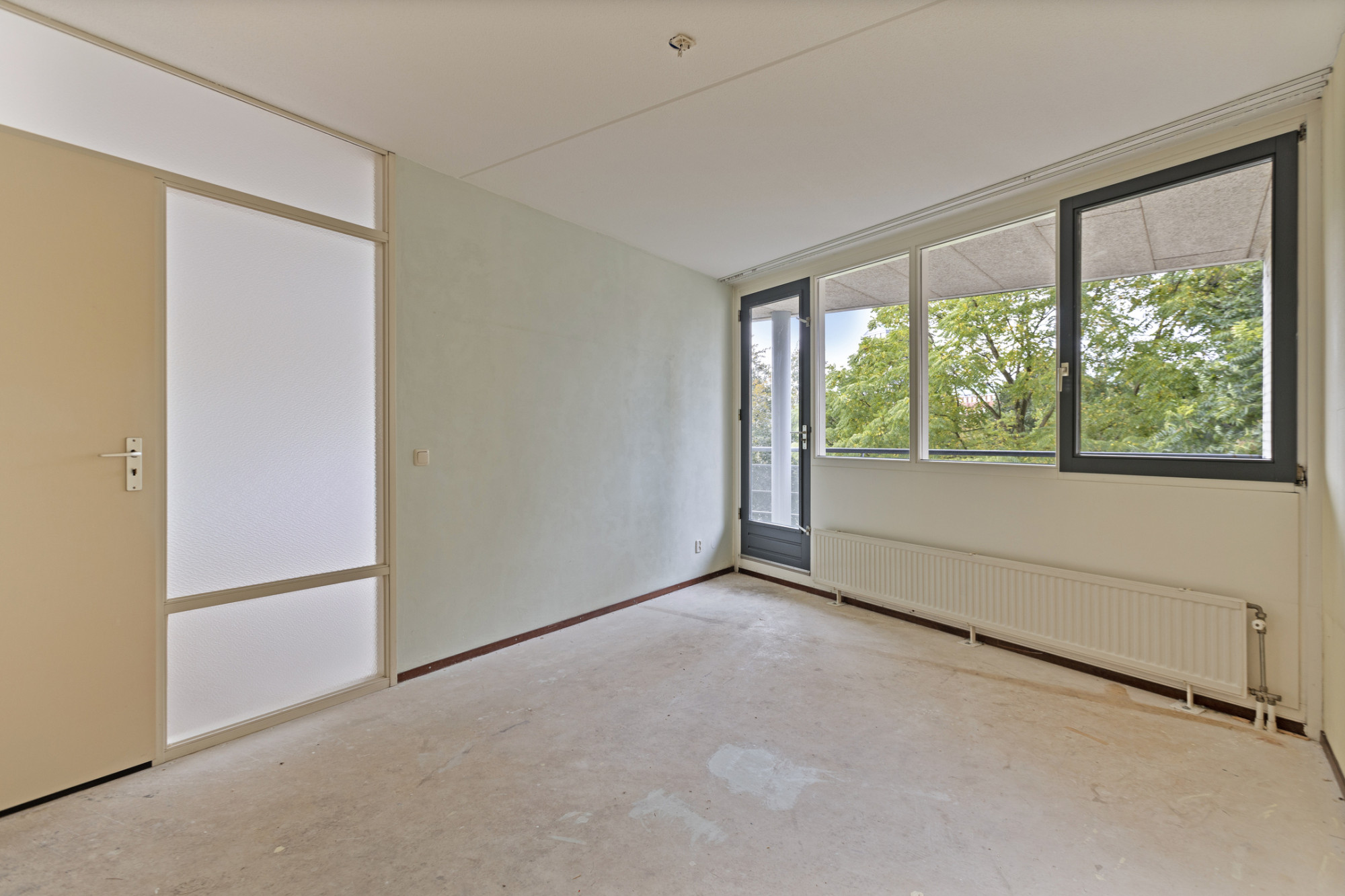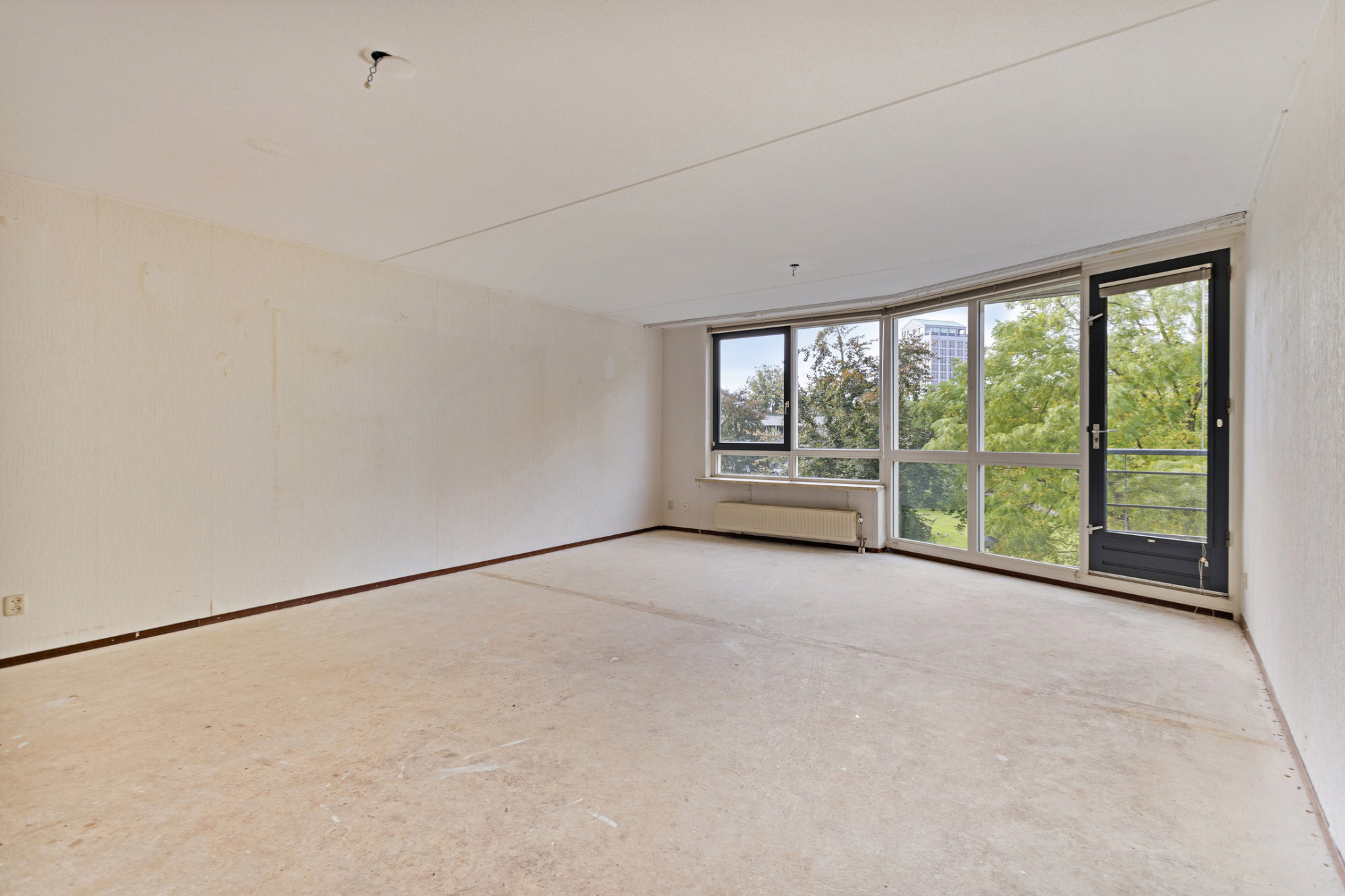 - Woonkamer met open keuken van totaal circa 42 m², uitzicht over het park en toegang tot het balkon van ca. 8 m².