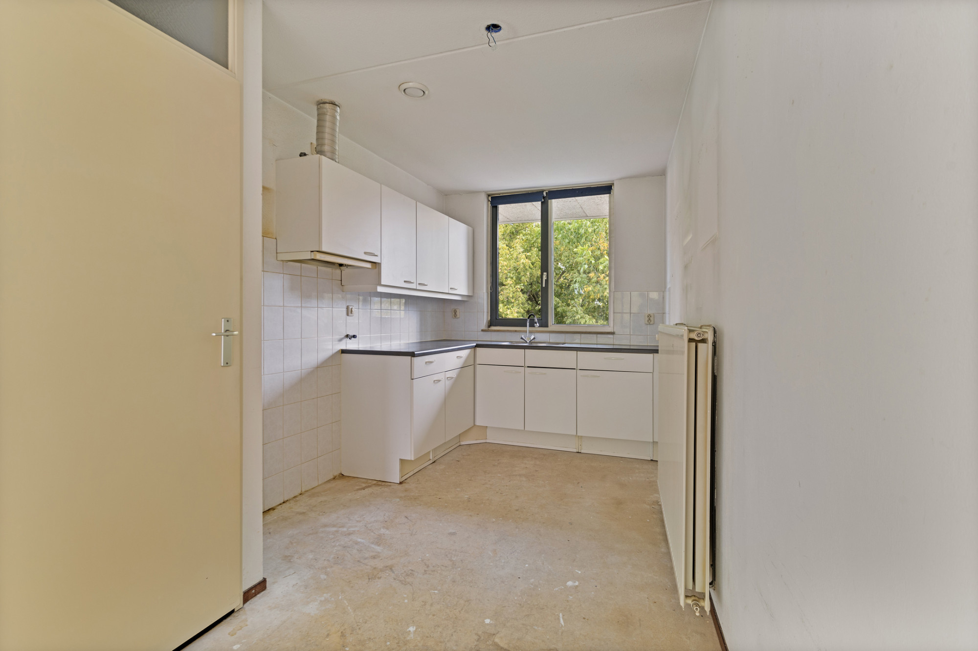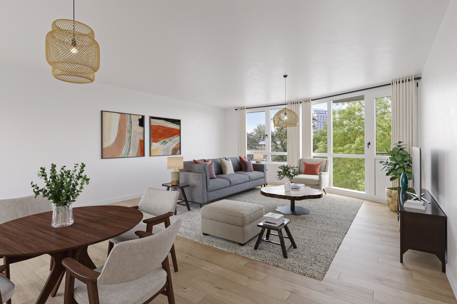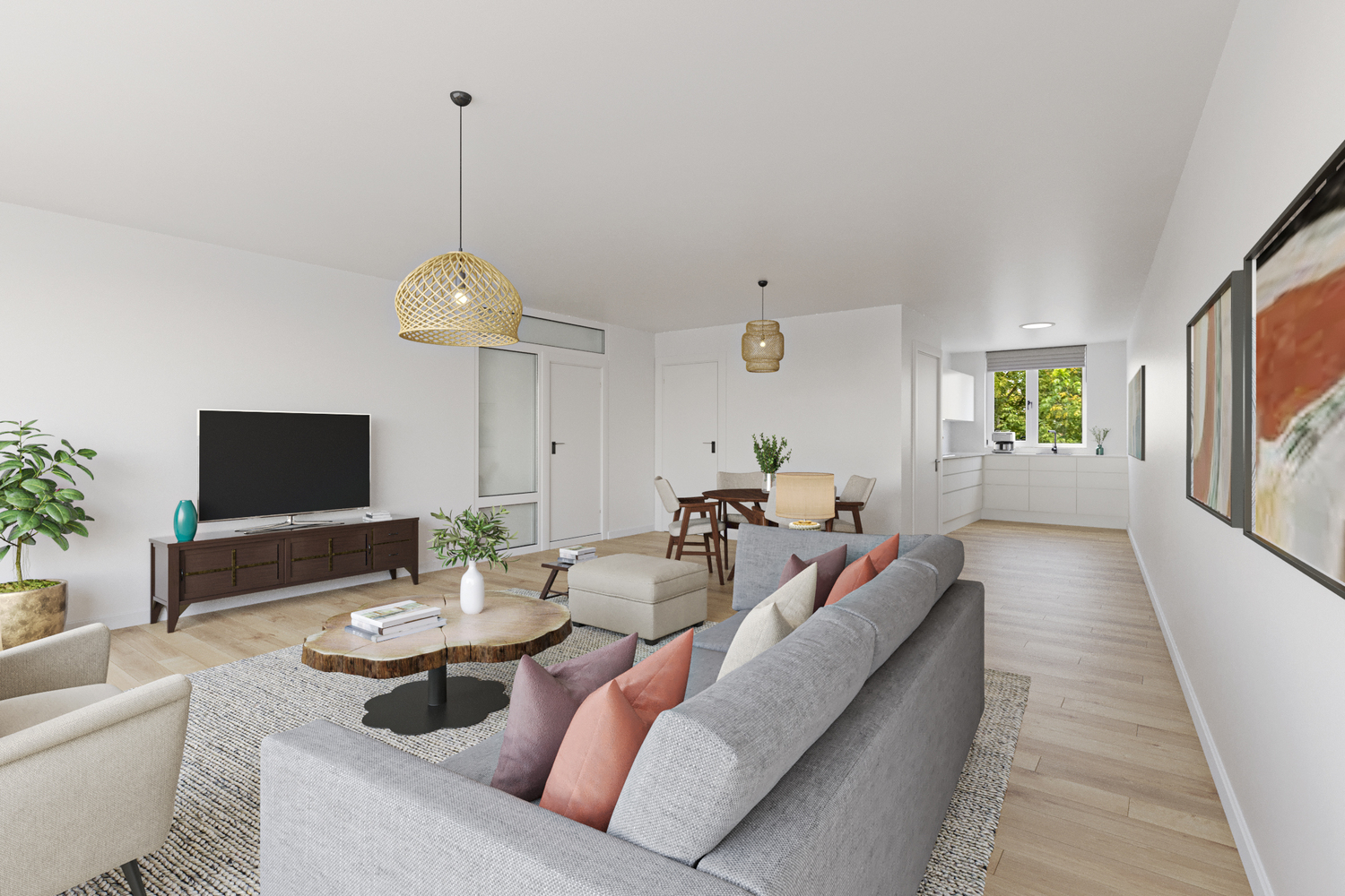 - Woonkamer met open keuken van totaal circa 42 m², uitzicht over het park en toegang tot het balkon van ca. 8 m².