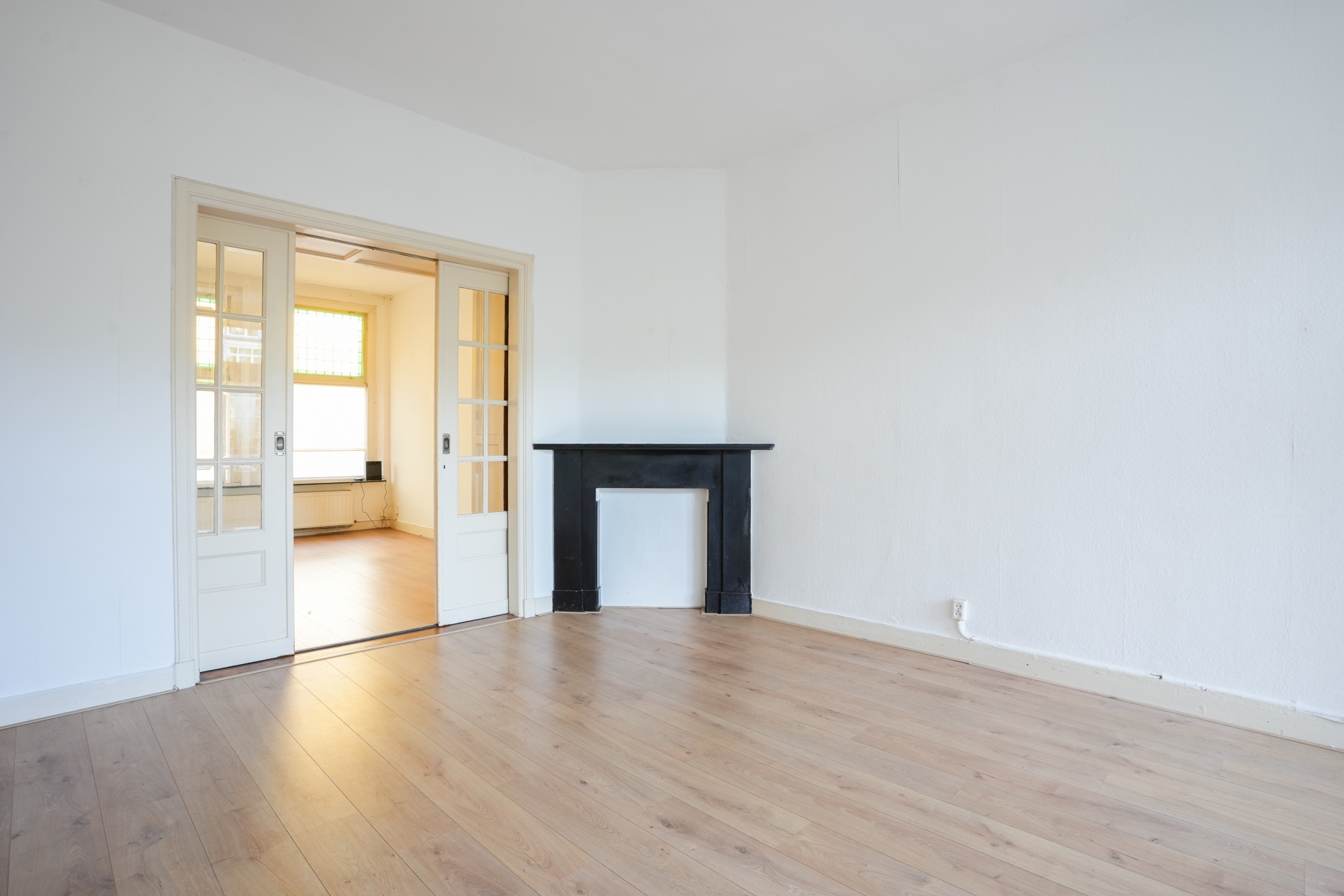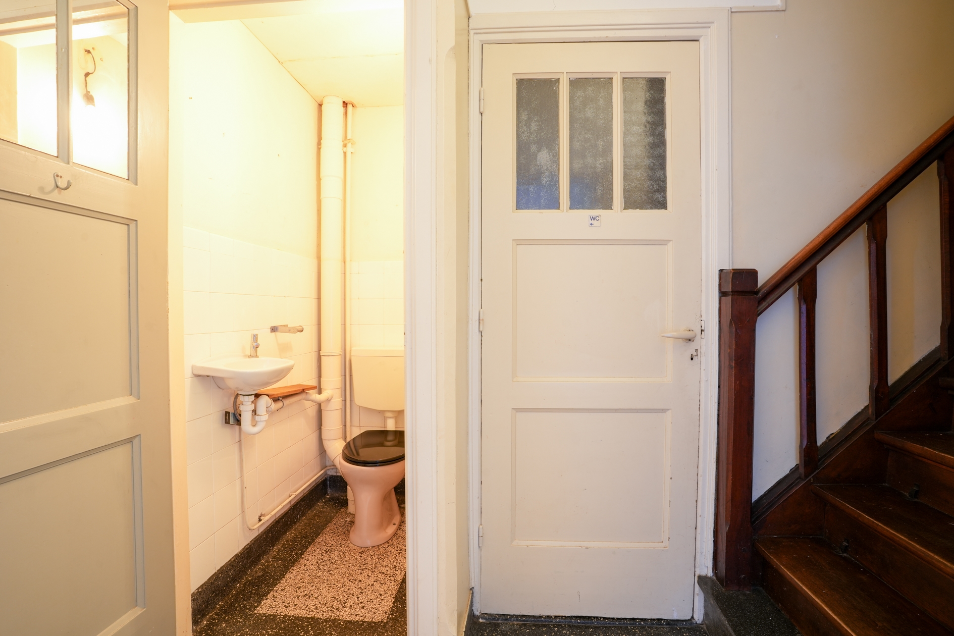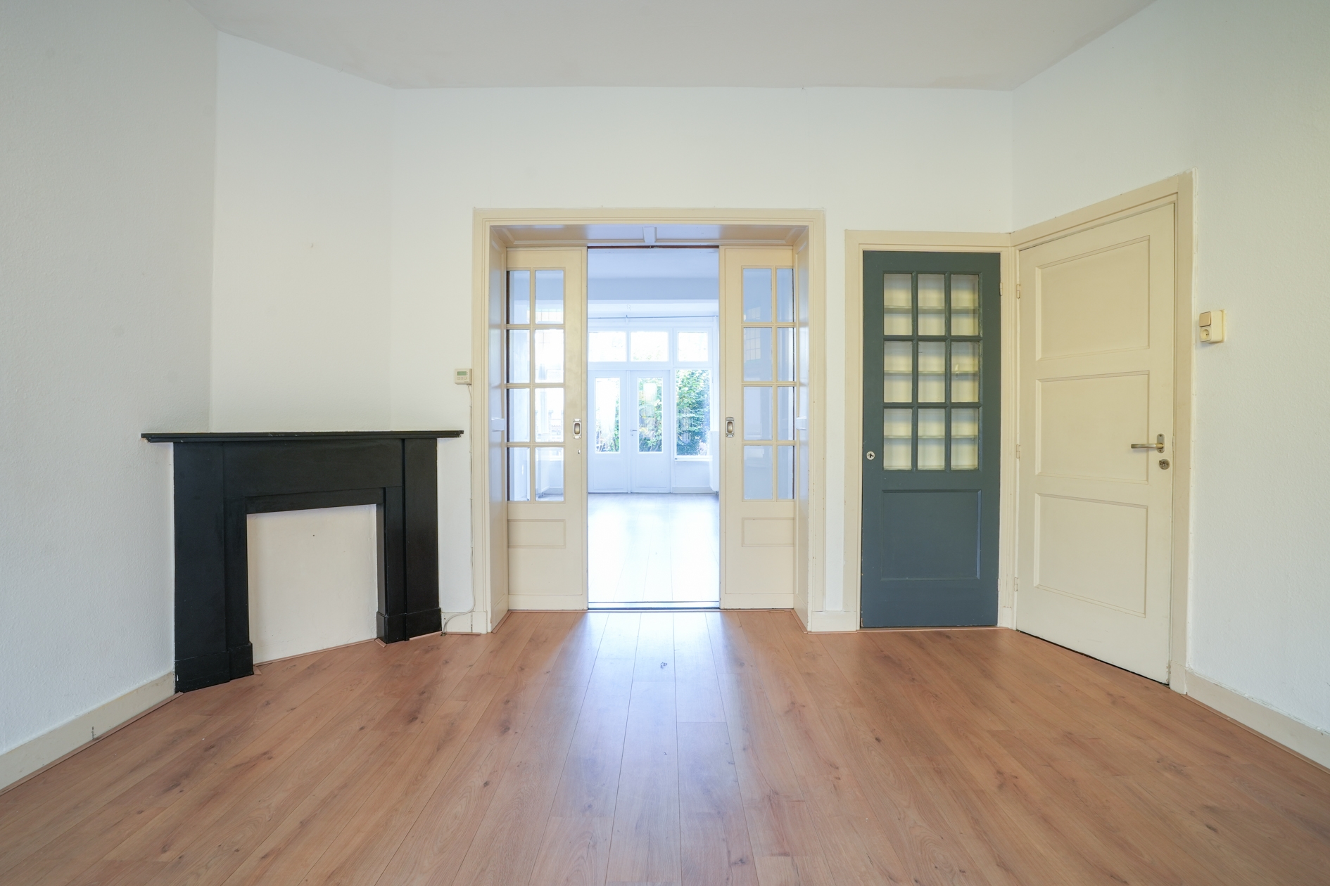 Bij binnenkomst in de hal wordt direct de authentieke sfeer van het huis duidelijk door de aanwezige terrazzovloer. Vanuit de hal is er toegang tot de woonkamer, de keuken, en de eenvoudige toiletruimte met staand toilet en fonteintje. De ruime woonkamer-en-suite heeft een sfeervolle erker, originele schuifdeuren, een inbouwkast, twee hardstenen schouwen en is voorzien van een laminaatvloer. Openslaande deuren geven toegang tot de tuin.