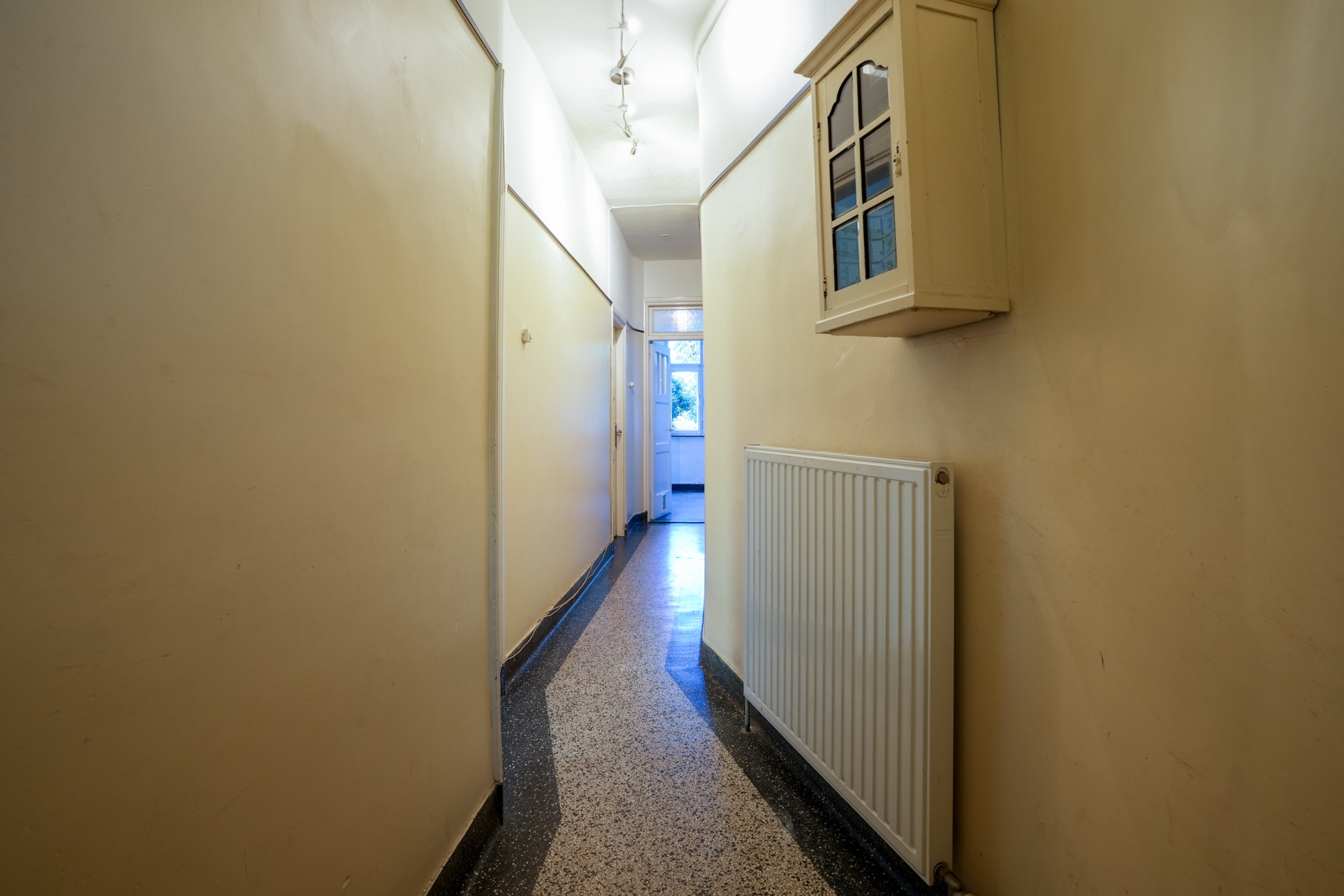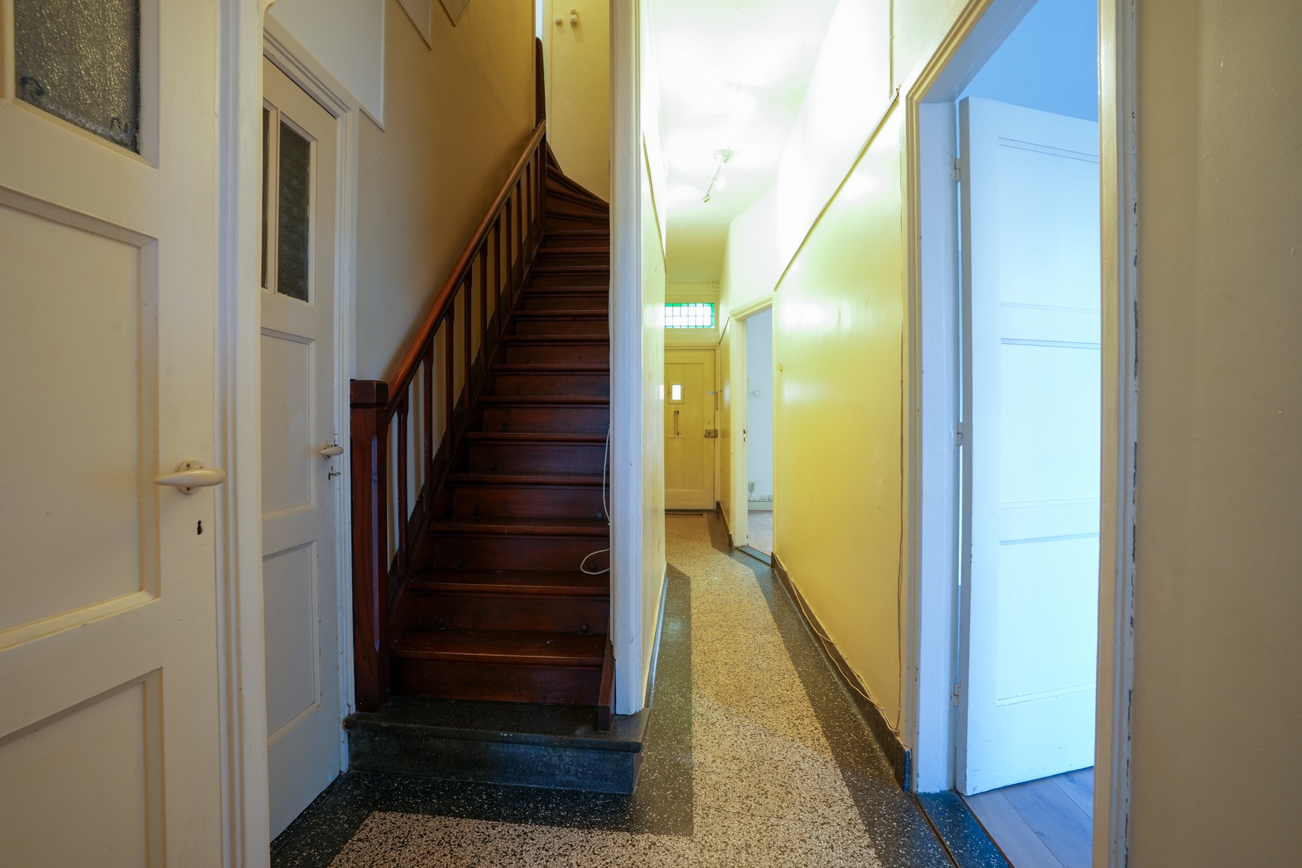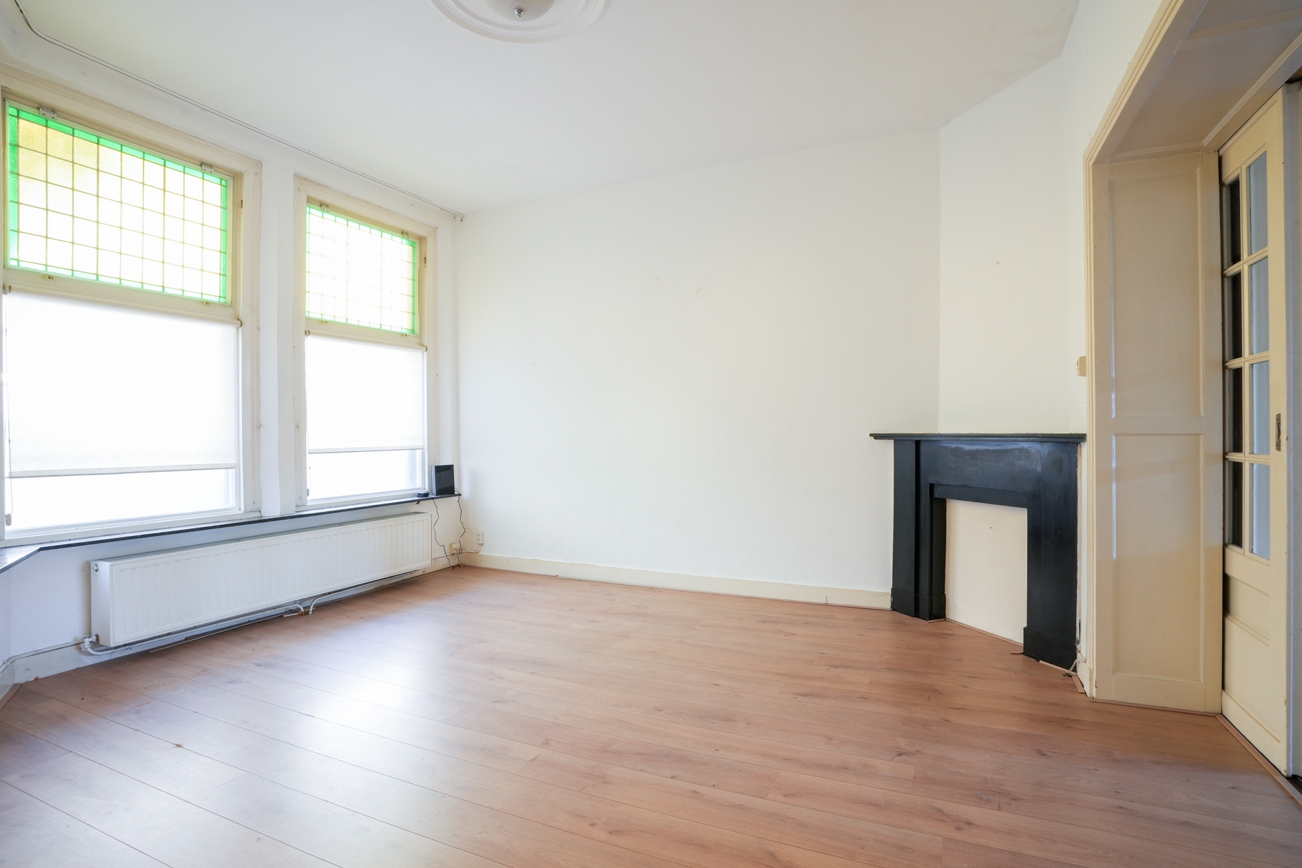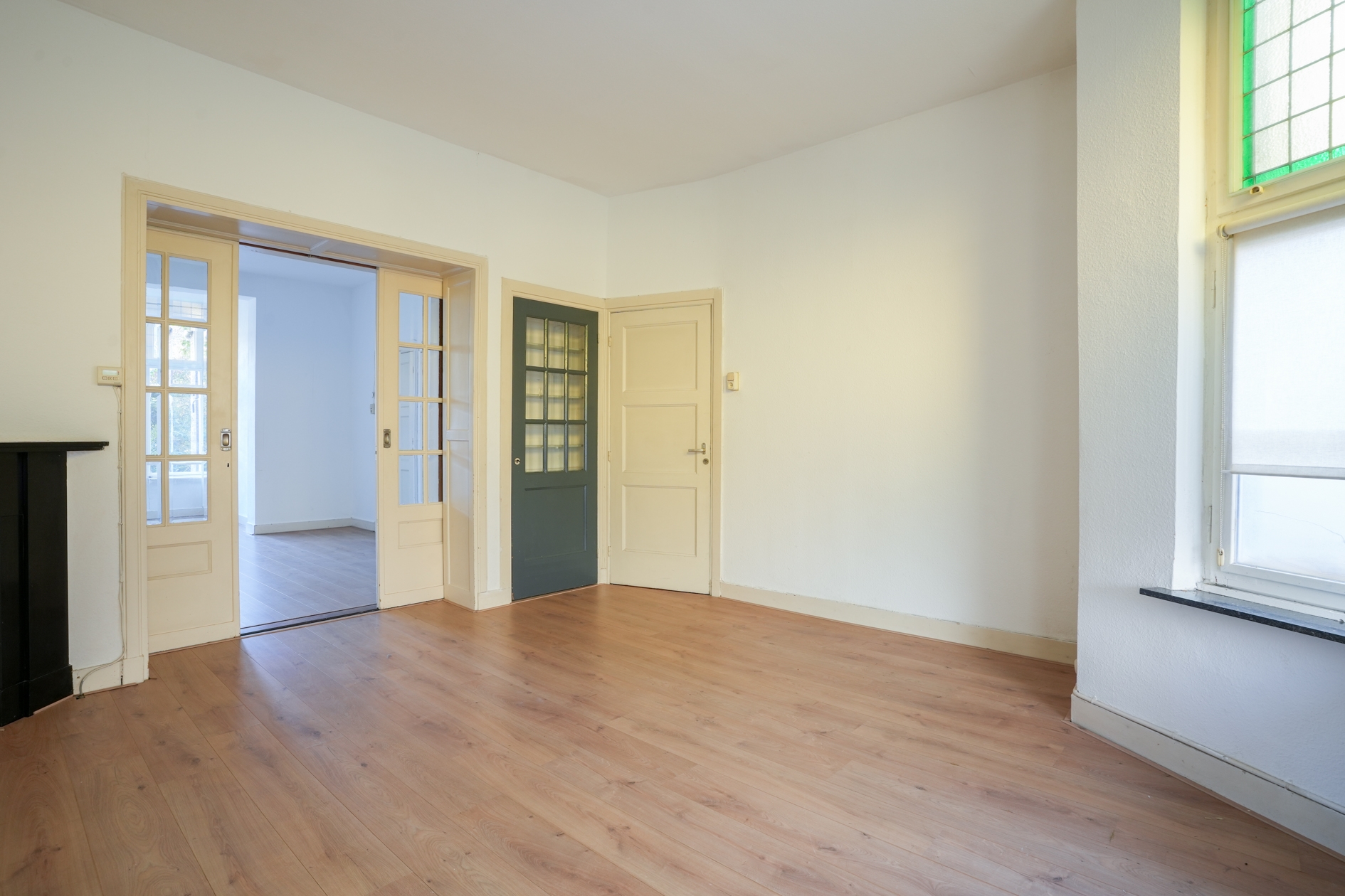 Bij binnenkomst in de hal wordt direct de authentieke sfeer van het huis duidelijk door de aanwezige terrazzovloer. Vanuit de hal is er toegang tot de woonkamer, de keuken, en de eenvoudige toiletruimte met staand toilet en fonteintje. De ruime woonkamer-en-suite heeft een sfeervolle erker, originele schuifdeuren, een inbouwkast, twee hardstenen schouwen en is voorzien van een laminaatvloer. Openslaande deuren geven toegang tot de tuin.