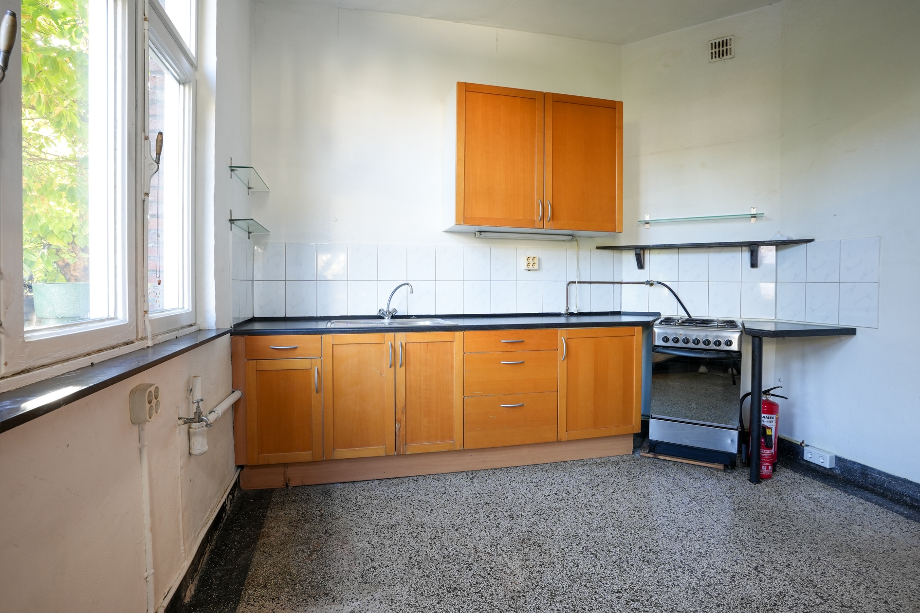 De gesloten keuken met een eenvoudig keukenblok en muurkast is uitsluitend te bereiken vanuit de gang. Ook vanuit de keuken heeft men toegang tot de tuin.