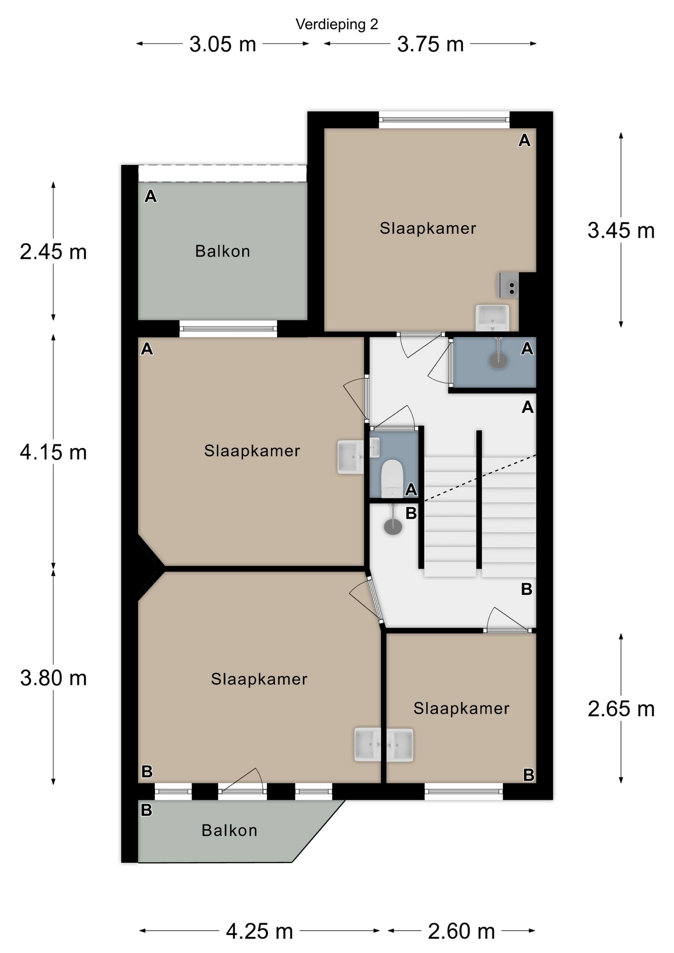 De tweede verdieping beschikt over twee ruime slaapkamers en een toiletruimte met staand toilet en fonteintje. Slaapkamer 1 (ca. 13 m²) is gelegen aan de achterzijde van de woning. In deze kamer hangt ook de warmwater boiler. Slaapkamer 2 (ca. 17 m²) is gelegen in het midden van de woning. Beiden slaapkamers zijn voorzien van een wastafel. Ook bevindt zich op deze verdieping de douche welke vanuit de hal te betreden is.