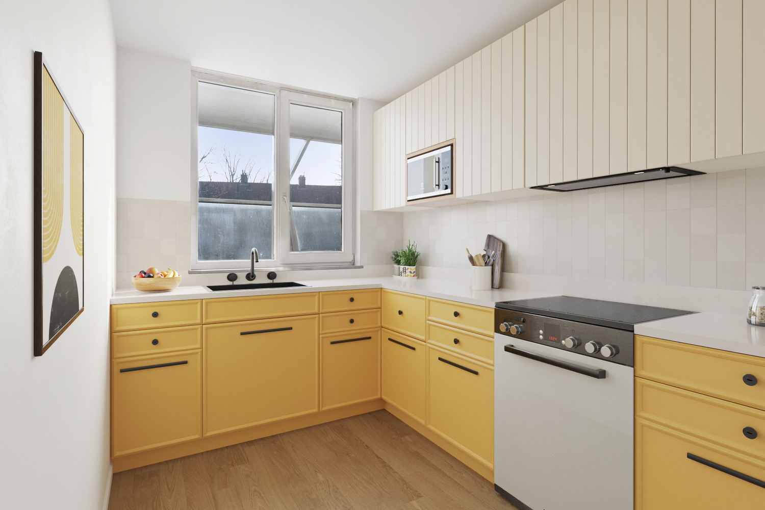 Er is sprake van een eenvoudige witte keukenopstelling met een wit betegelde achterwand.