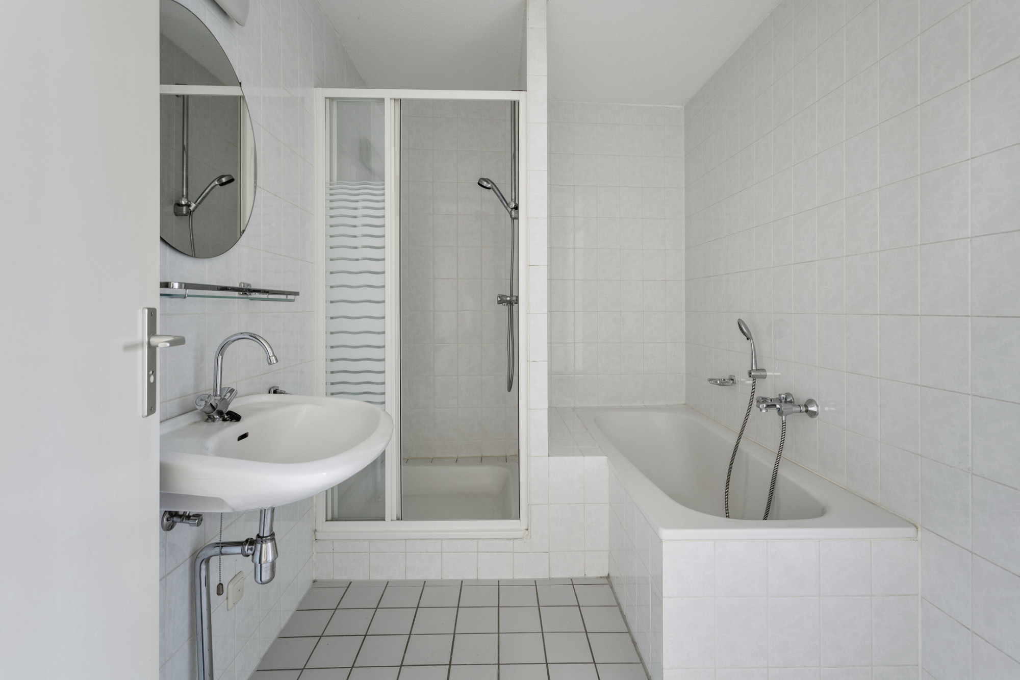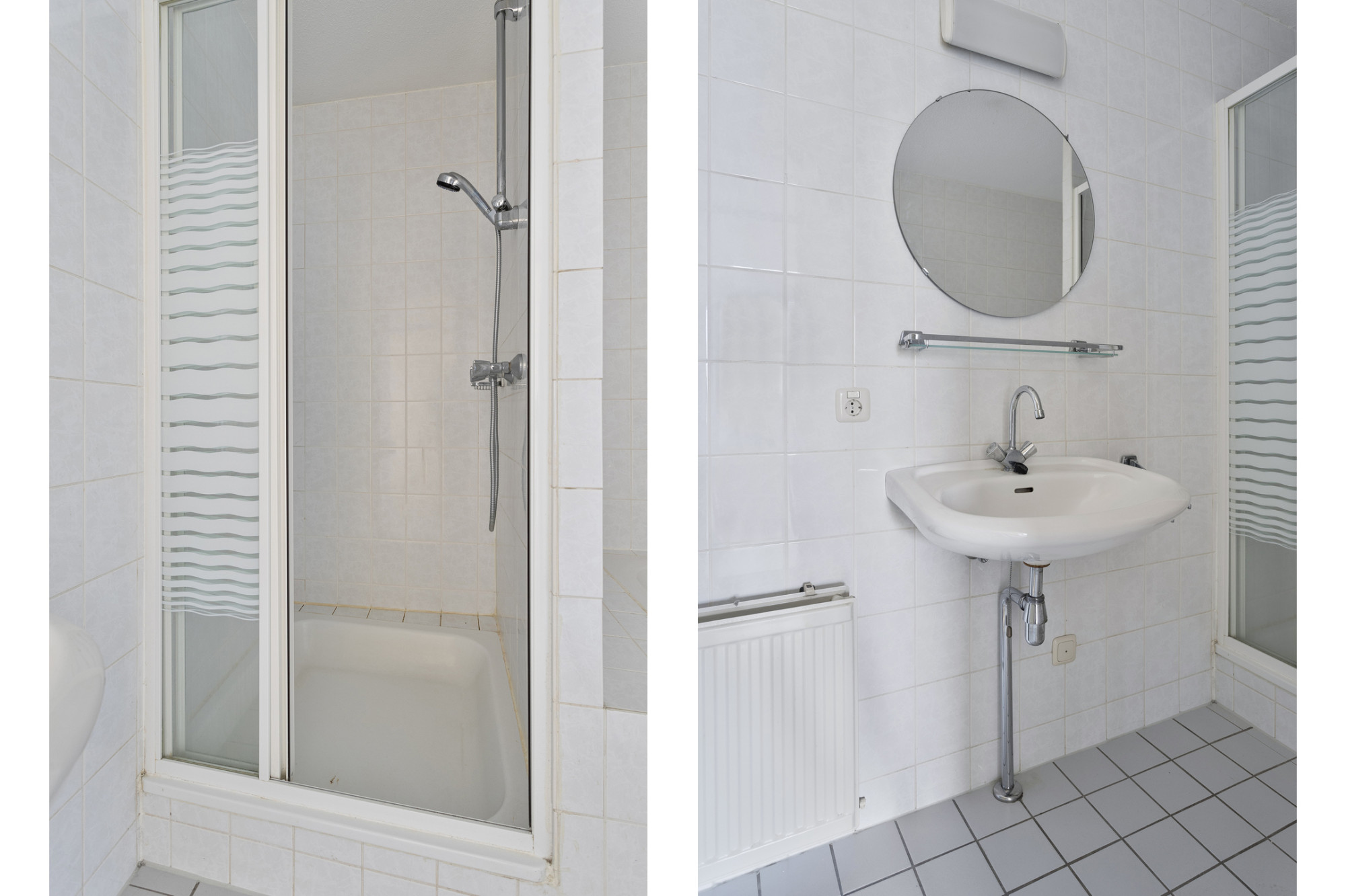 - Wit betegelde badkamer van circa 6 m² met douche, ligbad en wastafel.
