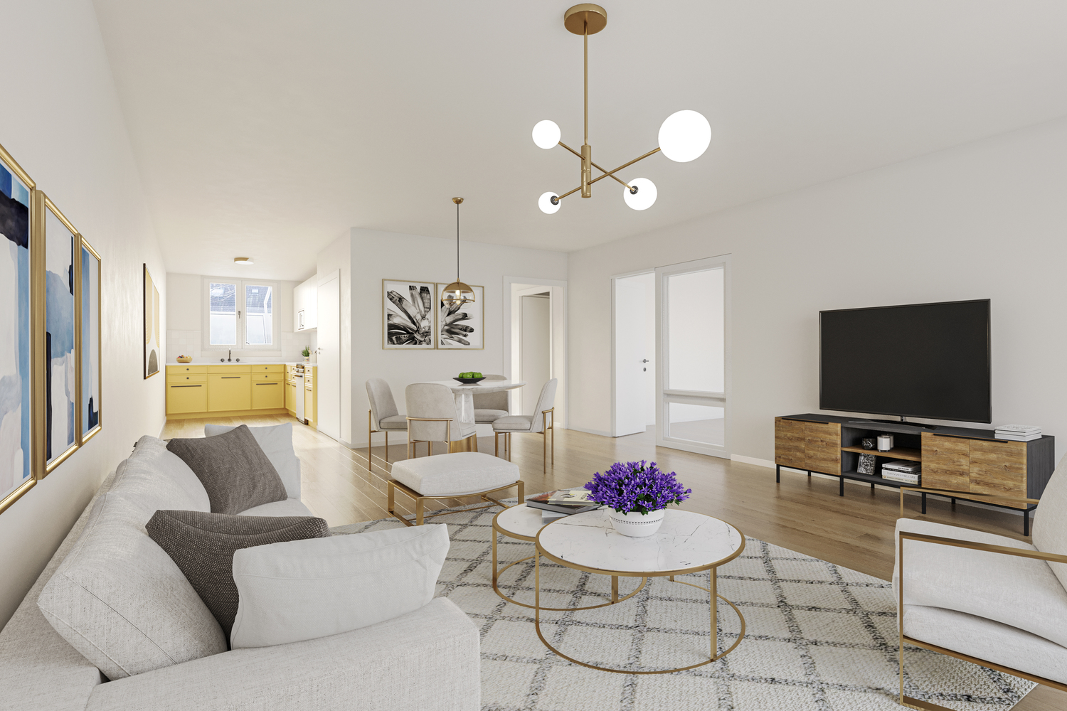 - Woonkamer met open keuken van totaal circa 40 m² met openslaande deuren naar de loggia van circa 8 m².