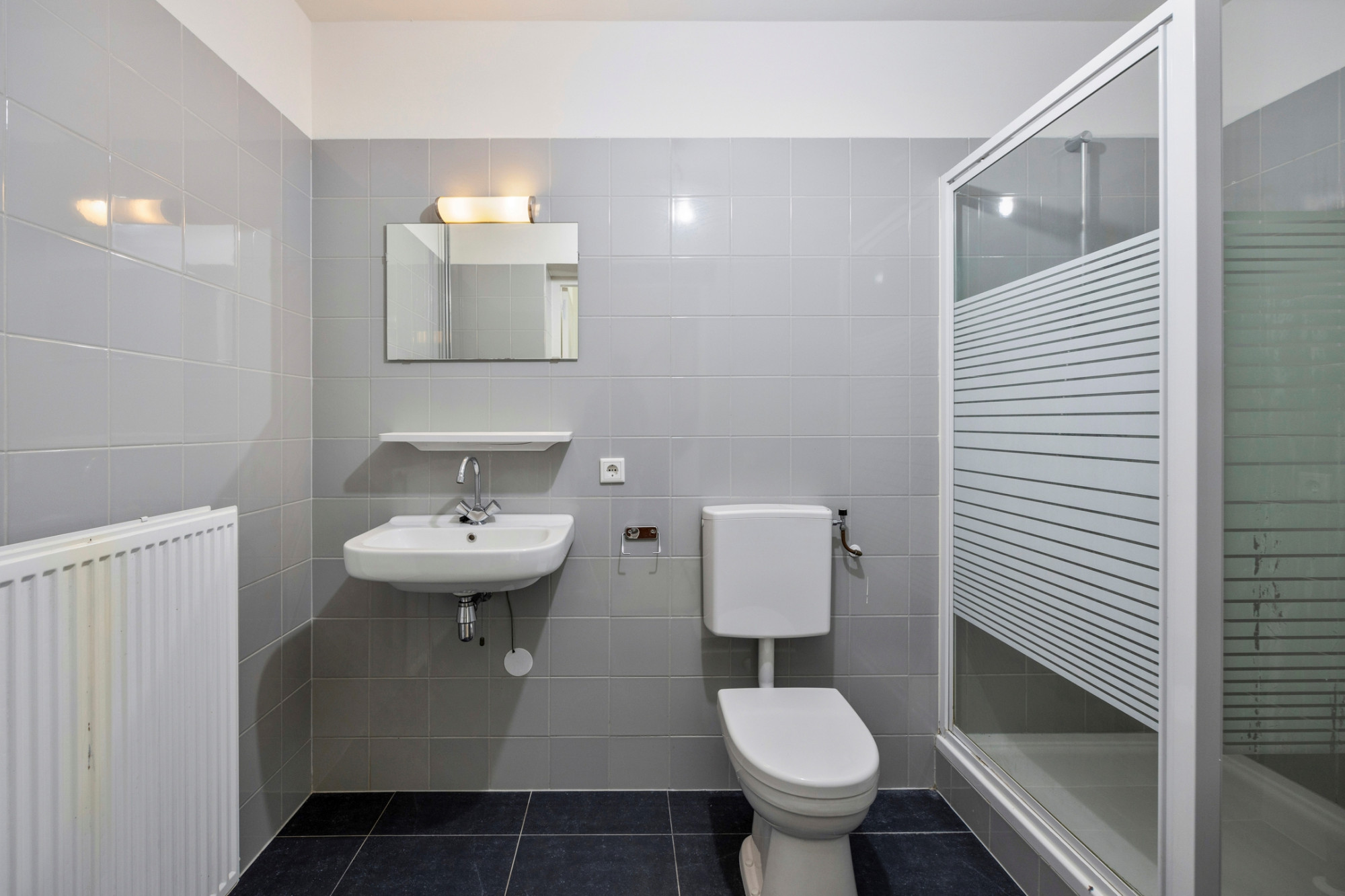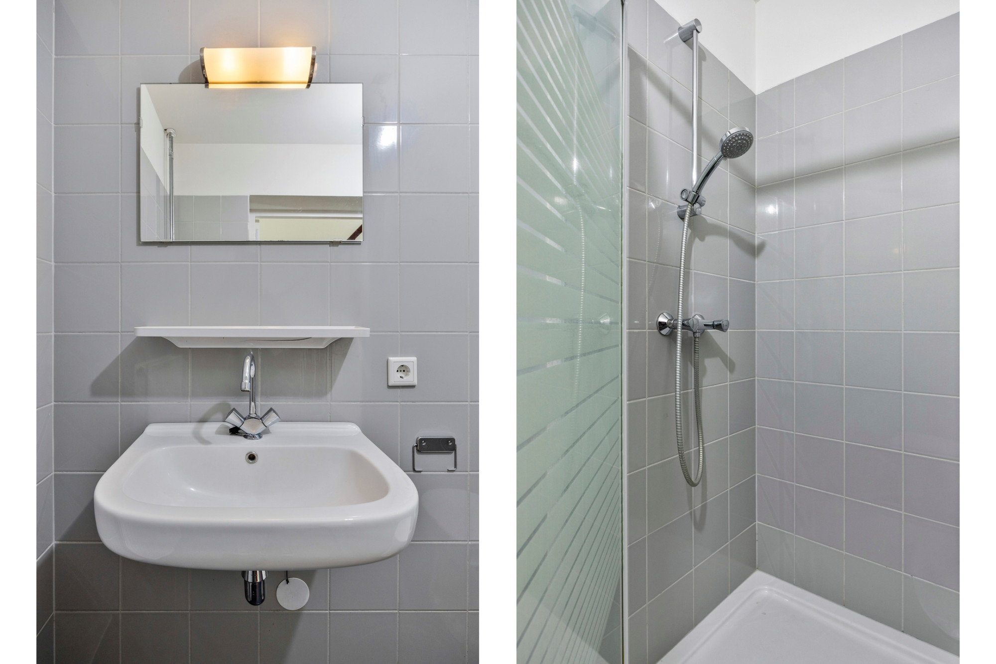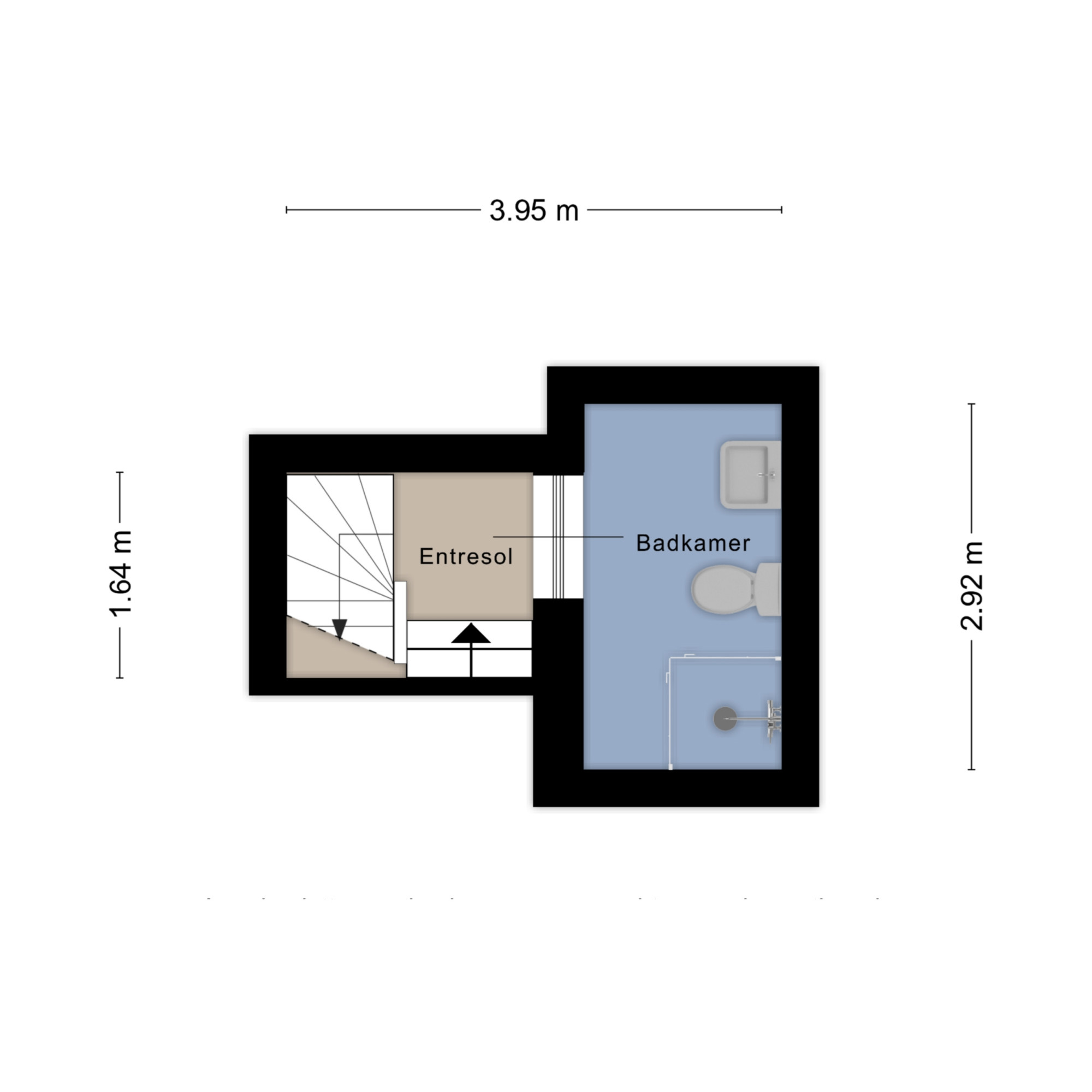Entre sol: badkamer met toilet, wastafel en douche.
