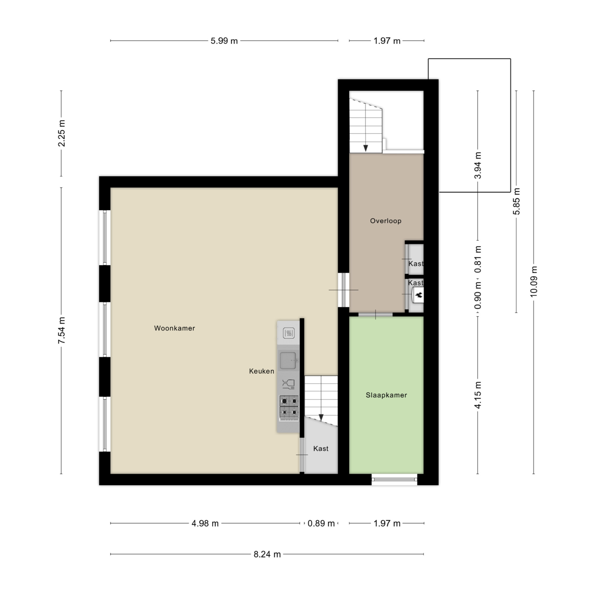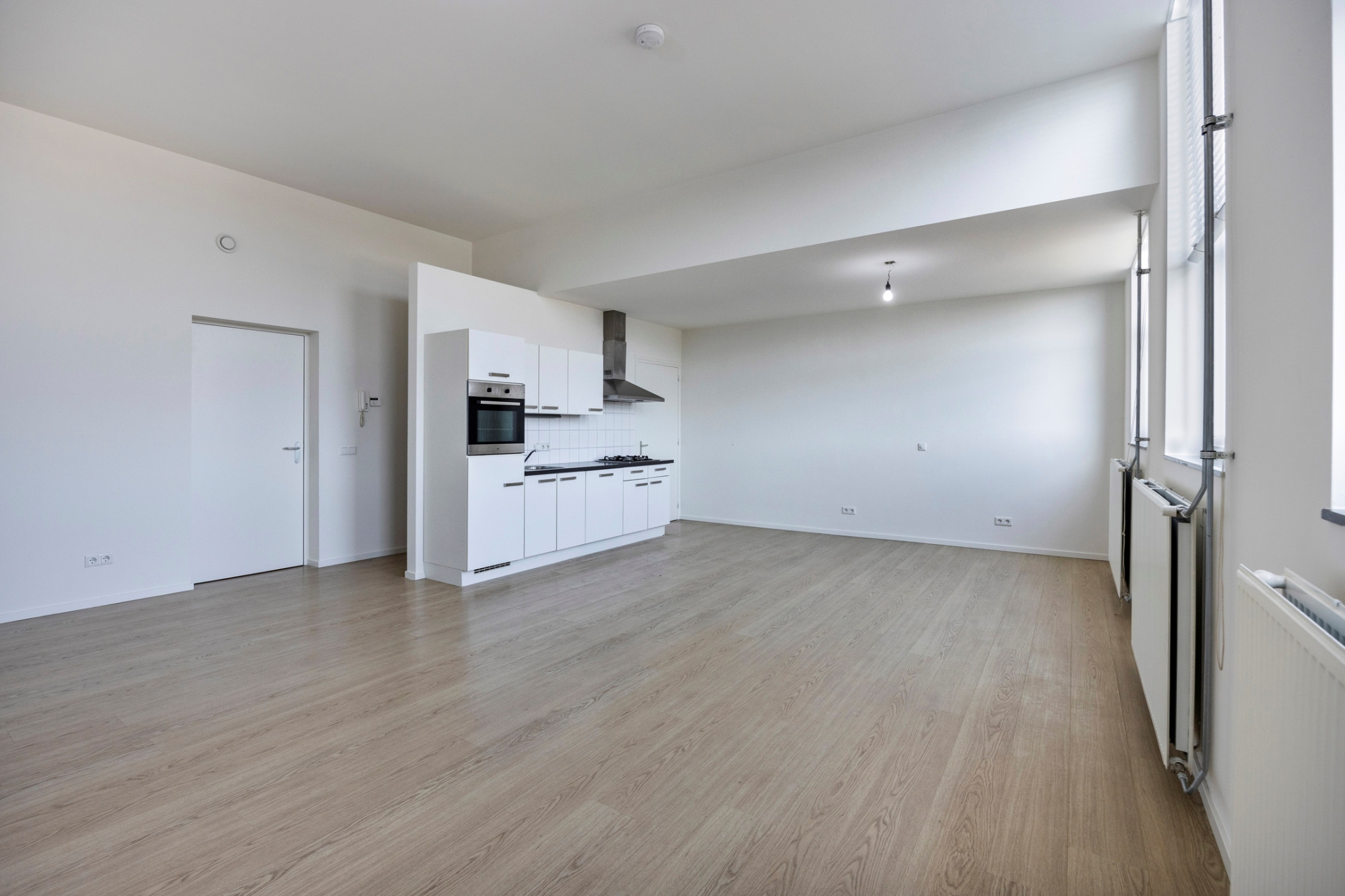 Verdieping 1: royale overloop naar de ruime woonkamer met laminaatvloer, open keuken met 4-pits gaskookplaat, afzuigkap, koelkast en oven, slaapkamer.