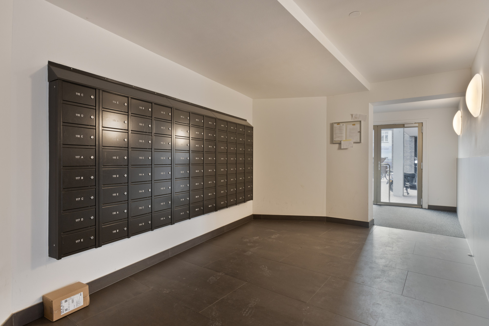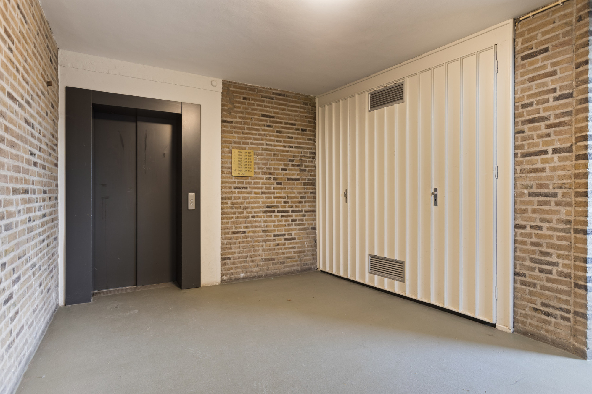 Hoofdentree met centrale hal, postbussen, video/intercominstallatie, lift en trappenhuis.