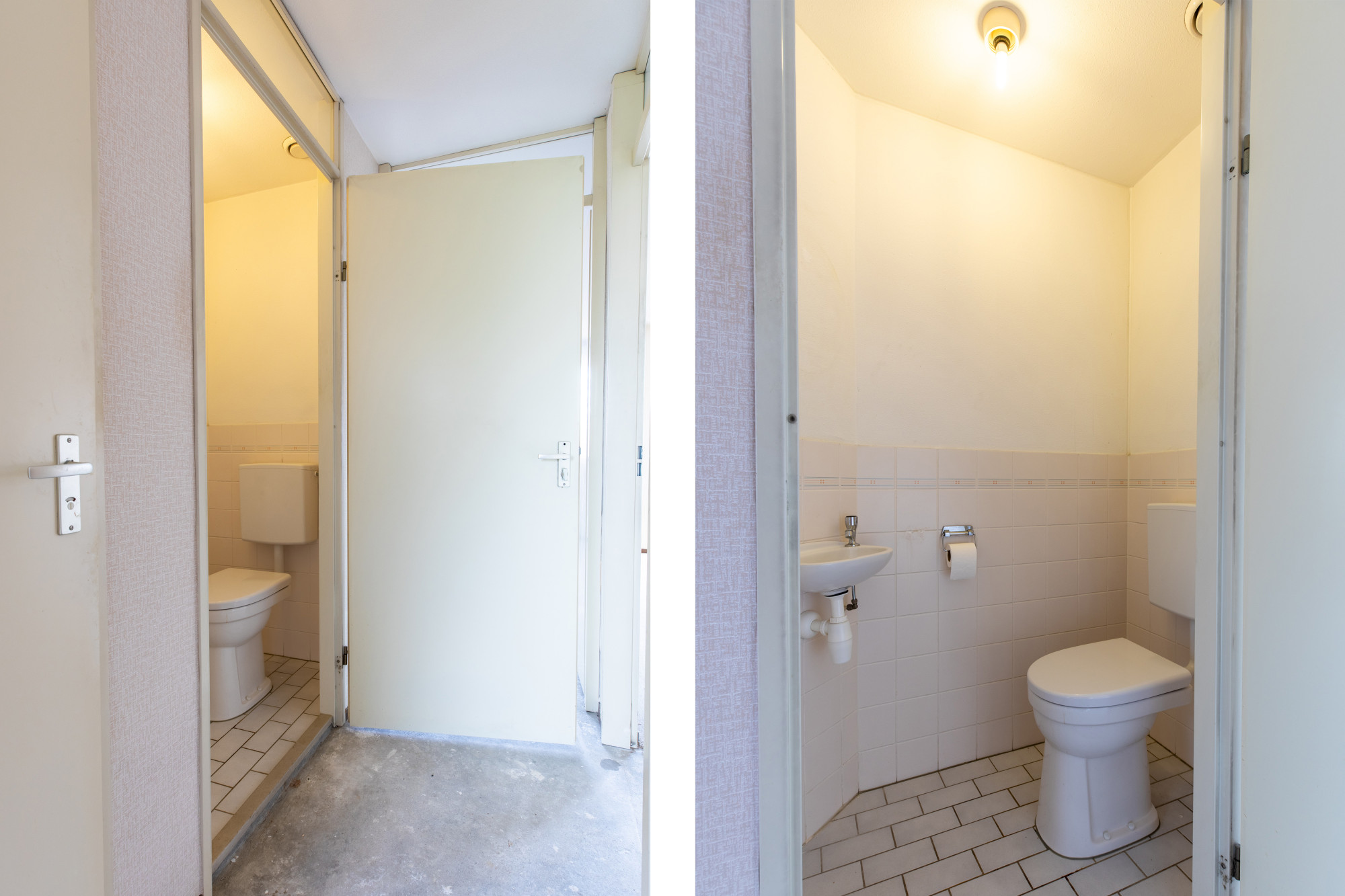 - Betegelde toiletruimte met staand closet en fonteintje.