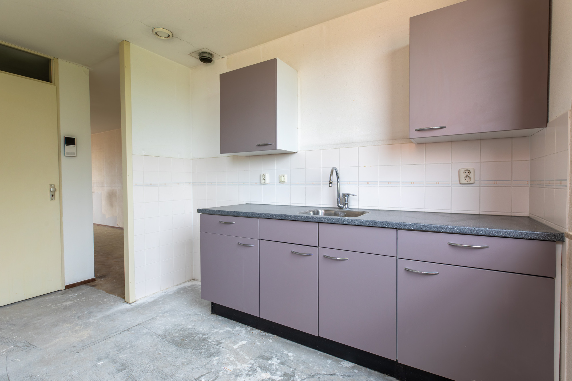 - De halfopen keuken van ca. 10 m² is voorzien van een eenvoudige keukenopstelling en biedt uitzicht op het achtergelegen park.