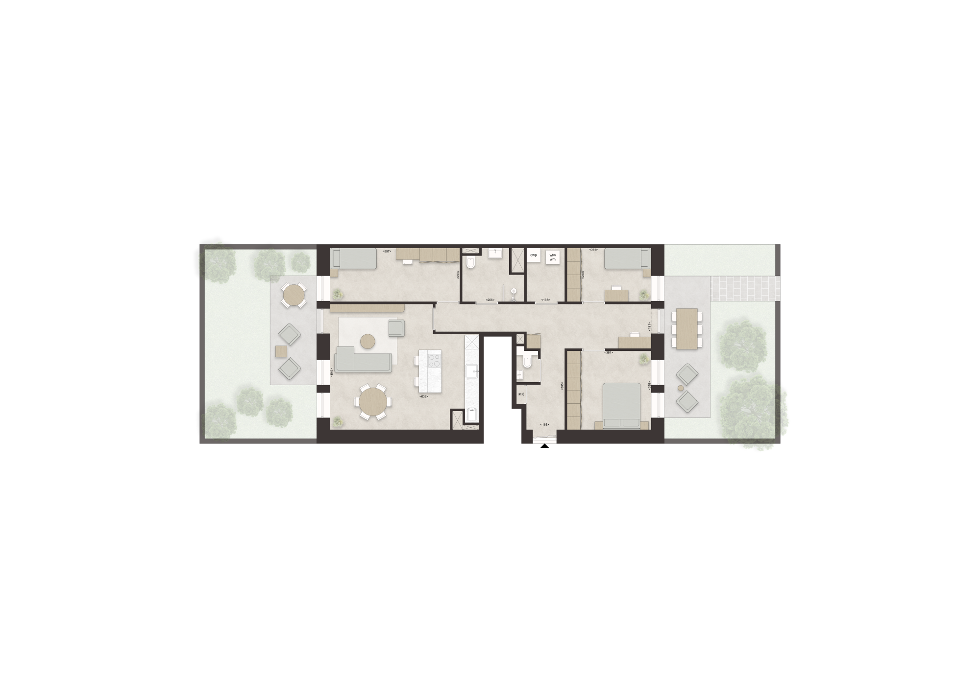 Op de begane grond van COUR bevinden zich de Lofts du COUR-woningen: royale tuinwoningen met een ongekend gevoel van vrijheid. Door de hoge plafonds en royale ramen ademt elke loft licht en openheid. De woningen beschikken over een eigen voor- én achtertuin, met uitzicht op zowel de groene loper als de rustige binnentuin.