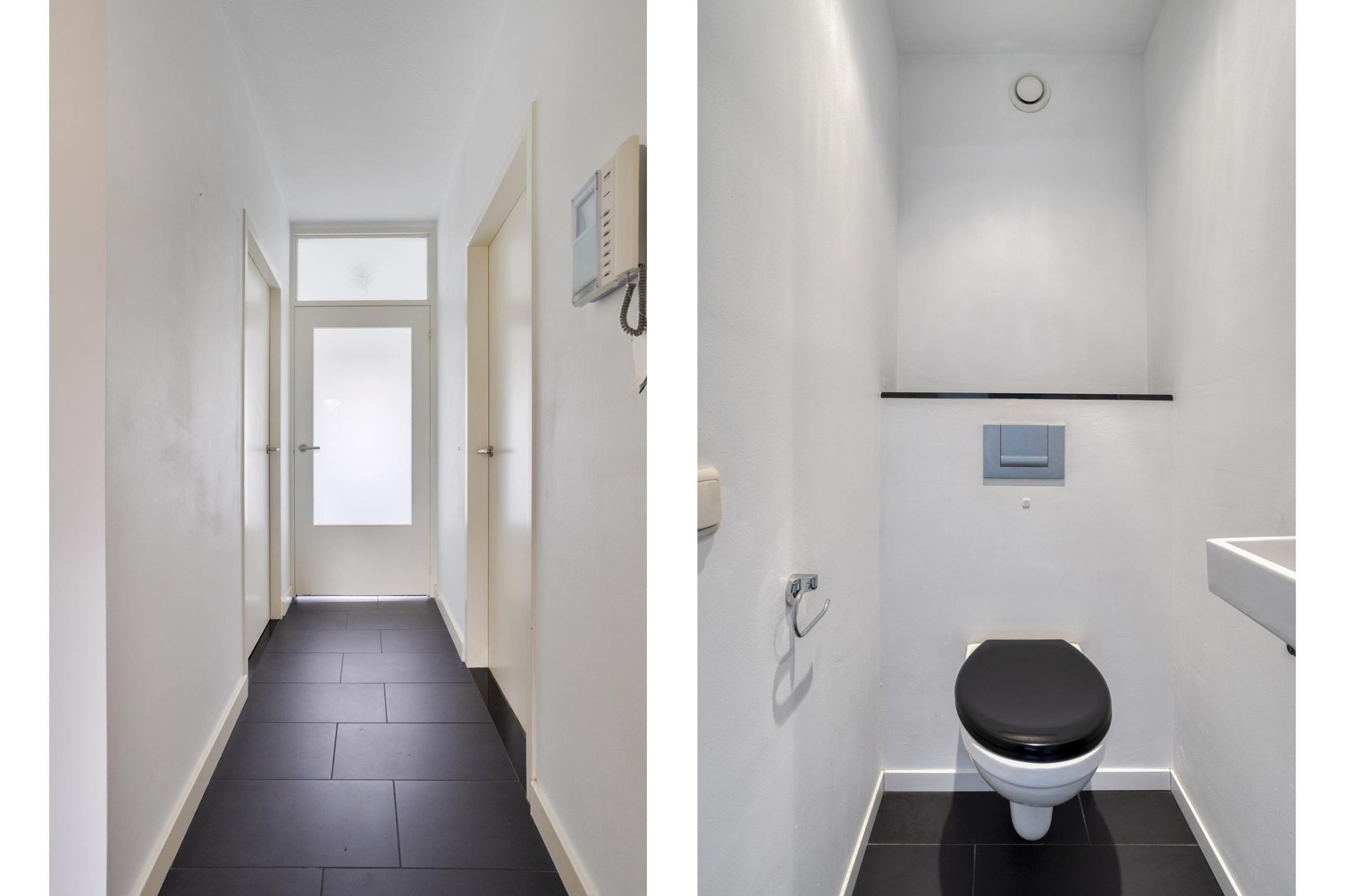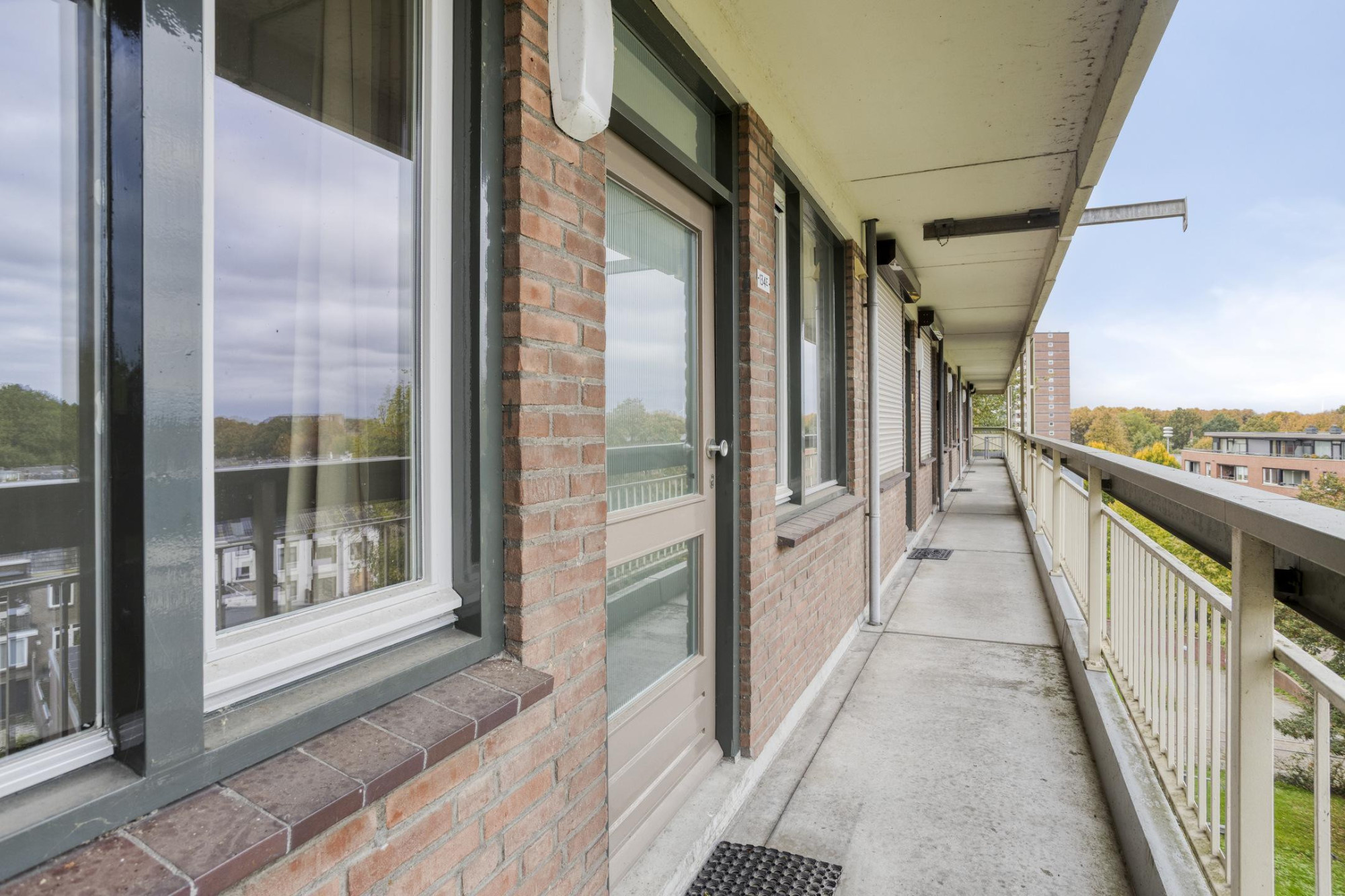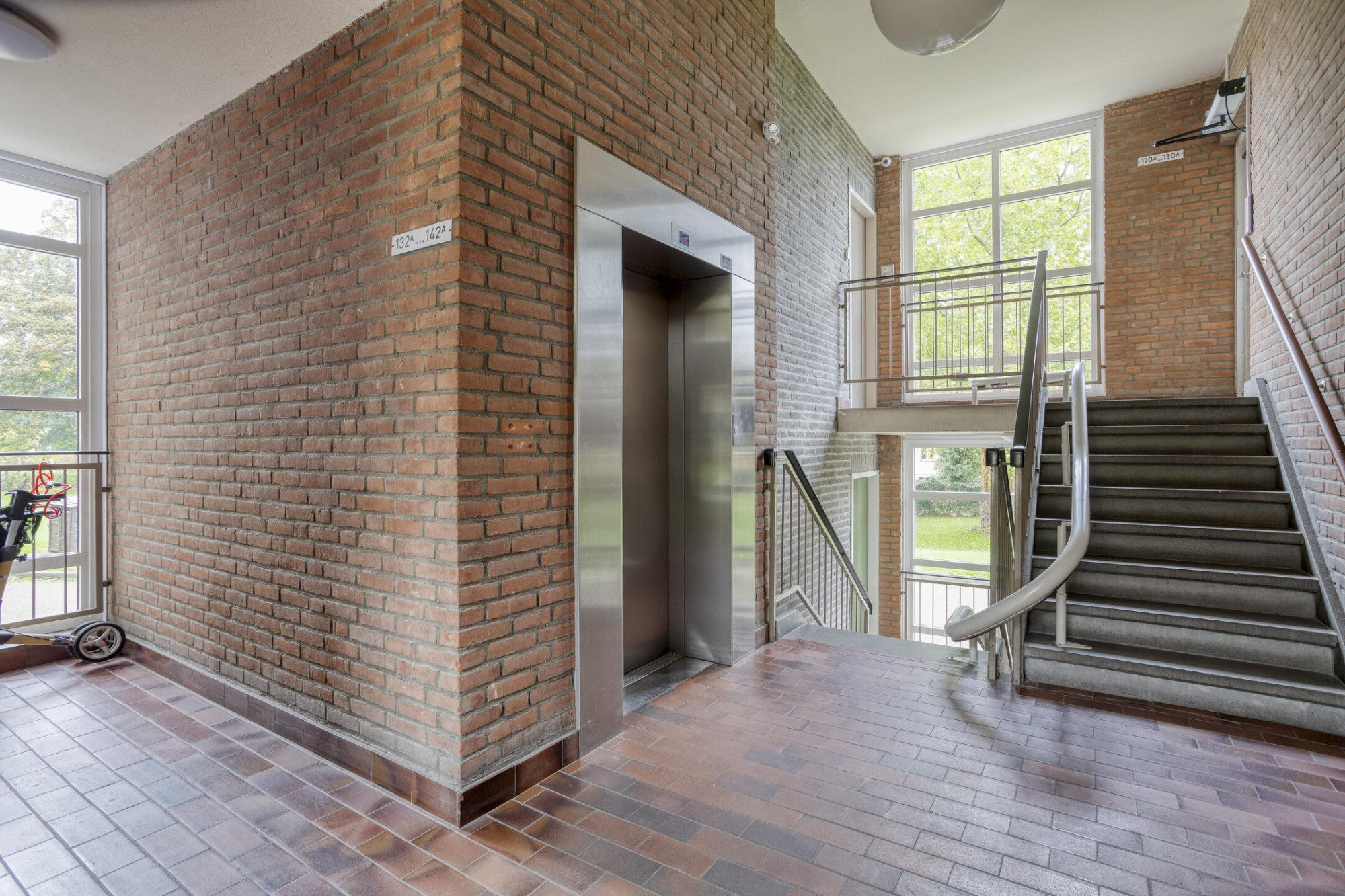 Middels lift en trappenhuis bereikbare open galerij met meterkast en toegang tot het appartement.