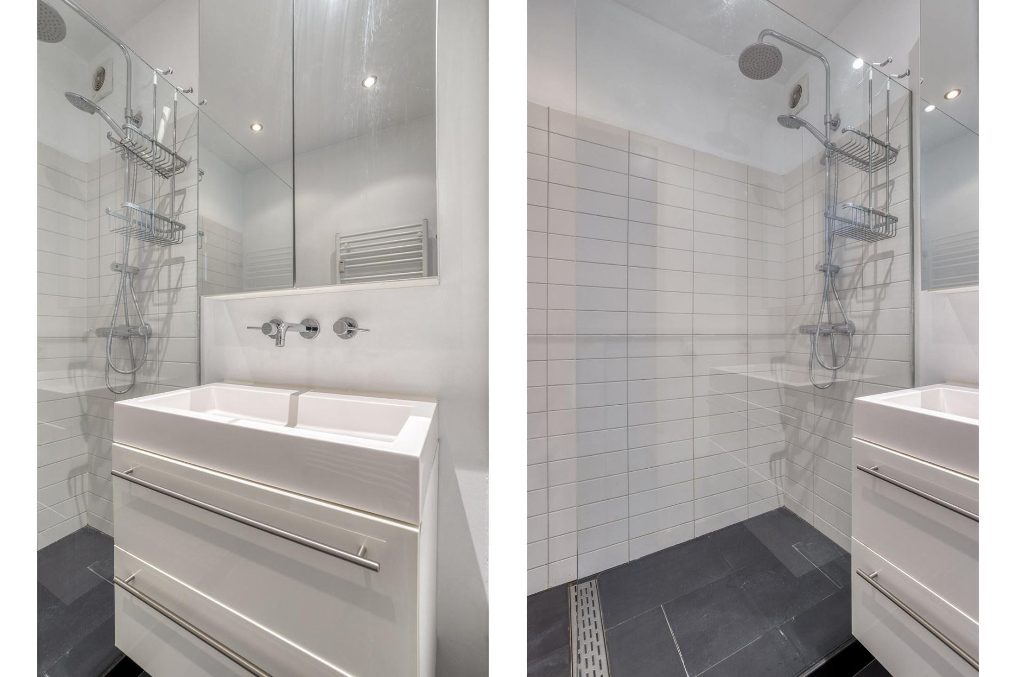 Het appartement beschikt over twee slaapkamers (resp. ca. 12 en 10 m²). De badkamer is modern uitgevoerd met een inloop regendouche, stijlvol wastafelmeubel en handdoekradiator. Separaat toilet met inbouwreservoir en fonteintje.