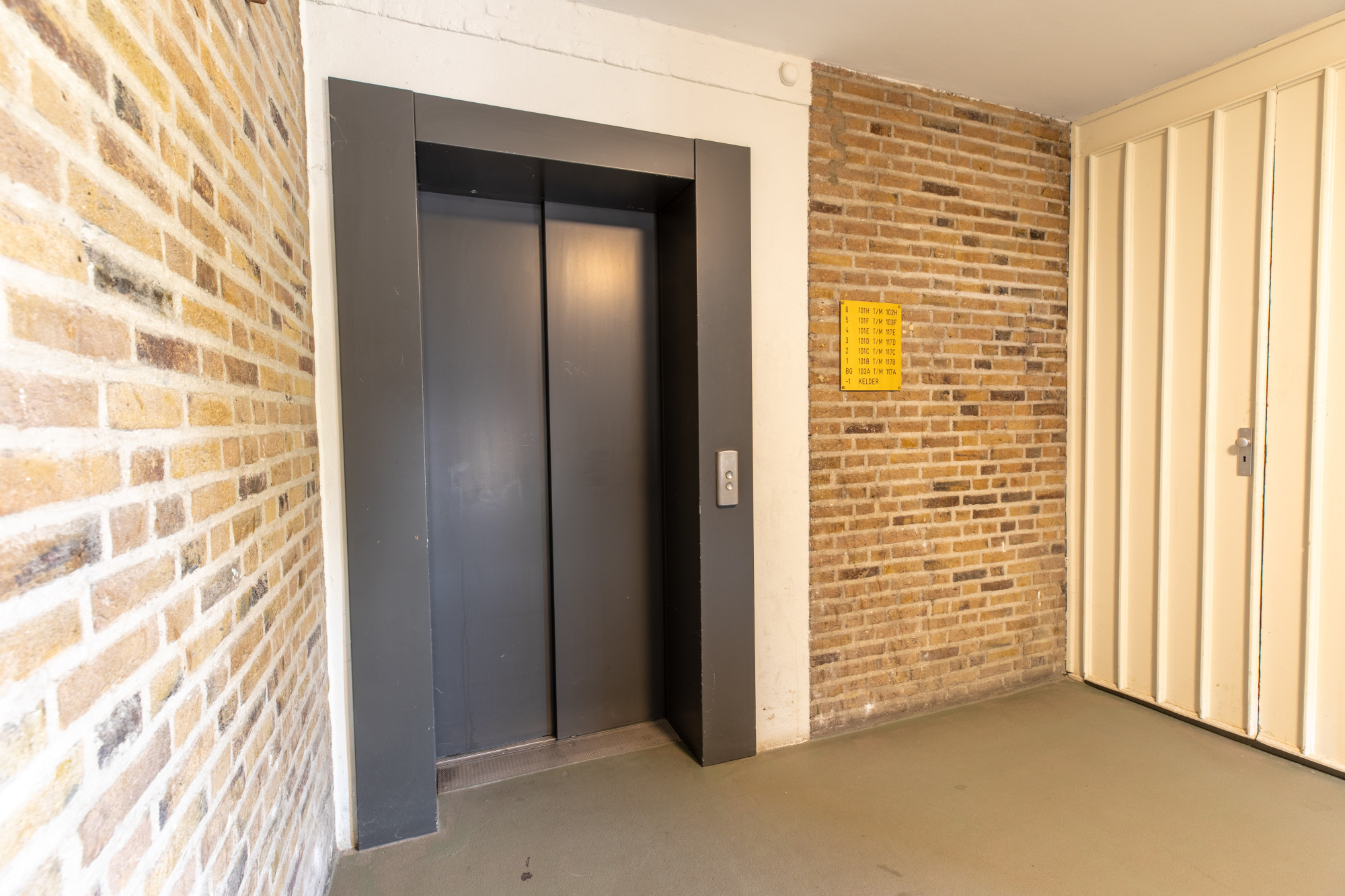 Hoofdentree met centrale hal, postbussen, video/intercominstallatie, lift en trappenhuis.