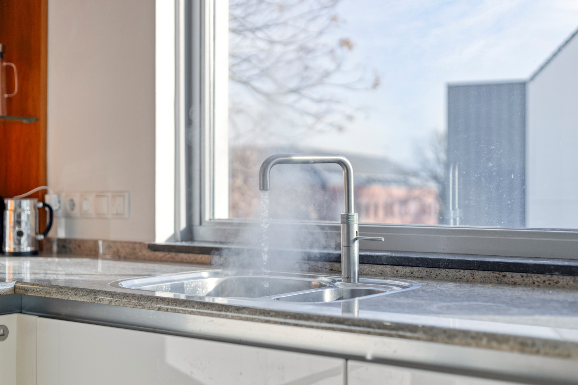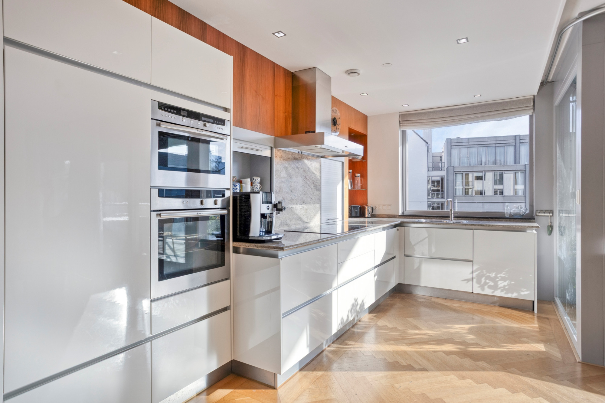 Grenzend aan de woonkamer ligt de open keuken (15m²) in hoekopstelling. Deze heeft voldoende opbergruimte en is volledig uitgerust met moderne (inbouw)apparatuur, te weten: een 4-pits inductiekookplaat met afzuigkap, koelkast, vaatwasser, magnetron, oven, dubbele spoelbak en een Quooker. Hier is het prettig koken met uitzicht op de lichte woonruimte en het balkon.