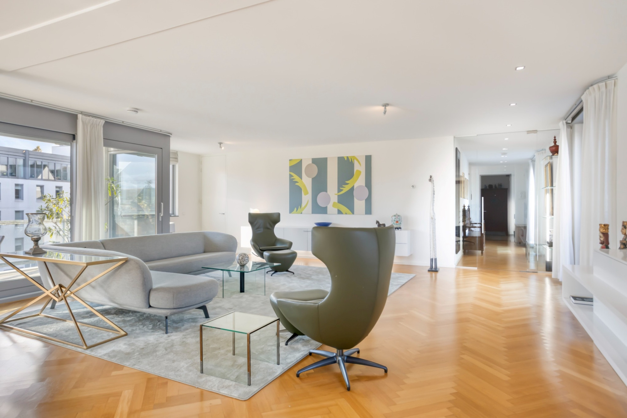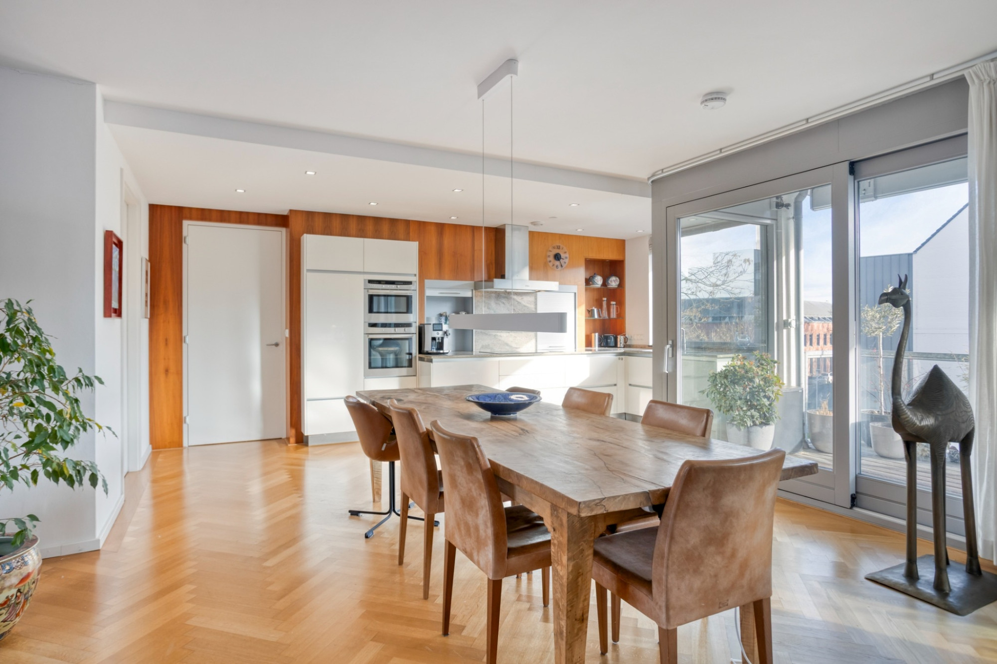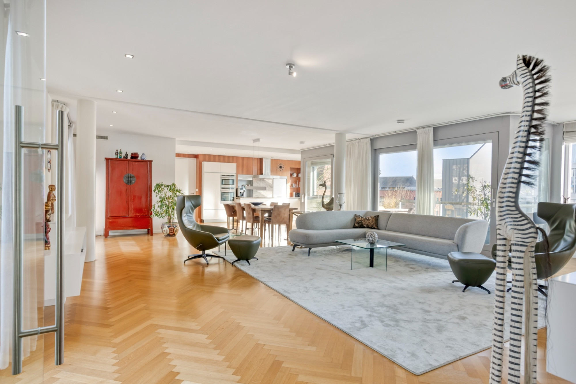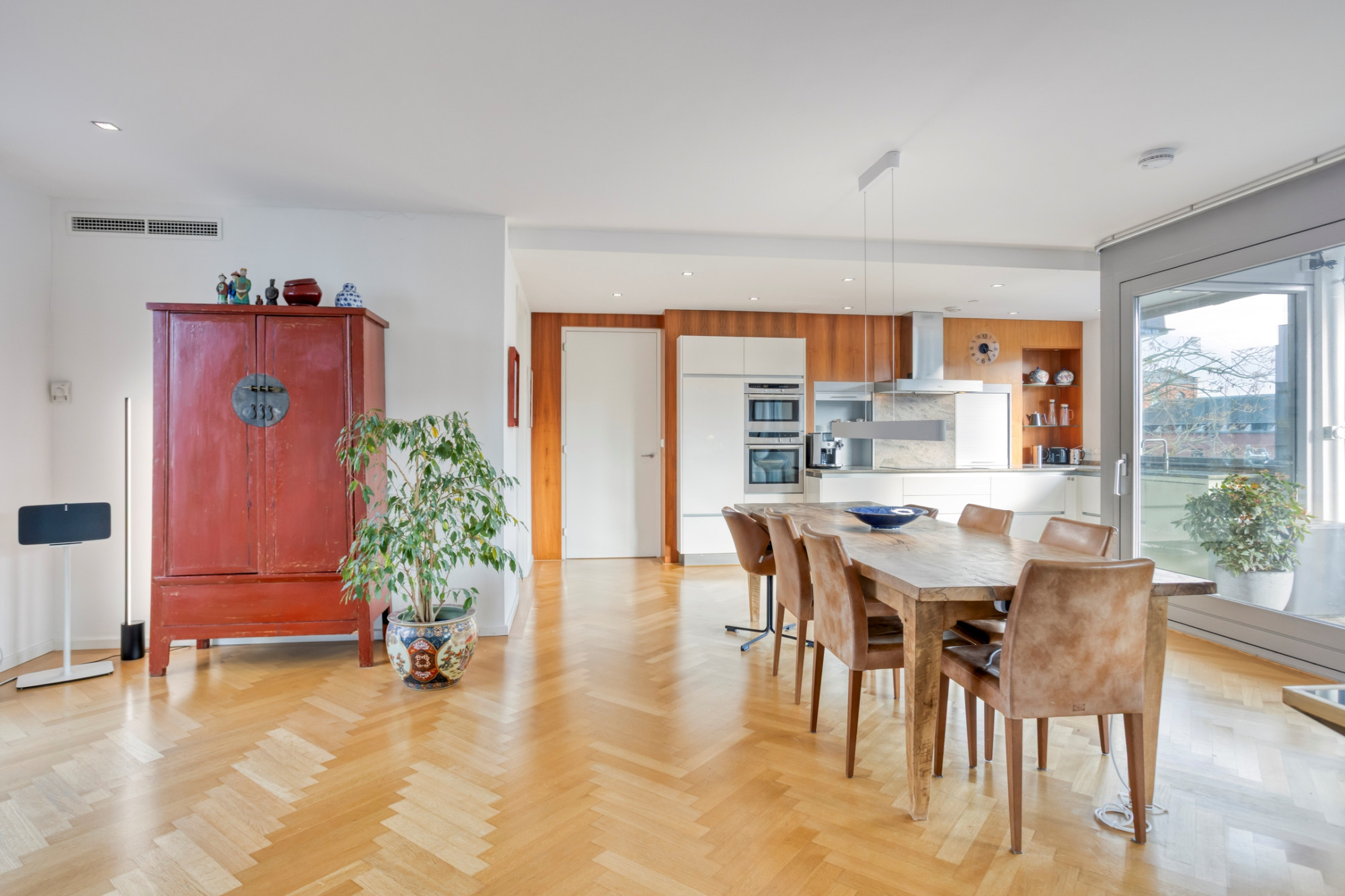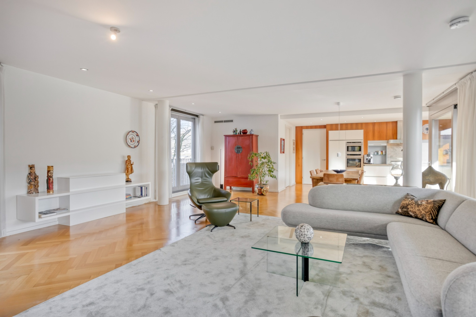 De woonkamer (68m²) vormt het hart van het appartement. Het betreft een royale leefruimte met een prachtige visgraat parketvloer, vloerverwarming en grote raampartijen die zorgen voor een zee aan natuurlijk daglicht. Vanuit de woonkamer heeft u tevens toegang tot slaapkamer 1, wat de indeling extra flexibel maakt.