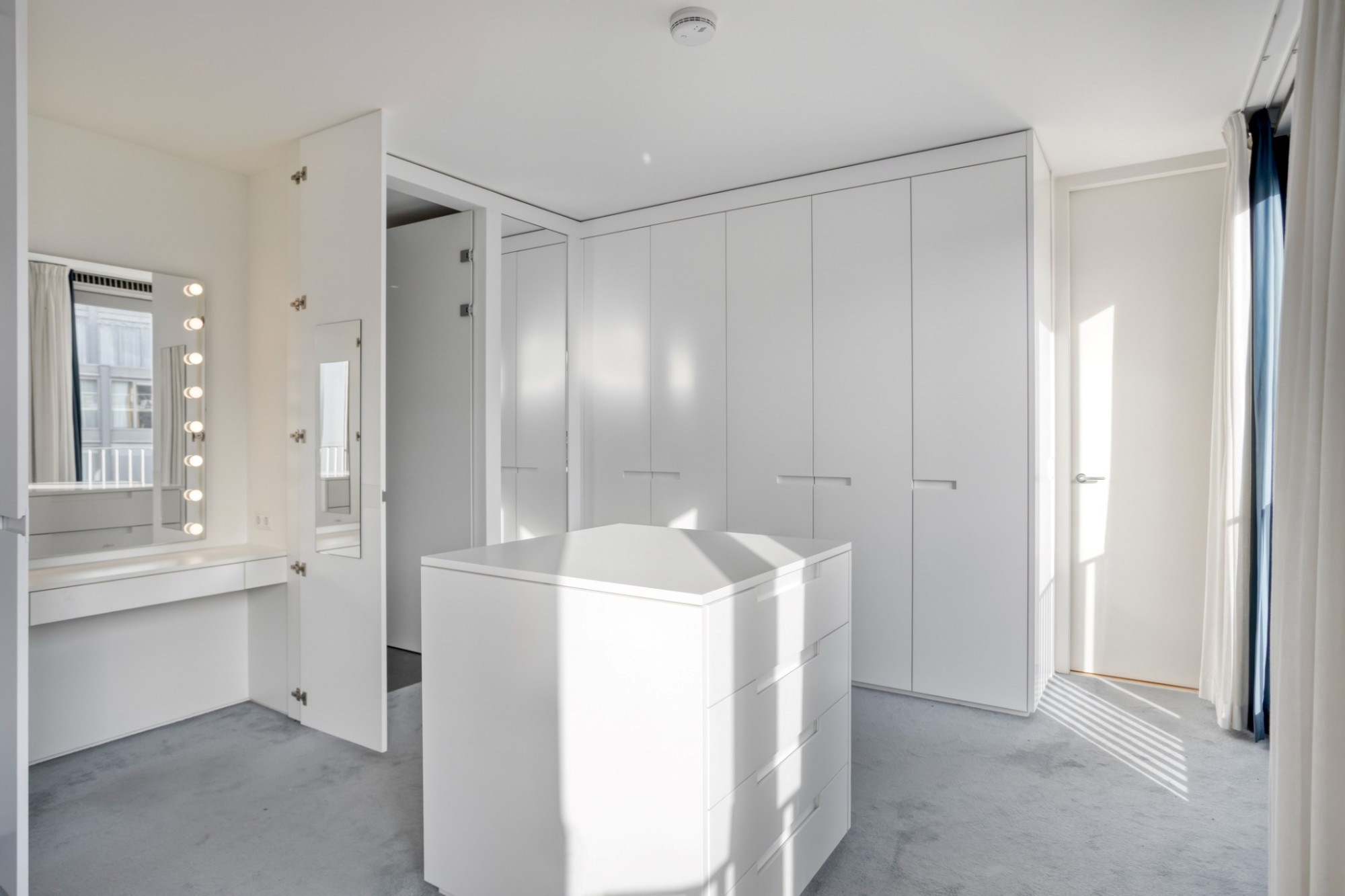 Slaapkamer 1 (22m²) is ruim opgezet en voorzien van vloerbedekking, ingebouwde kasten, een praktische make-uptafel en directe toegang tot de luxe badkamer (8m²). Deze badkamer beschikt over ingebouwde kastruimte, een high-tech Japans zwevend toilet, dubbele wastafel in meubel en een royale inloopdouche met regenfunctie; een stijlvolle en comfortabele ruimte met hoogwaardige afwerking.
