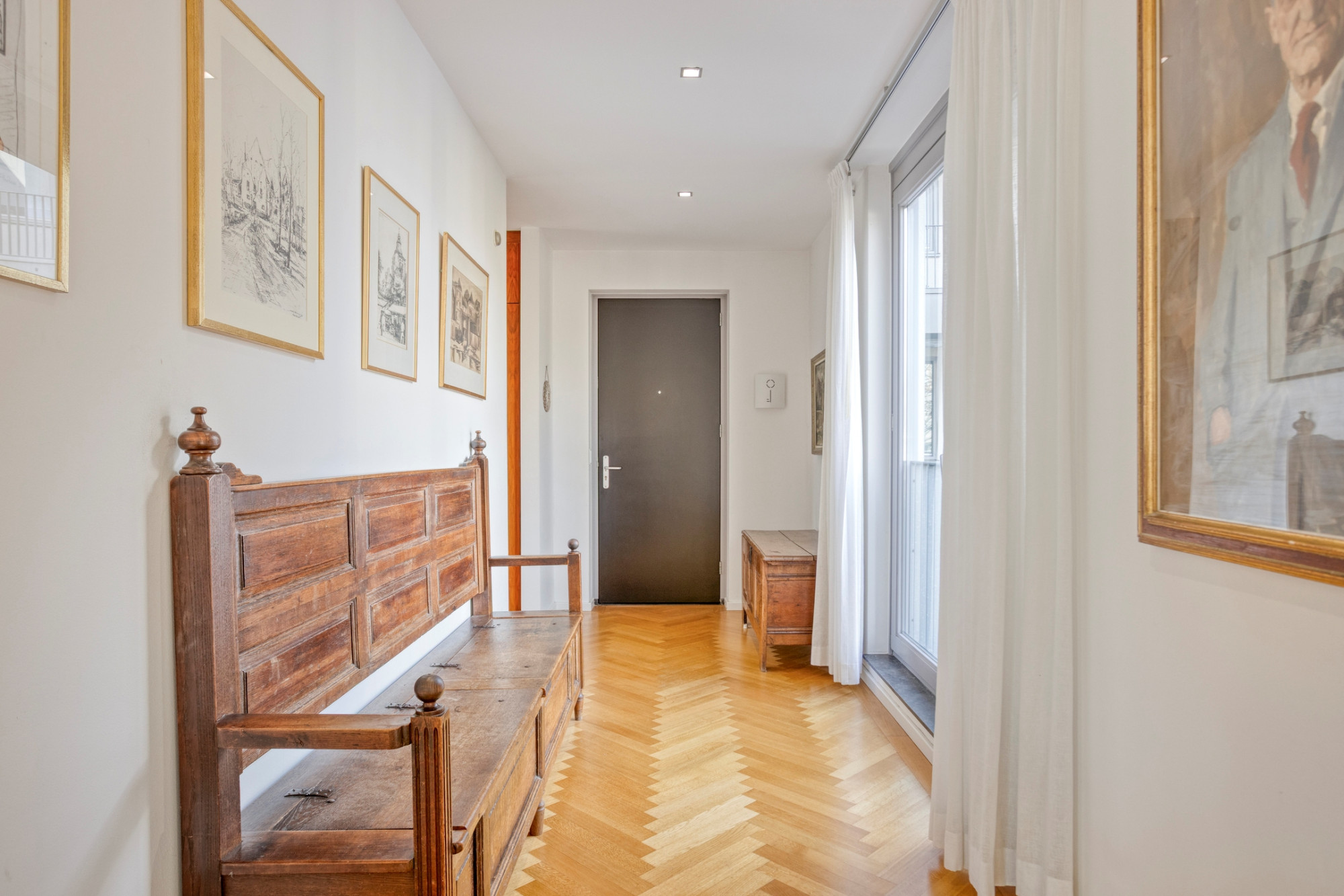 Bij binnenkomst in de verzorgde centrale hal op de derde verdieping bereikt u de entree van het appartement. De ruime hal (16m²) biedt toegang tot een garderobekast, bergruimte en een moderne toiletruimte met wandcloset en fonteintje. Vanuit de hal zijn zowel de woonkamer als de eerste slaapkamer te bereiken.