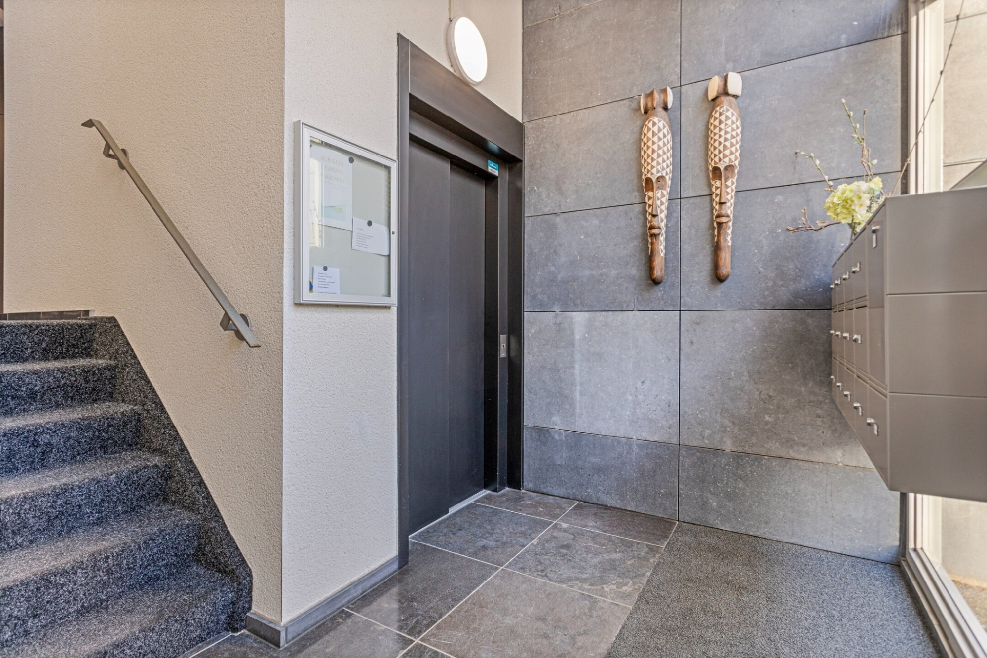 Centrale hal met brievenbussen, bellentableau en video-intercom. Hal met toegang tot de lift en het trappenhuis.