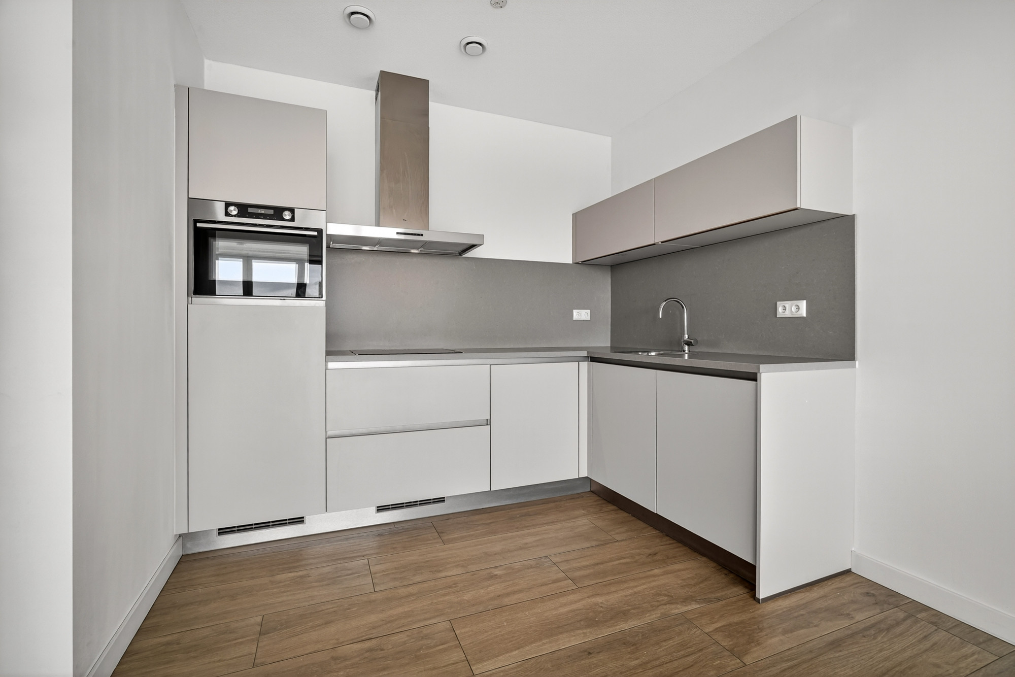 De moderne keuken is compact maar compleet uitgerust met een hoog model koelkast, vaatwasser, combi-oven, 4-pits inductiekookplaat en afzuigkap. Vanuit zowel de woonkamer als beide slaapkamers heeft u toegang tot het heerlijke balkon: een fijne plek om in alle rust van het uitzicht en de zon te genieten.