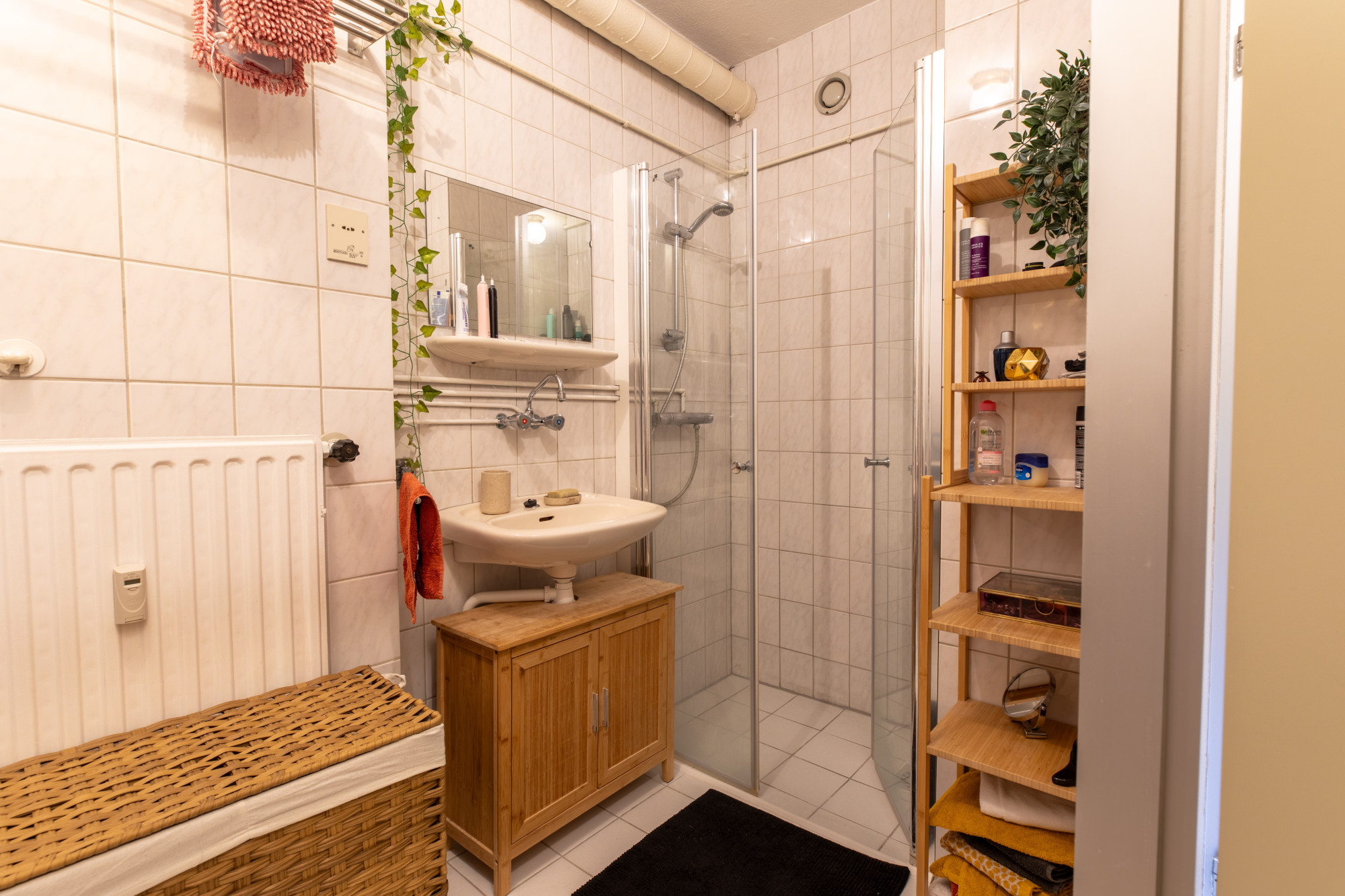 - De badkamer (ca. 4 m²) is ruim van opzet en is v.v. een inloopdouche, wastafel en was-/droogmachine-aansluiting.