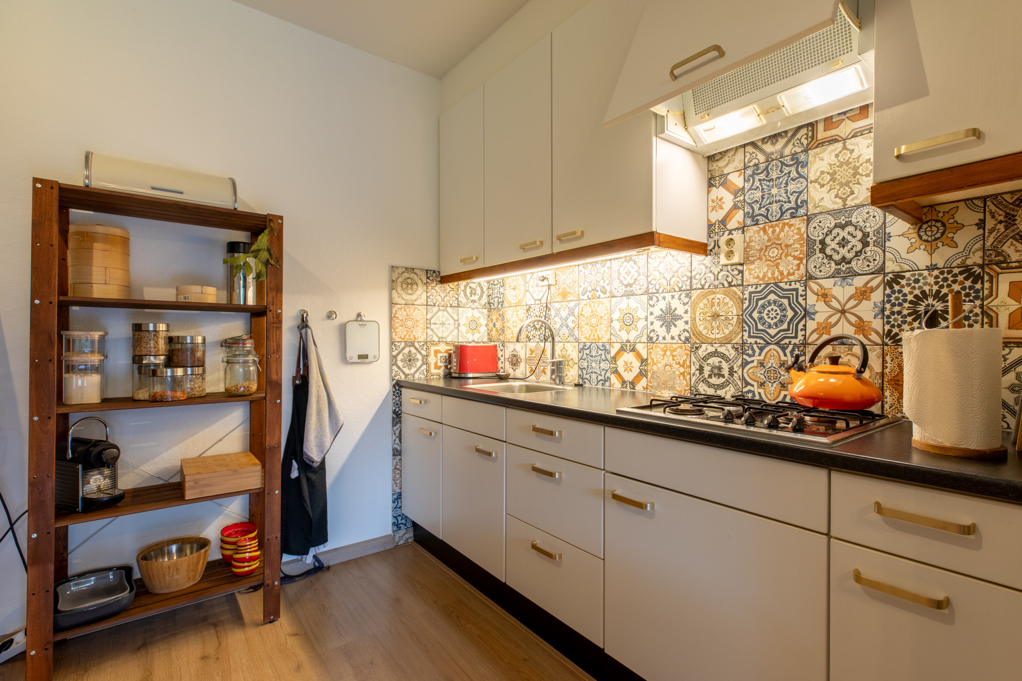 - De open keuken is in wandopstelling geplaatst en is v.v. 4-pits gaskookplaat, afzuigkap en diverse boven- en onderkastjes.