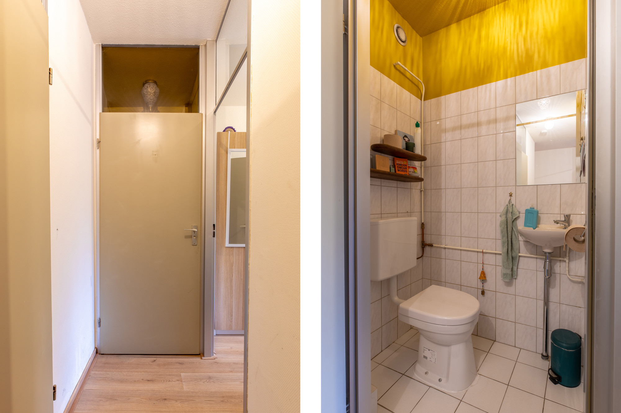 - Separaat toilet (1,3 m²) v.v. opbouwtoilet en fonteintje, drie kwart betegeld.