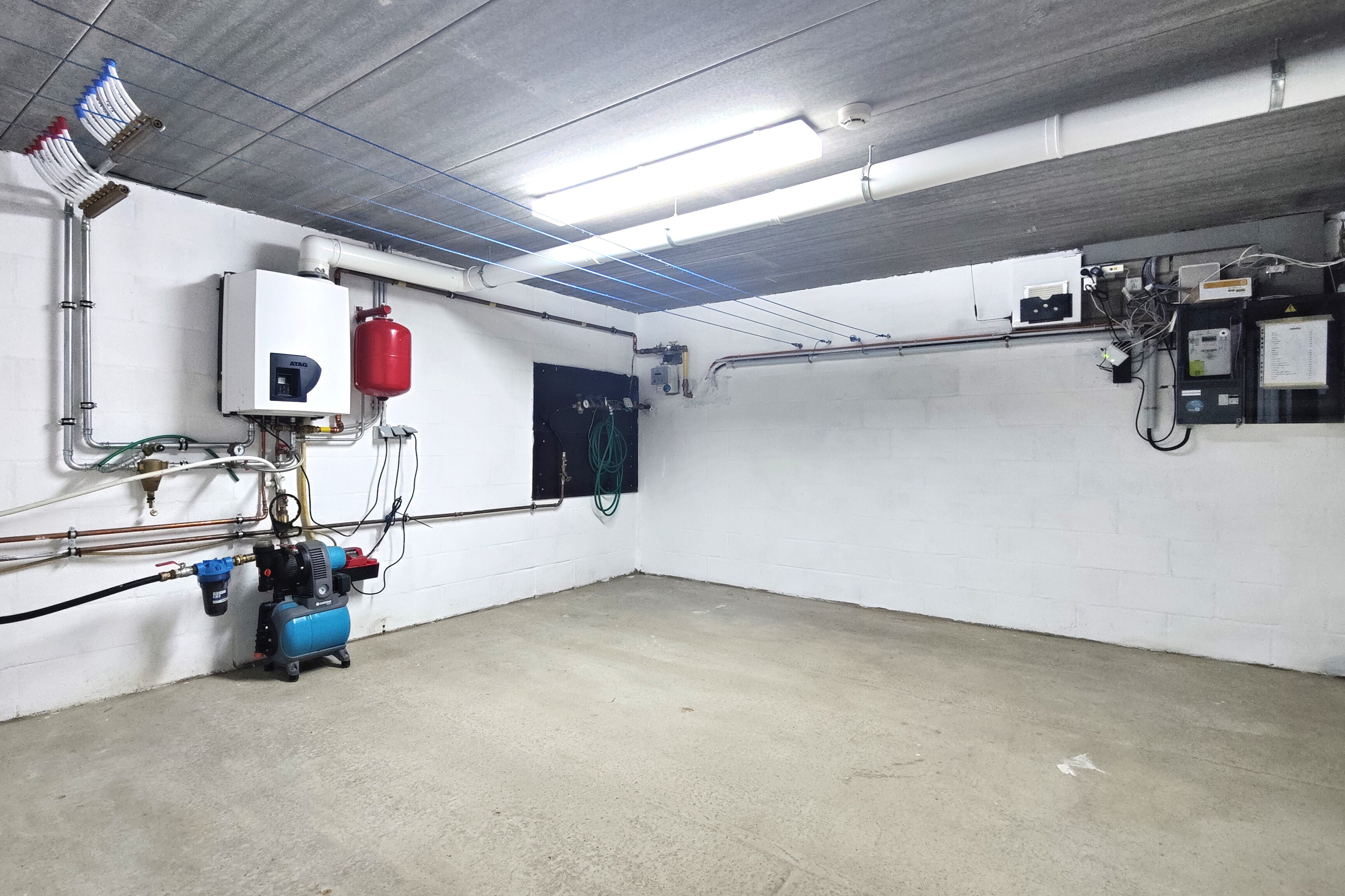 Via de inkomhal kan u de leefruimte, de 3 slaapkamers en de badkamer bereiken. De badkamer beschikt over een bad en ruime douche. Aansluitend aan de leefruimte kan u de open keuken terugvinden. Laatstgenoemde geeft u toegang tot de achtertuin met veranda. Tot slot biedt de kelder heel wat mogelijkheden. Hier bevinden zich 5 ruimtes die nog kunnen worden ingericht.