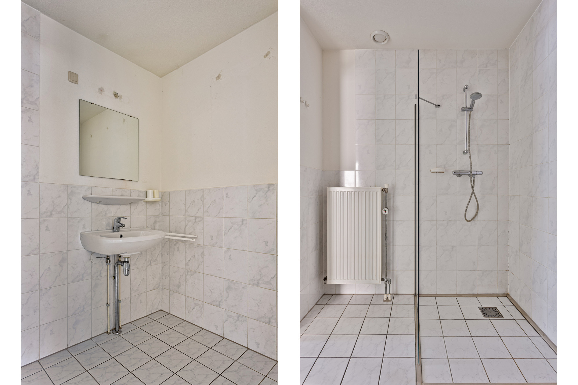 De badkamer is halfhoog betegeld en voorzien van een douche(cabine) en wastafel. Ook de aansluitingen voor wasmachine en droger zijn te vinden op de badkamer.