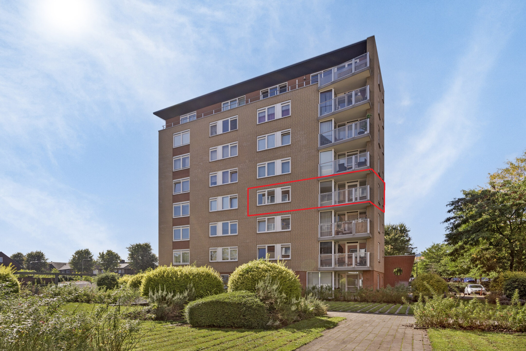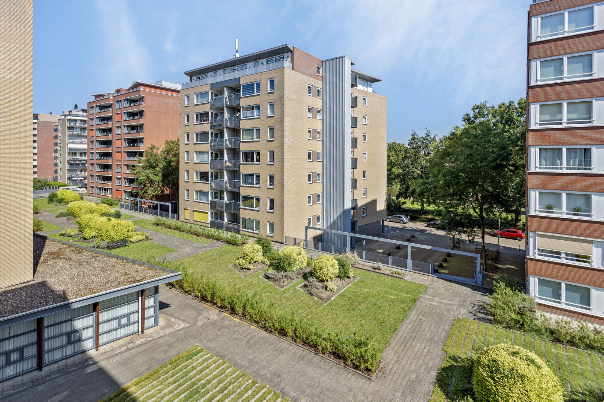 Het gebouw telt acht woonlagen met ieder vier appartement. Je deelt de etage dus met slechts drie andere bewoners.