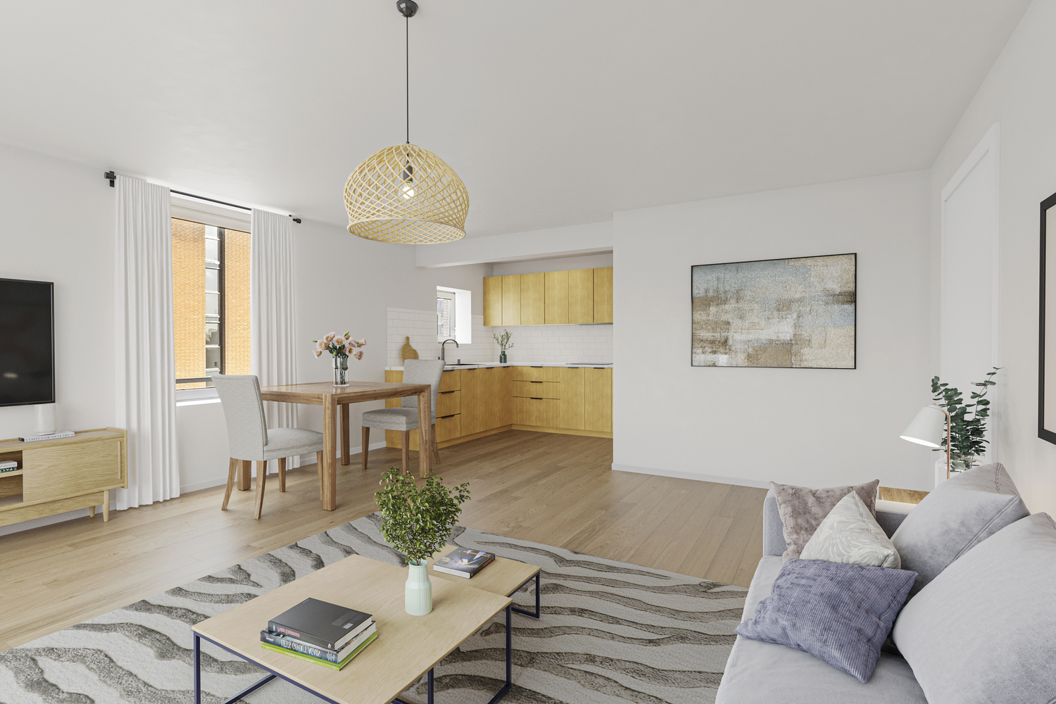De entree van het appartement geeft toegang tot alle ruimtes. Vanuit de hal bereik je de ruime woonkamer, waar voldoende plek is voor een gezellige zit- en eethoek. Via de balkondeur stap je het overdekte balkon op, gesitueerd op het westen, waar je kunt genieten van de middag- en avondzon.
