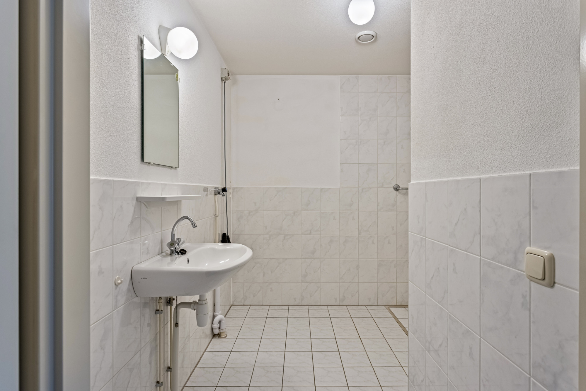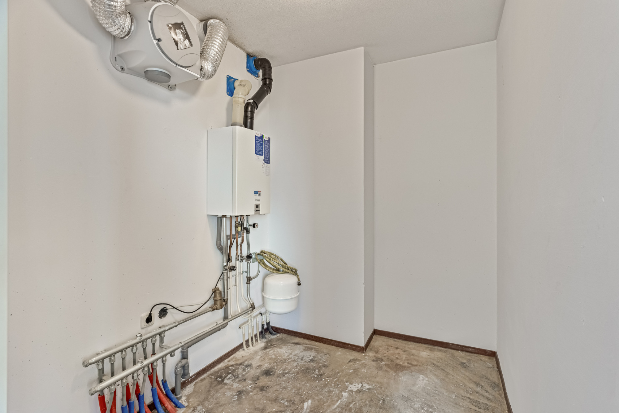 De open keuken is eenvoudig maar functioneel en grenst aan een praktische berging, voorzien van de cv-combiketel en mechanische ventilatie. De badkamer is uitgerust met een douche(cabine), wastafel en aansluitingen voor een wasmachine en droger.