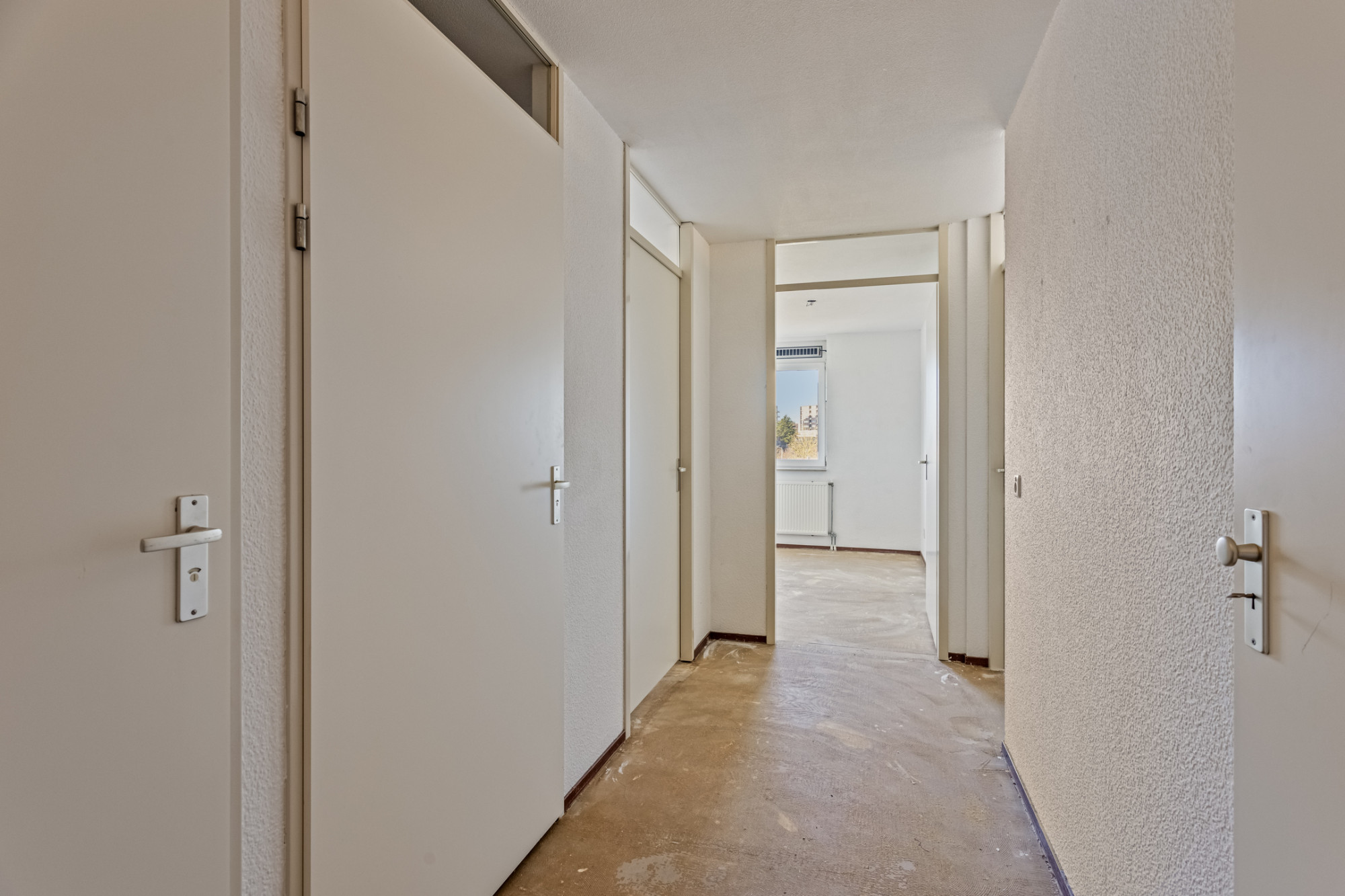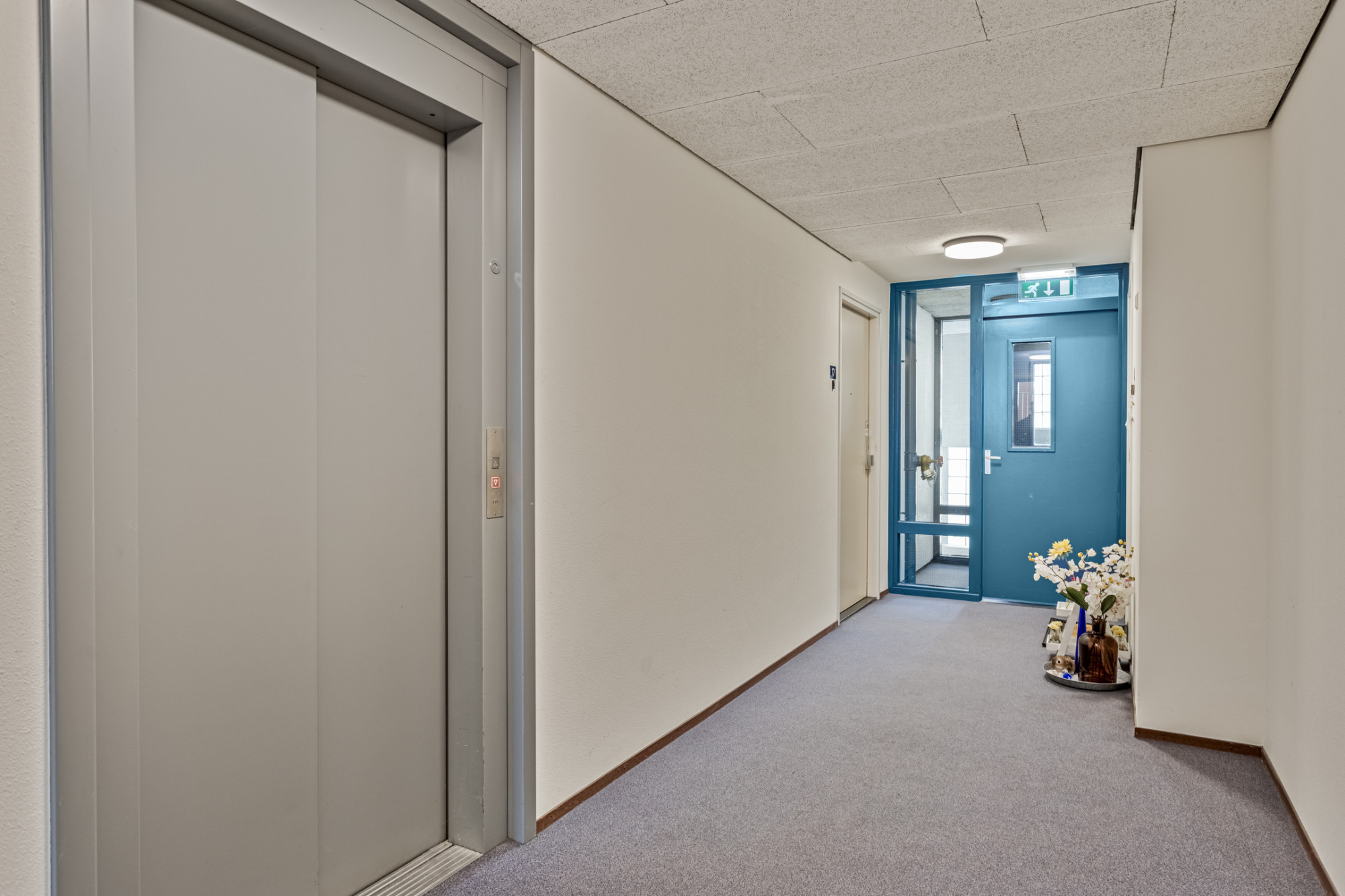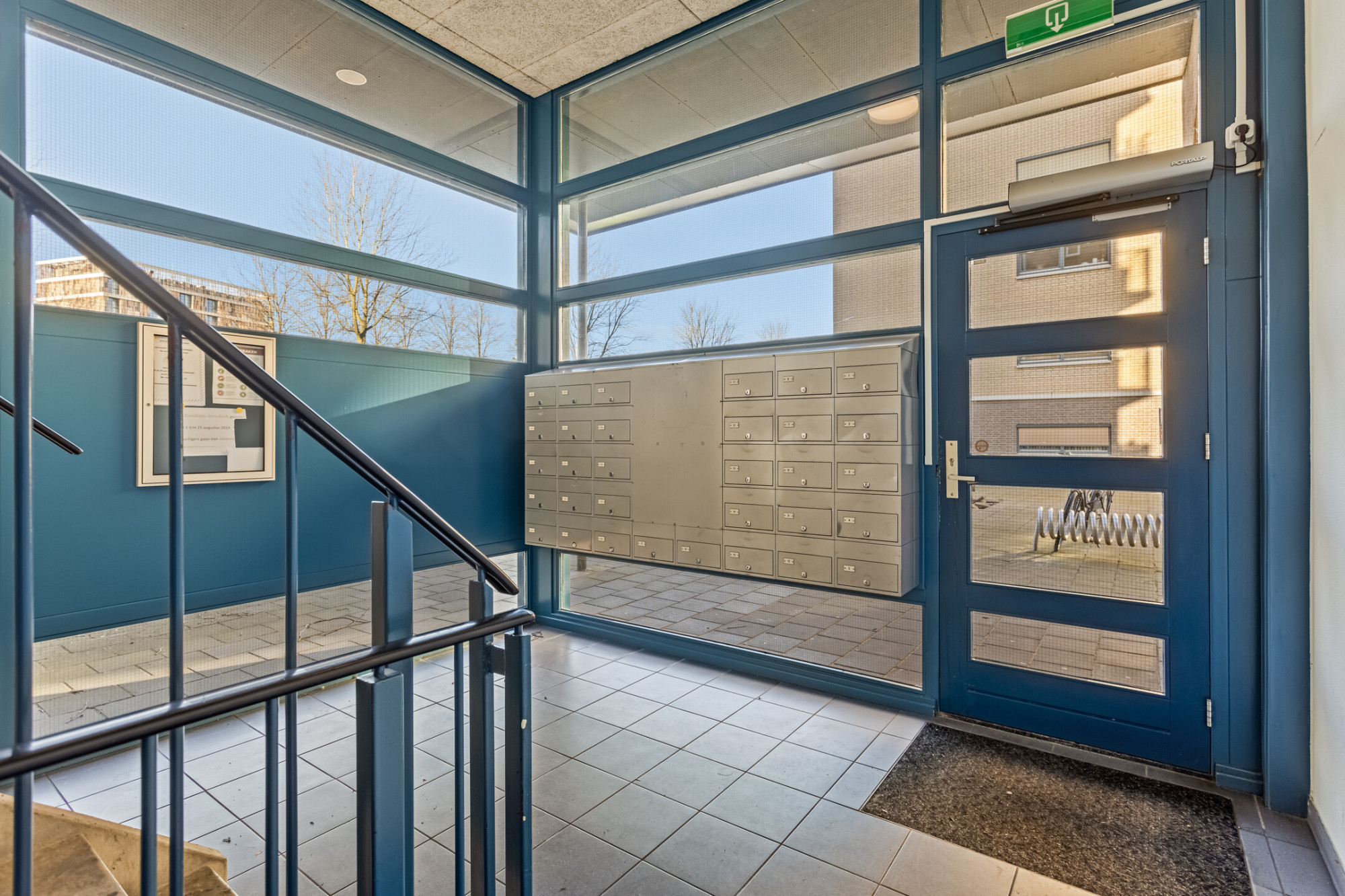 Bij binnenkomst in het complex word je verwelkomd in een nette, centrale entree met brievenbussen en een bellentableau. Via de lift of het trappenhuis bereik je de vierde woonlaag, waar dit hoekappartement zich bevindt.