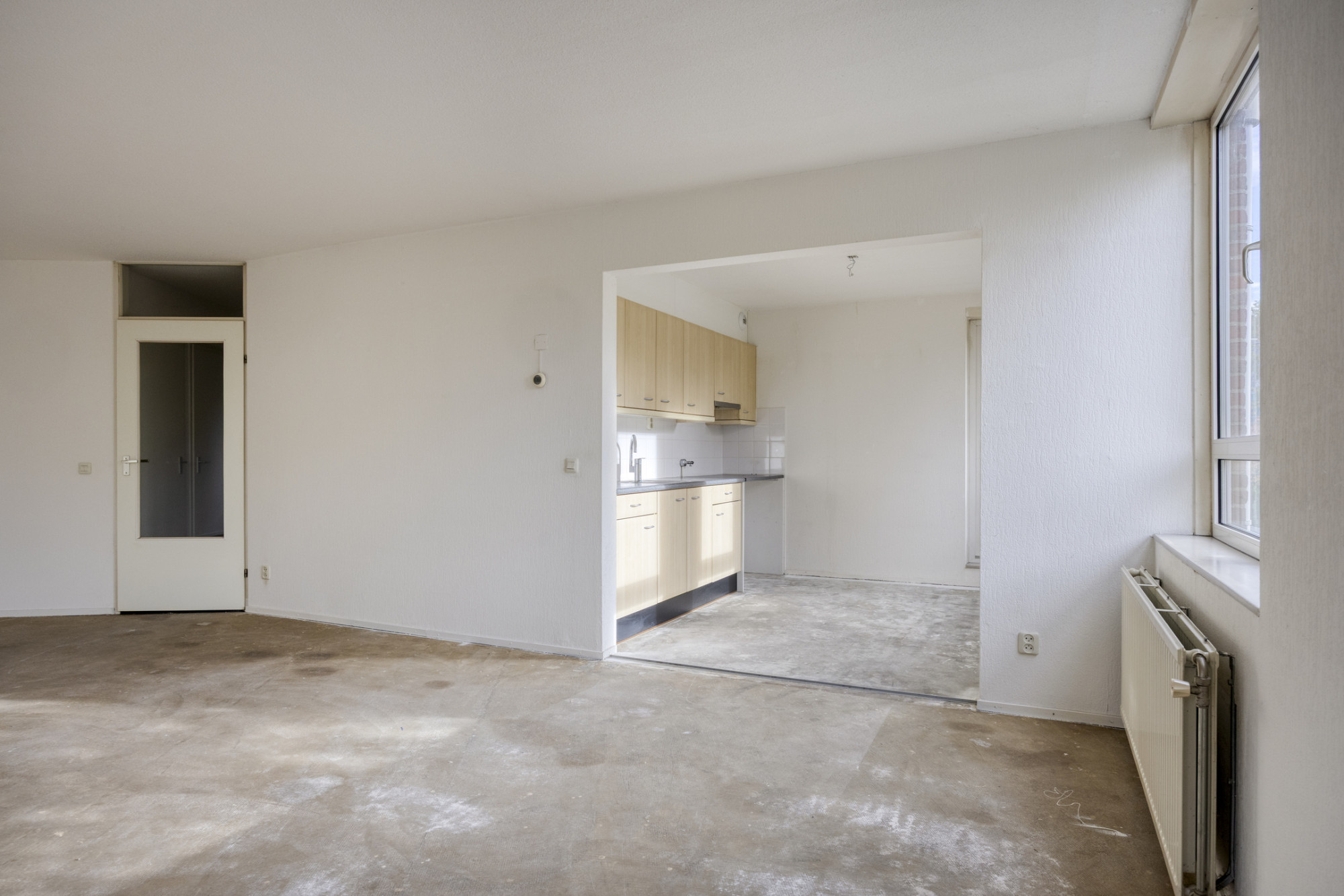 De lichte woonkamer met een oppervlakte van ca. 48 m² is voorzien van veel daglichttoetreding door de grote raampartijen. De woonkamer gaat over in de keuken van ca. 4 m² welke op haar beurt toegang biedt tot het balkon.