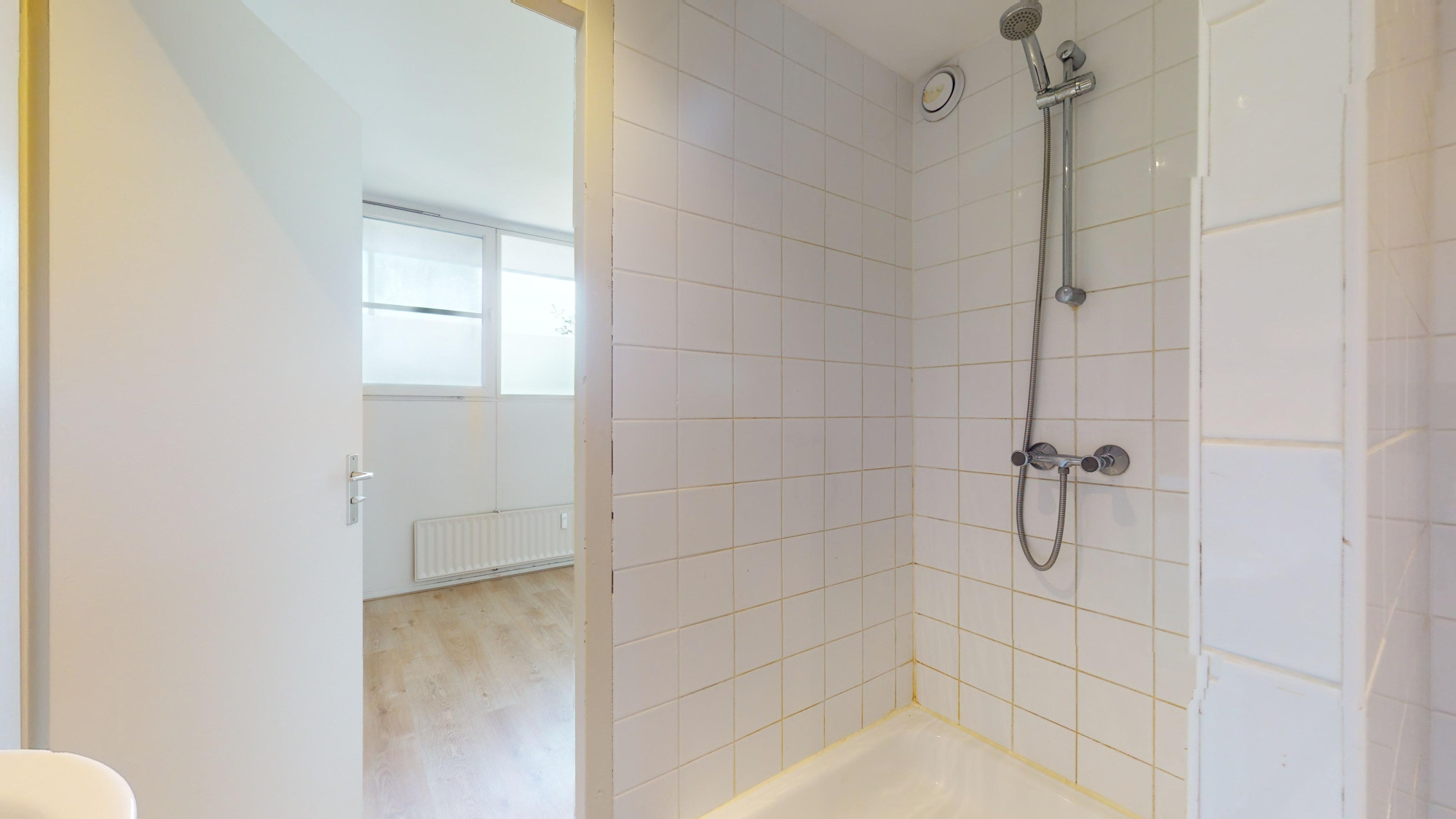 Fully tiled, modern bathroom (2.10 x 1.95 m) equipped with walk-in shower and sink.