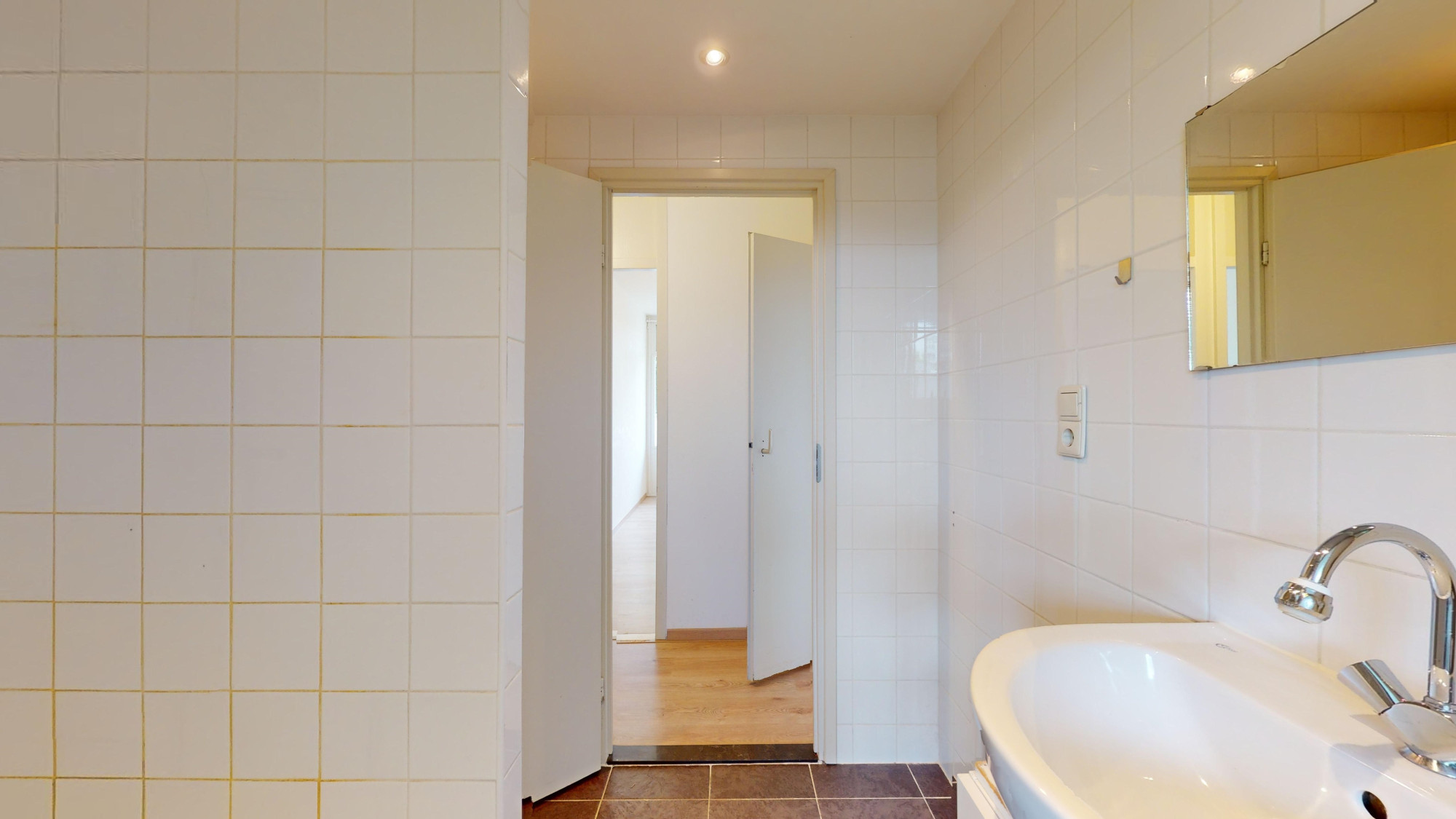 Fully tiled toilet room (1.45 x 0.80 m) equipped with floating toilet and sink. Laundry room/storage room, with connection for washing machines and boiler.