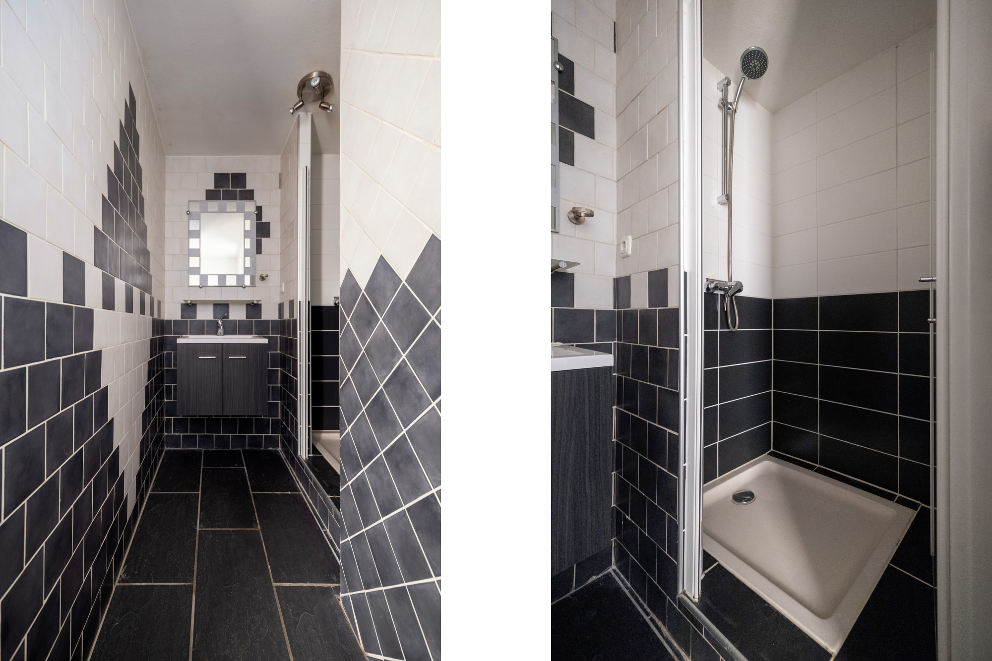De betegelde badkamer is praktisch ingedeeld en voorzien van een separate toiletruimte met hangcloset, een douchecabine en een wastafelmeubel.