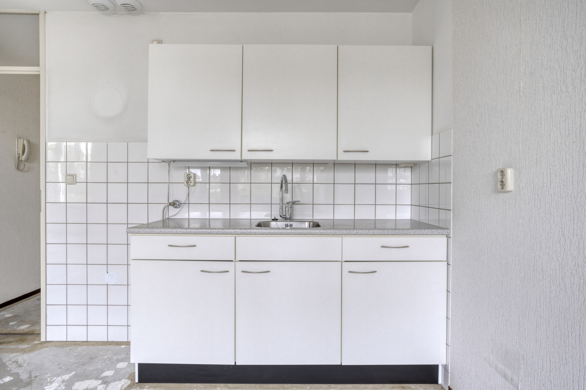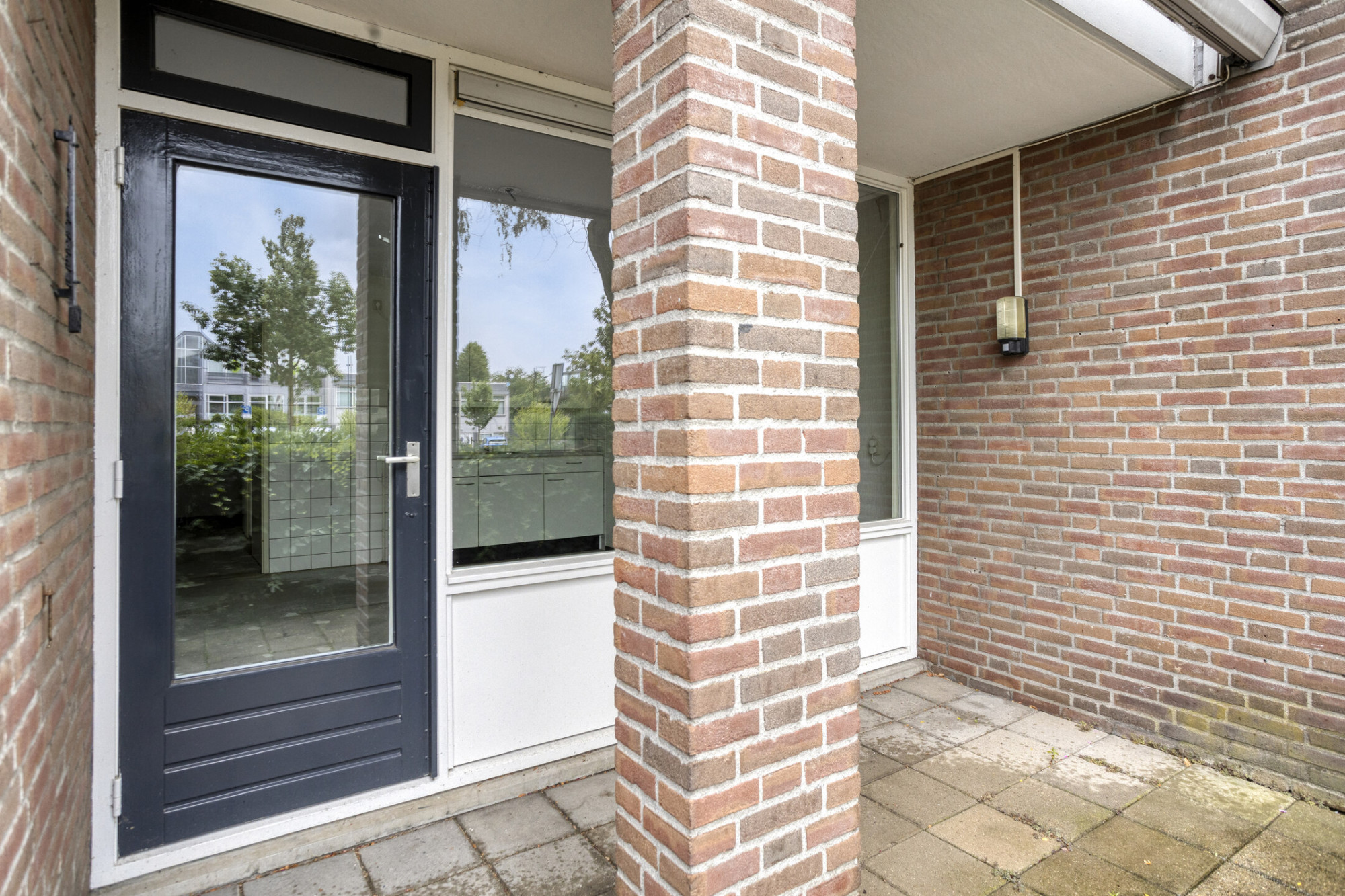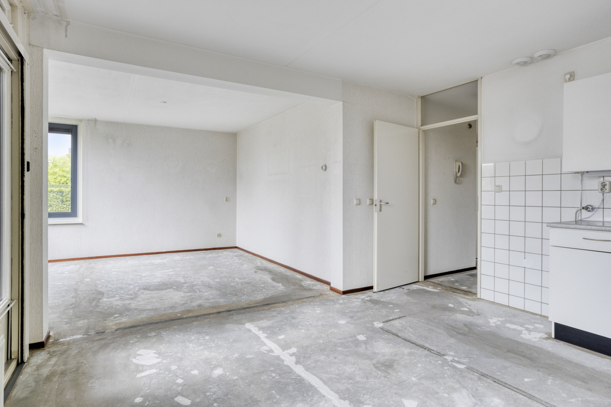 De entree met meterkast biedt toegang tot de ruime en lichte woon/eetkamer en de open keuken. Vanuit de keuken zijn via de gang de overige vertrekken bereikbaar. De badkamer en het toilet zijn halfhoog betegeld. In de badkamer bevindt zich een vaste wastafel en douche. Naast de badkamer bevindt zich het toilet.