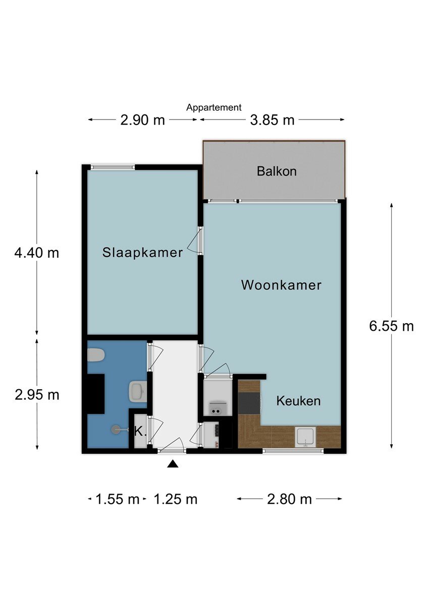 • woon-/eetkamer (ca. 18 m2) met toegang tot het balkon (op zuidwest zijde)