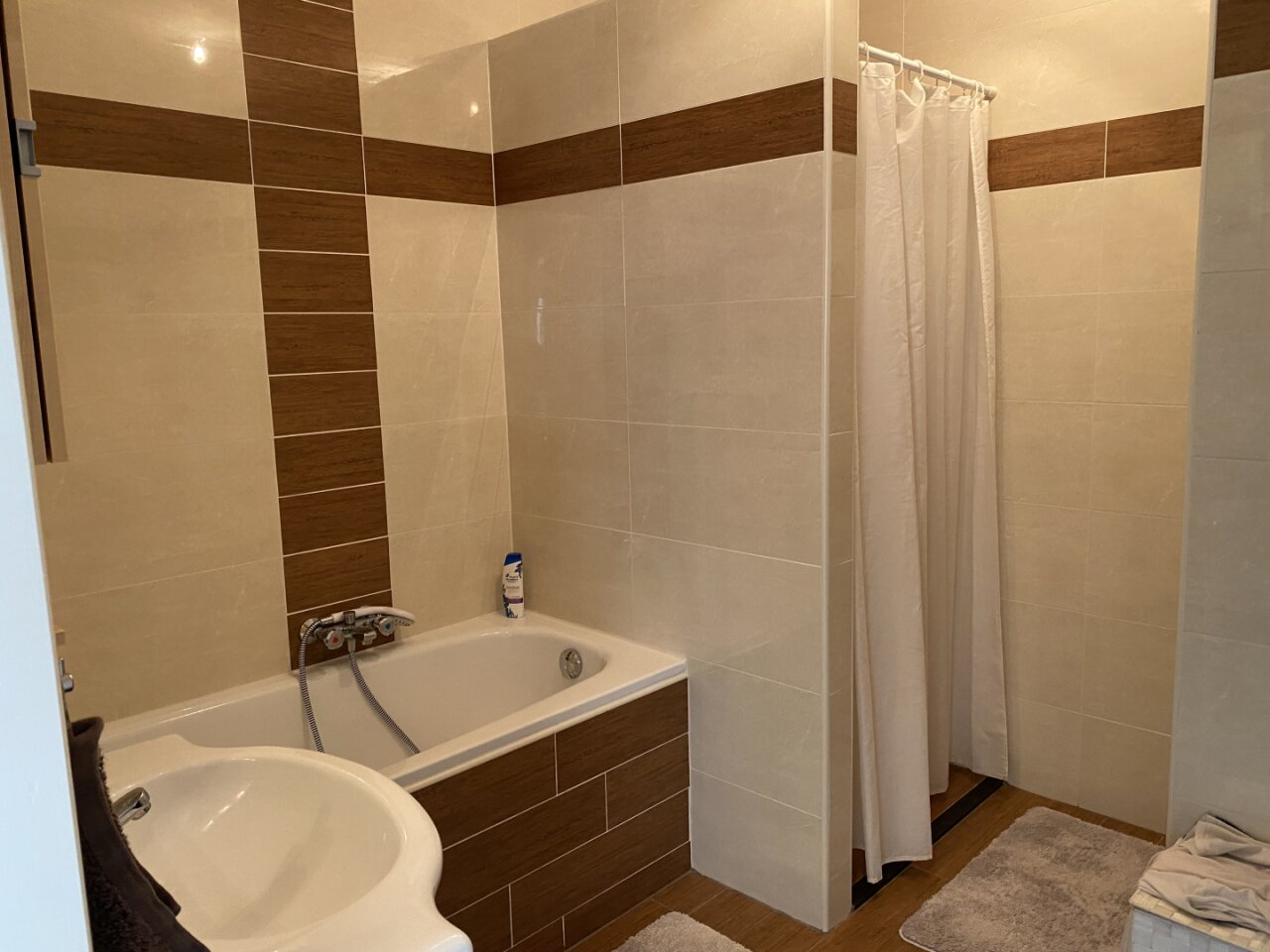 Moderne badkamer met ligbad, douche en wastafel, tevens is er een separate ruimte voor de wasmachine en droger.