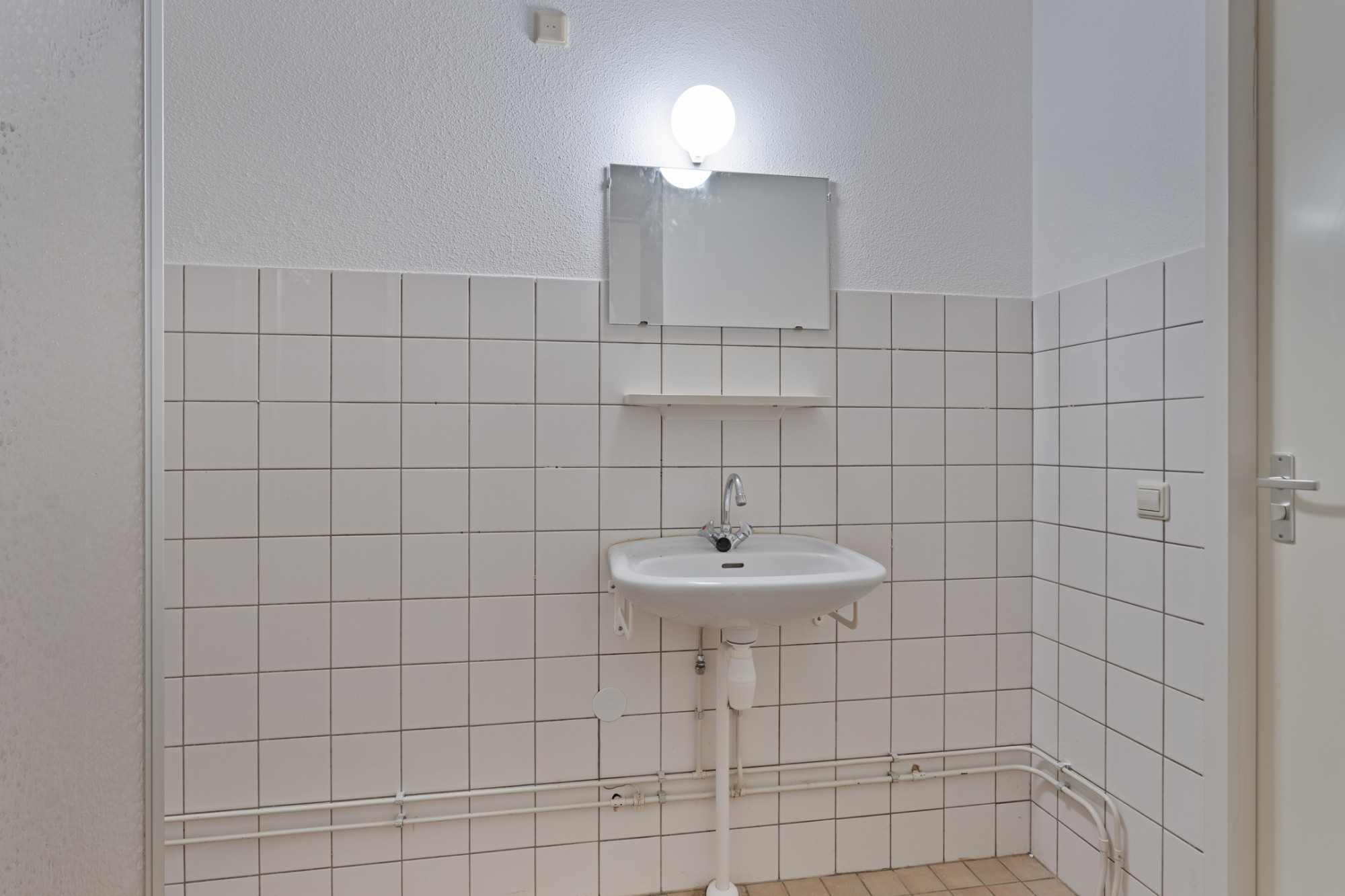 Deels badkamer (2.41 x 2.32 m) met douchecabine en vaste wastafel.