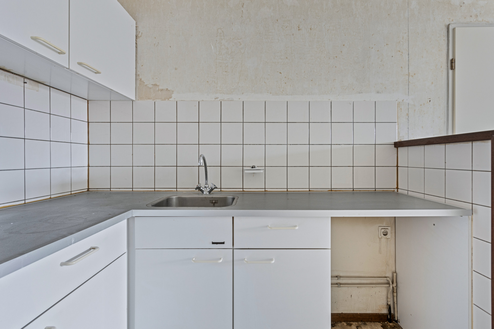Half-open keuken (3.27 x 2.15 m) met eenvoudig gedateerd keukenblok.