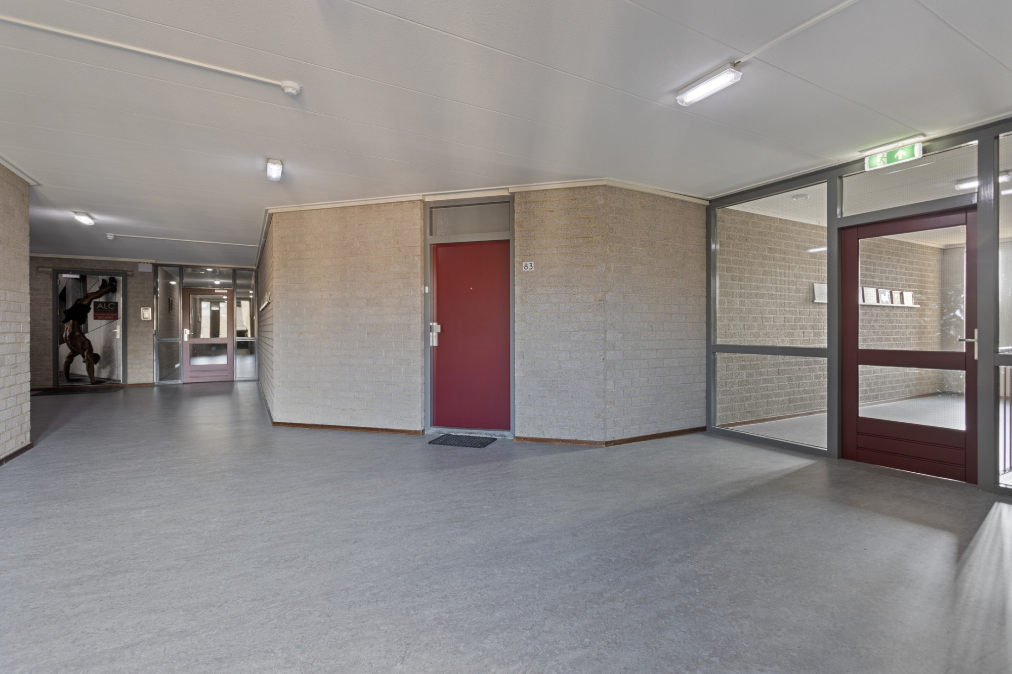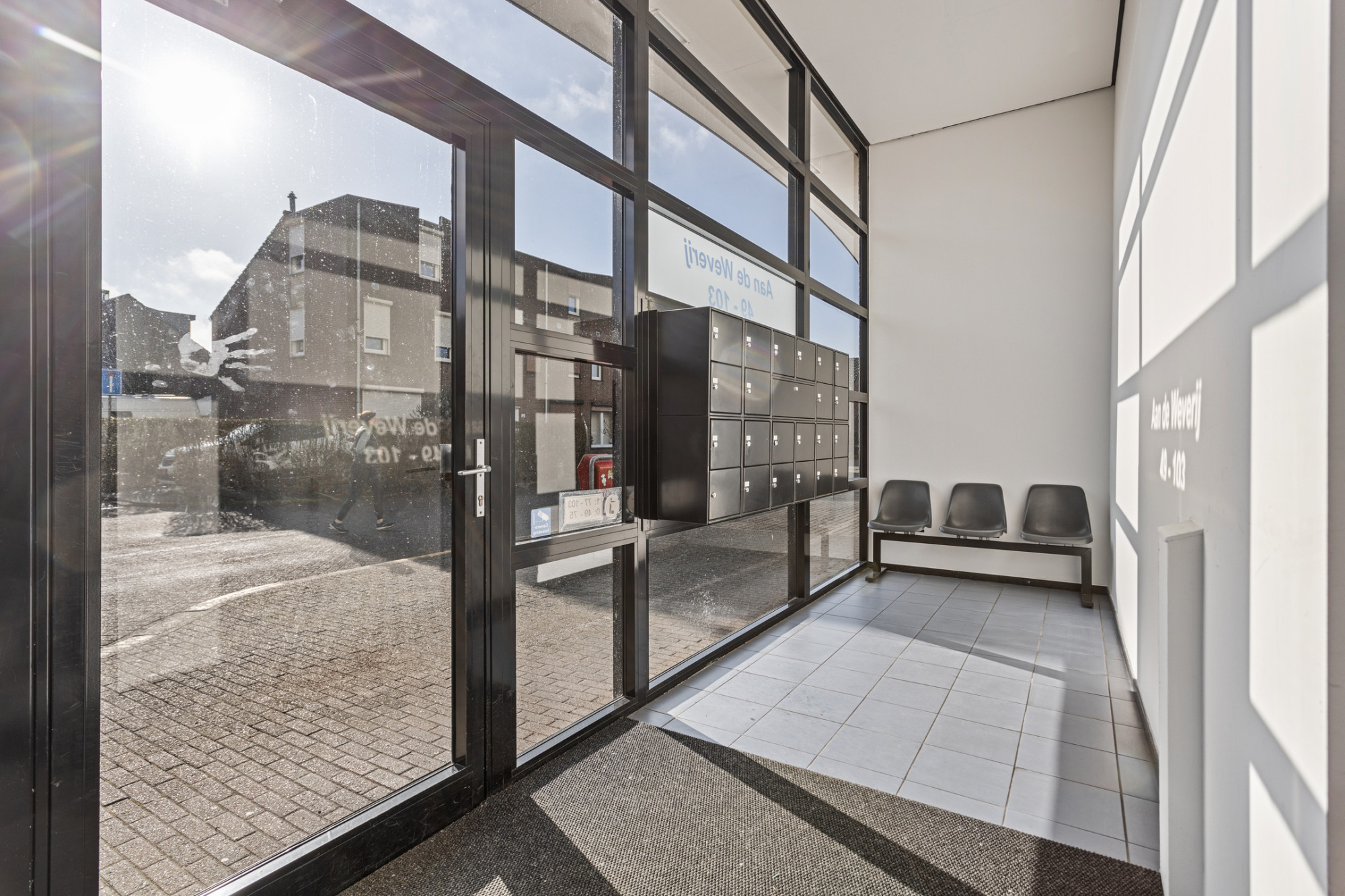 Representatieve ontvangst hal met brievenbussen en toegang naar trap portalen.